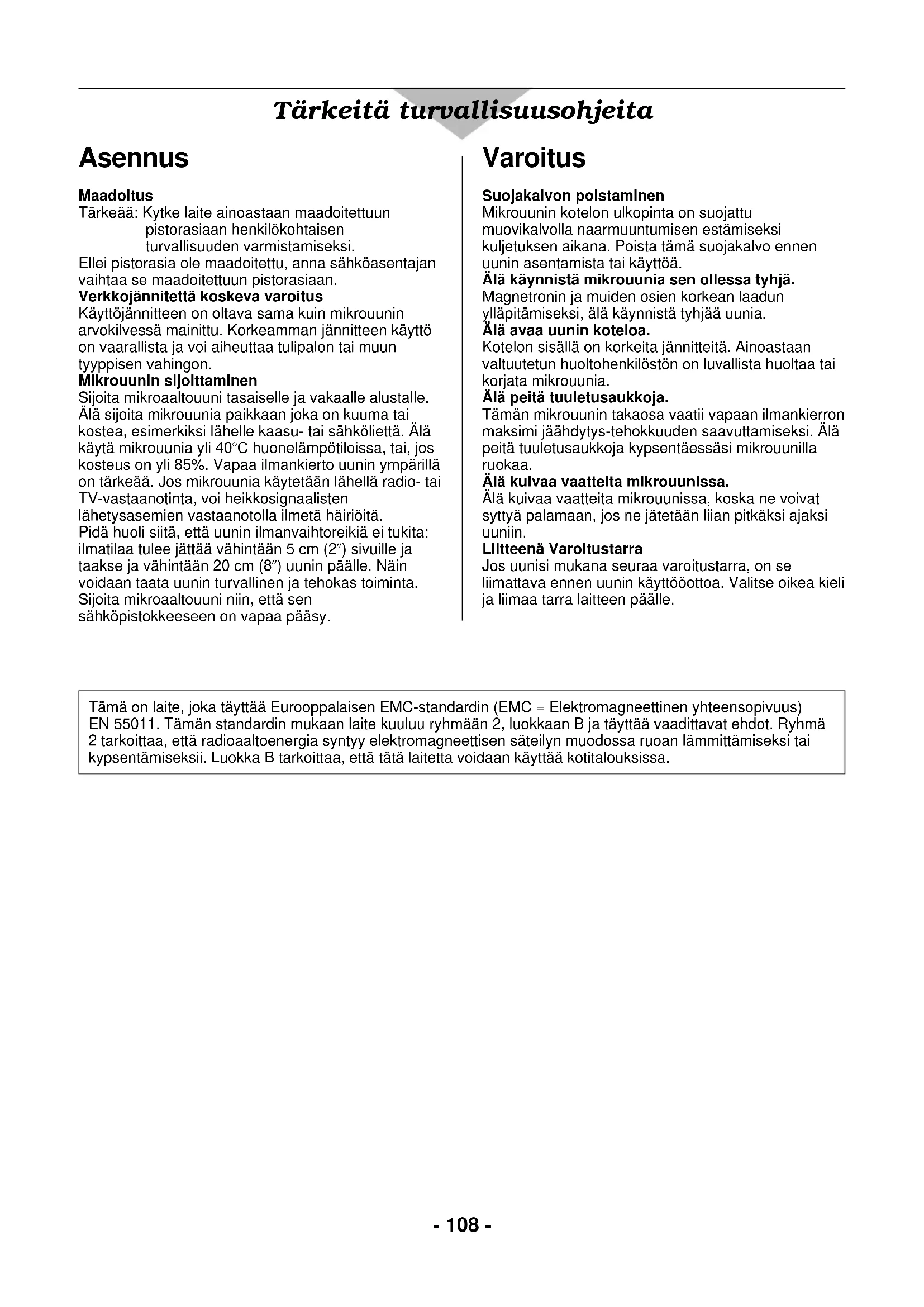 La matvarene stå en stund før du kontrollerer temperaturen eller serverer maten.- 108 - Asennus Maadoitus Tärkeää: Kytke laite ainoastaan maadoitettuun pistorasiaan henkilökohtaisen turvallisuuden varmistamiseksi. Ellei pistorasia ole maadoitettu, anna sähköasentajan vaihtaa se maadoitettuun pistorasiaan. Verkkojännitettä koskeva varoitus Käyttöjännitteen on oltava sama kuin mikrouunin arvokilvessä mainittu. Korkeamman jännitteen käyttö on vaarallista ja voi aiheuttaa tulipalon tai muun tyyppisen vahingon. Mikrouunin sijoittaminen Sijoita mikroaaltouuni tasaiselle ja vakaalle alustalle. Älä sijoita mikrouunia paikkaan joka on kuuma tai kostea, esimerkiksi lähelle kaasu- tai sähköliettä. Älä käytä mikrouunia yli 40oC huonelämpötiloissa, tai, jos kosteus on yli 85%. Vapaa ilmankierto uunin ympärillä on tärkeää. Jos mikrouunia käytetään lähellä radio- tai TV-vastaanotinta, voi heikkosignaalisten lähetysasemien vastaanotolla ilmetä häiriöitä. Pidä huoli siitä, että uunin ilmanvaihtoreikiä ei tukita: ilmatilaa tulee jättää vähintään 5 cm (2q) sivuille ja taakse ja vähintään 20 cm (8q) uunin päälle. Näin voidaan taata uunin turvallinen ja tehokas toiminta. Sijoita mikroaaltouuni niin, että sen sähköpistokkeeseen on vapaa pääsy. Tärkeitä turvallisuusohjeita Varoitus Suojakalvon poistaminen Mikrouunin kotelon ulkopinta on suojattu muovikalvolla naarmuuntumisen estämiseksi kuljetuksen aikana. Poista tämä suojakalvo ennen uunin asentamista tai käyttöä. Älä käynnistä mikrouunia sen ollessa tyhjä. Magnetronin ja muiden osien korkean laadun ylläpitämiseksi, älä käynnistä tyhjää uunia. Älä avaa uunin koteloa. Kotelon sisällä on korkeita jännitteitä. Ainoastaan valtuutetun huoltohenkilöstön on luvallista huoltaa tai korjata mikrouunia. Älä peitä tuuletusaukkoja. Tämän mikrouunin takaosa vaatii vapaan ilmankierron maksimi jäähdytys-tehokkuuden saavuttamiseksi. Älä peitä tuuletusaukkoja kypsentäessäsi mikrouunilla ruokaa. Älä kuivaa vaatteita mikrouunissa. Älä kuivaa vaatteita mikrouunissa, koska ne voivat syttyä palamaan, jos ne jätetään liian pitkäksi ajaksi uuniin. Liitteenä Varoitustarra Jos uunisi mukana seuraa varoitustarra, on se liimattava ennen uunin käyttööottoa. Valitse oikea kieli ja liimaa tarra laitteen päälle. Tämä on laite, joka täyttää Eurooppalaisen EMC-standardin (EMC = Elektromagneettinen yhteensopivuus) EN 55011. Tämän standardin mukaan laite kuuluu ryhmään 2, luokkaan B ja täyttää vaadittavat ehdot. Ryhmä 2 tarkoittaa, että radioaaltoenergia syntyy elektromagneettisen säteilyn muodossa ruoan lämmittämiseksi tai kypsentämiseksii. Luokka B tarkoittaa, että tätä laitetta voidaan käyttää kotitalouksissa.- 109 - Suomi Varoitus