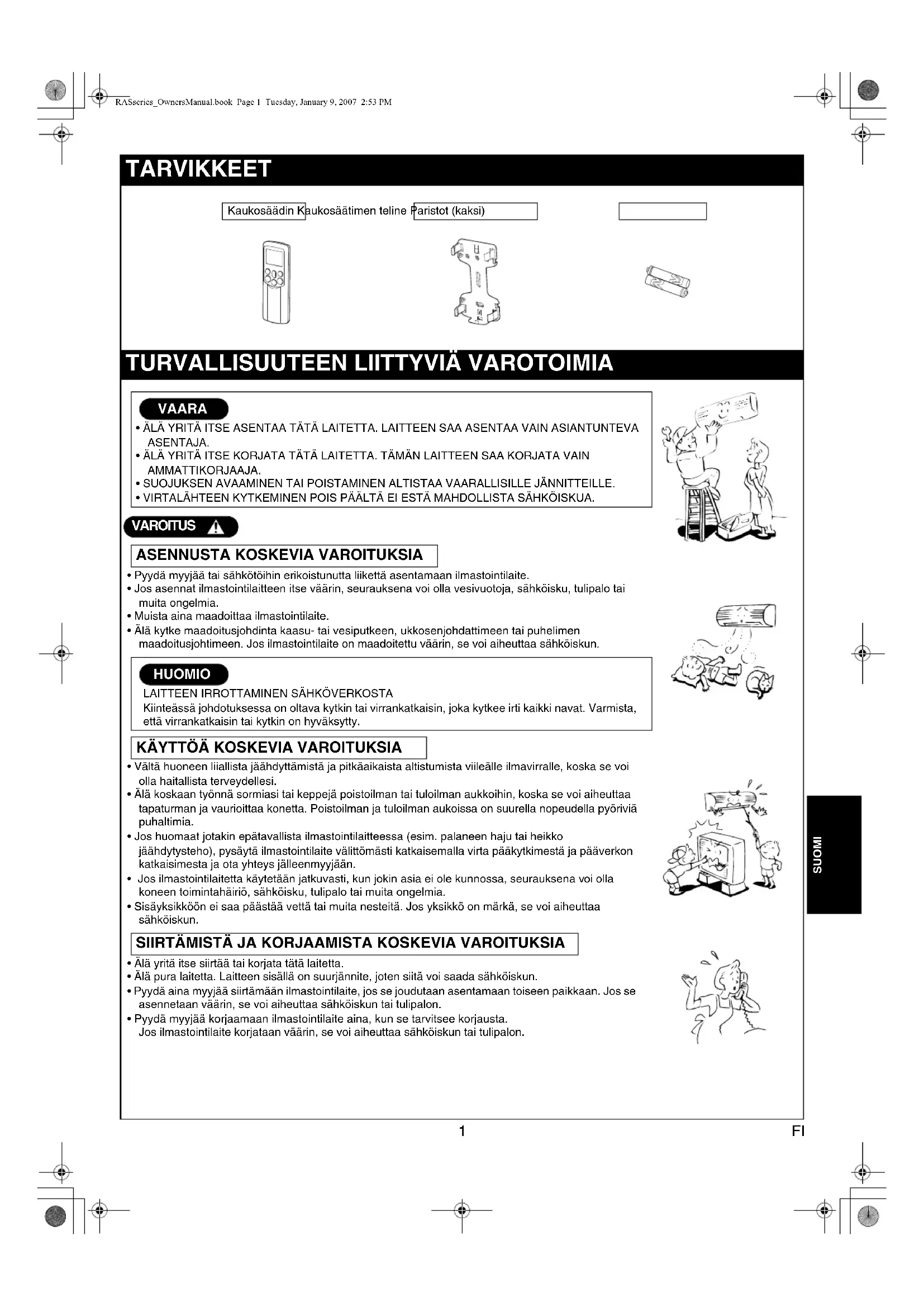 - Nukkumistila ei ole ajastintoiminto. Huoneen lämpötila, kun toiminta käynnistyy tai valitaan uudelleenJäähdytys Vain puhallin -toimintaLämmitys Kuva 1 Huoneen lämpötilaLämpötilan+1 asettaminenLämpötilan asettaminenLämpötilan–1 asettaminenRASseries_OwnersManual.book Page 18 Tuesday, January 9, 2007 2:53 PM19 FI SUOMI Pidä huoneen lämpötila miellyttävällä tasolla Puhdista ilmansuodattimet Tukkeutuneet ilmansuodattimet heikentävät ilmastointilaitteen toimintaa. Puhdista ne kahden viikon välein. Älä koskaan avaa ovia ja ikkunoita enempää kuin tarpeen Älä koskaan avaa ikkunoita ja ovia enempää kuin tarpeen, jotta viileä tai lämmin ilma pysyisi huoneessa. Ikkunaverhot Sulje verhot jäähdytyksen aikana, jotta huoneeseen ei pääse suoraa auringonvaloa. Sulje verhot lämmityksen aikana, jotta lämpö pysyy sisällä. Käytä ajastinta tehokkaasti Aseta ajastin halutulle toiminta-ajalle. Mahdollista huoneilman tasainen kierto Säädä ilmavirran suunta niin, että huoneilma kiertää tasaisesti. Väliaikainen käyttö Tämän toiminnon avulla laitetta voidaan käyttää väliaikaisesti, jos kaukosäädin on hävinnyt tai sen paristot ovat loppuneet.