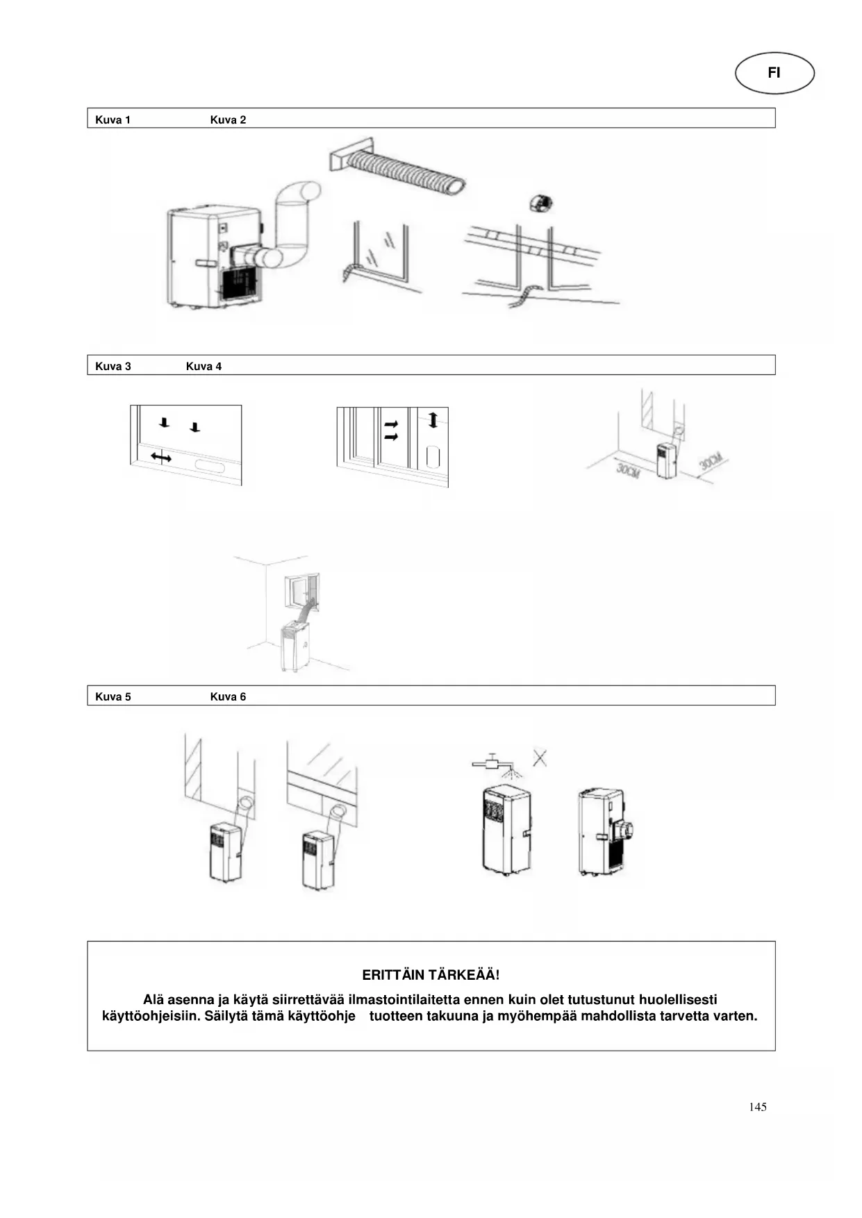 ERITTÄIN TÄRKEÄÄ! Alä asenna ja käytä siirrettävää ilmastointilaitetta ennen kuin olet tutustunut huolellisesti käyttöohjeisiin. Säilytä tämä käyttöohje tuotteen takuuna ja myöhempää mahdollista tarvetta varten.