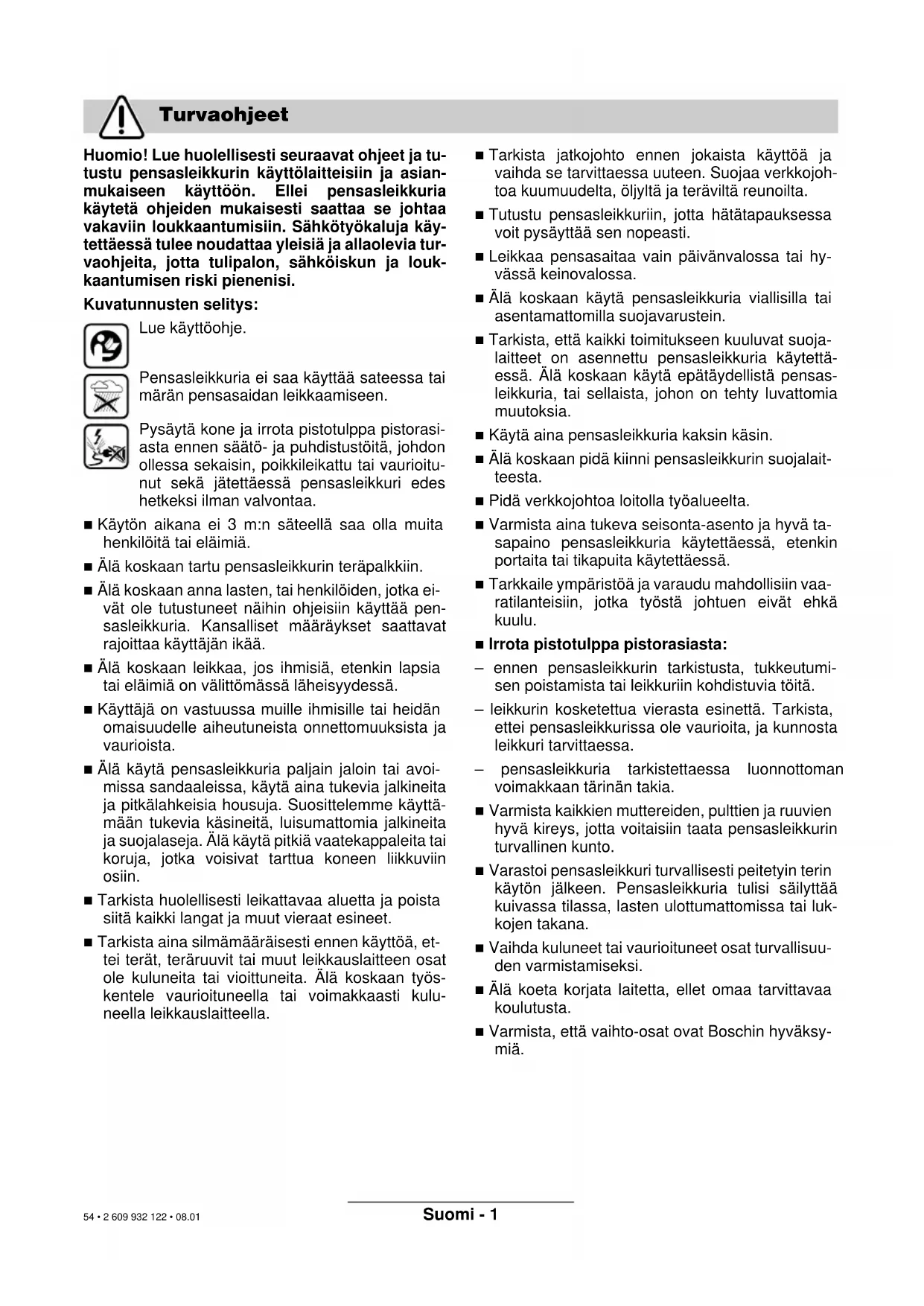 er la- vere enn 96 dB (A) AHS 40/48/55/60/65, 98 dB (A) AHS 6000/7000. Bedømmelsesmetode for samsvar se vedlegg V. Leinfelden, 01.08.2001. Dr. Gerhard Felten Dr. Eckerhard Strötgen Robert Bosch GmbH, Geschäftsbereich Elektrowerkzeuge Rett til endringer forbeholdes Garanti Miljøvern Service og kundekonsulent Samsvarserklæring 53 • 2 609 932 122 • 08.01Suomi - 1 Huomio! Lue huolellisesti seuraavat ohjeet ja tu- tustu pensasleikkurin käyttölaitteisiin ja asian- mukaiseen käyttöön. Ellei pensasleikkuria käytetä ohjeiden mukaisesti saattaa se johtaa vakaviin loukkaantumisiin. Sähkötyökaluja käy- tettäessä tulee noudattaa yleisiä ja allaolevia tur- vaohjeita, jotta tulipalon, sähköiskun ja louk- kaantumisen riski pienenisi. Kuvatunnusten selitys: Lue käyttöohje. Pensasleikkuria ei saa käyttää sateessa tai märän pensasaidan leikkaamiseen. Pysäytä kone ja irrota pistotulppa pistorasi- asta ennen säätö- ja puhdistustöitä, johdon ollessa sekaisin, poikkileikattu tai vaurioitu- nut sekä jätettäessä pensasleikkuri edes hetkeksi ilman valvontaa. ■ Käytön aikana ei 3 m:n säteellä saa olla muita henkilöitä tai eläimiä. ■ Älä koskaan tartu pensasleikkurin teräpalkkiin. ■ Älä koskaan anna lasten, tai henkilöiden, jotka ei- vät ole tutustuneet näihin ohjeisiin käyttää pen- sasleikkuria. Kansalliset määräykset saattavat rajoittaa käyttäjän ikää. ■ Älä koskaan leikkaa, jos ihmisiä, etenkin lapsia tai eläimiä on välittömässä läheisyydessä. ■ Käyttäjä on vastuussa muille ihmisille tai heidän omaisuudelle aiheutuneista onnettomuuksista ja vaurioista. ■ Älä käytä pensasleikkuria paljain jaloin tai avoi- missa sandaaleissa, käytä aina tukevia jalkineita ja pitkälahkeisia housuja. Suosittelemme käyttä- mään tukevia käsineitä, luisumattomia jalkineita ja suojalaseja. Älä käytä pitkiä vaatekappaleita tai koruja, jotka voisivat tarttua koneen liikkuviin osiin. ■ Tarkista huolellisesti leikattavaa aluetta ja poista siitä kaikki langat ja muut vieraat esineet. ■ Tarkista aina silmämääräisesti ennen käyttöä, et- tei terät, teräruuvit tai muut leikkauslaitteen osat ole kuluneita tai vioittuneita. Älä koskaan työs- kentele vaurioituneella tai voimakkaasti kulu- neella leikkauslaitteella. ■ Tarkista jatkojohto ennen jokaista käyttöä ja vaihda se tarvittaessa uuteen. Suojaa verkkojoh- toa kuumuudelta, öljyltä ja teräviltä reunoilta. ■ Tutustu pensasleikkuriin, jotta hätätapauksessa voit pysäyttää sen nopeasti. ■ Leikkaa pensasaitaa vain päivänvalossa tai hy- vässä keinovalossa. ■ Älä koskaan käytä pensasleikkuria viallisilla tai asentamattomilla suojavarustein. ■ Tarkista, että kaikki toimitukseen kuuluvat suoja- laitteet on asennettu pensasleikkuria käytettä- essä. Älä koskaan käytä epätäydellistä pensas- leikkuria, tai sellaista, johon on tehty luvattomia muutoksia. ■ Käytä aina pensasleikkuria kaksin käsin. ■ Älä koskaan pidä kiinni pensasleikkurin suojalait- teesta. ■ Pidä verkkojohtoa loitolla työalueelta. ■ Varmista aina tukeva seisonta-asento ja hyvä ta- sapaino pensasleikkuria käytettäessä, etenkin portaita tai tikapuita käytettäessä. ■ Tarkkaile ympäristöä ja varaudu mahdollisiin vaa- ratilanteisiin, jotka työstä johtuen eivät ehkä kuulu. ■ Irrota pistotulppa pistorasiasta: – ennen pensasleikkurin tarkistusta, tukkeutumi- sen poistamista tai leikkuriin kohdistuvia töitä. – leikkurin kosketettua vierasta esinettä. Tarkista, ettei pensasleikkurissa ole vaurioita, ja kunnosta leikkuri tarvittaessa. – pensasleikkuria tarkistettaessa luonnottoman voimakkaan tärinän takia. ■ Varmista kaikkien muttereiden, pulttien ja ruuvien hyvä kireys, jotta voitaisiin taata pensasleikkurin turvallinen kunto. ■ Varastoi pensasleikkuri turvallisesti peitetyin terin käytön jälkeen. Pensasleikkuria tulisi säilyttää kuivassa tilassa, lasten ulottumattomissa tai luk- kojen takana. ■ Vaihda kuluneet tai vaurioituneet osat turvallisuu- den varmistamiseksi. ■ Älä koeta korjata laitetta, ellet omaa tarvittavaa koulutusta. ■ Varmista, että vaihto-osat ovat Boschin hyväksy- miä. Turvaohjeet 54 • 2 609 932 122 • 08.01Suomi - 2 Pensasleikkuri AHS 40 - 24 AHS 48 - 24 AHS 55 - 24S AHS 60 - 24S Tilausnumero 0 600 845 0.. 0 600 845 1.. 0 600 845 2.. 0 600 845 4.. Ottoteho 500 W 500 W 550 W 550 W Tyhjäkäyntiiskuluku 1400 min