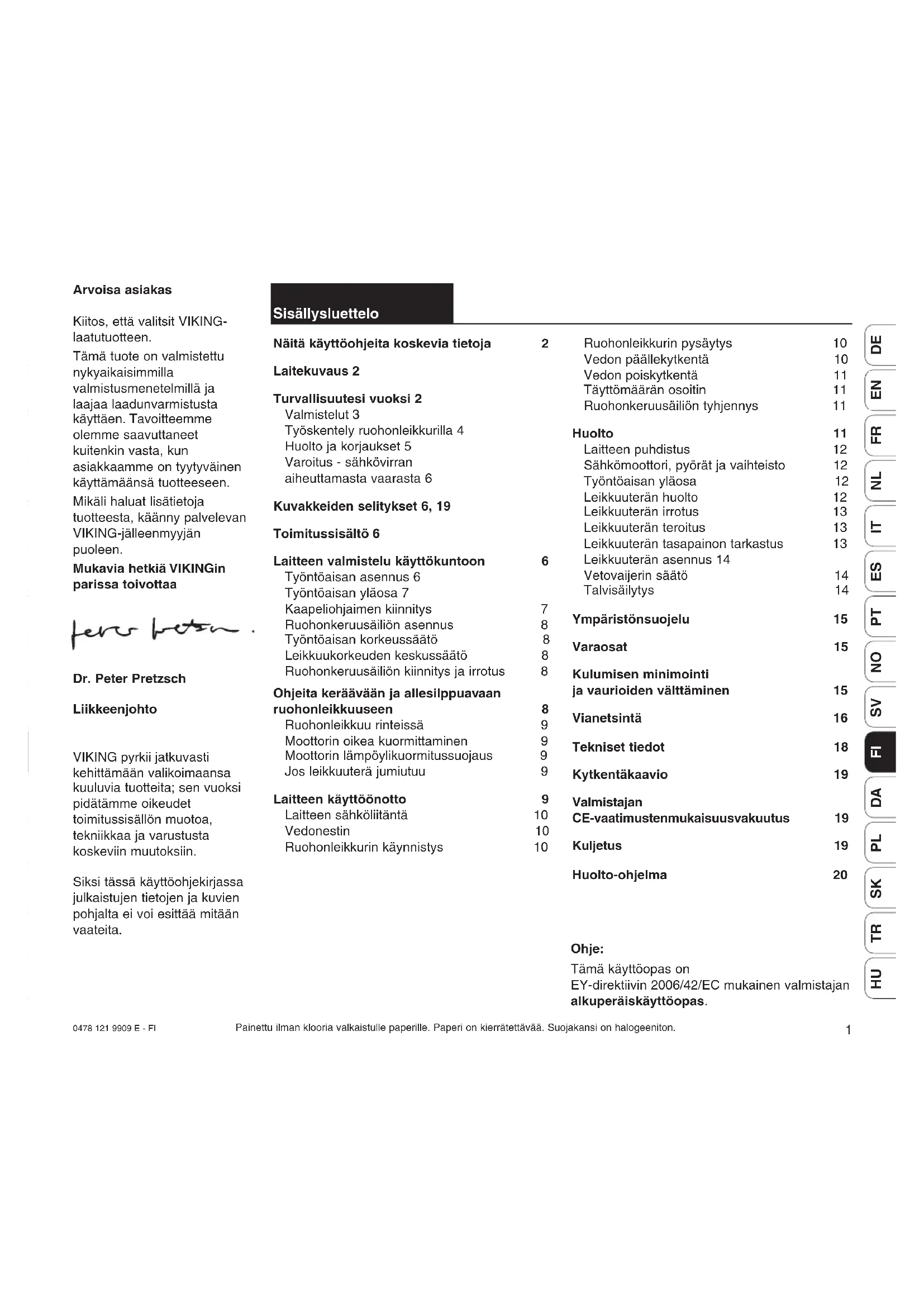 - Noudata alueellisia määräyksiä laitetta kuljetettaessa, ennen kaikkea niitä jotka koskevat kuorman turvallisuutta ja esineiden kuljettamista lavoilla. 0478_121_9909_e:0478_121_9909_e 05.12.2012 15:13 Seite 1920 0478 121 9909 E - FI Huolto-ohjelma Malli: ME Sarjanumero: Seuraava huolto Päiväys: Luovutus Päiväys: VIKING-liikkeen leima Päiväys: VIKING-liikkeen leima Seuraava huolto Päiväys: Päiväys: VIKING-liikkeen leima Seuraava huolto Päiväys: Päiväys: VIKING-liikkeen leima Seuraava huolto Päiväys: Päiväys: VIKING-liikkeen leima Seuraava huolto Päiväys: Päiväys: VIKING-liikkeen leima Seuraava huolto Päiväys: Päiväys: VIKING-liikkeen leima Seuraava huolto Päiväys: Anna tämä käyttöopas VIKING- liikkeeseen, kun teetät VIKING- tuotteesi huoltotöitä. VIKING-liike vahvistaa kohtaan “Huolto-ohjelma”, että ohjeenmukaiset huoltotyöt on suoritettu asianmukaisesti. 0478_121_9909_e:0478_121_9909_e 05.12.2012 15:13 Seite 200478 121 9909 E - DA