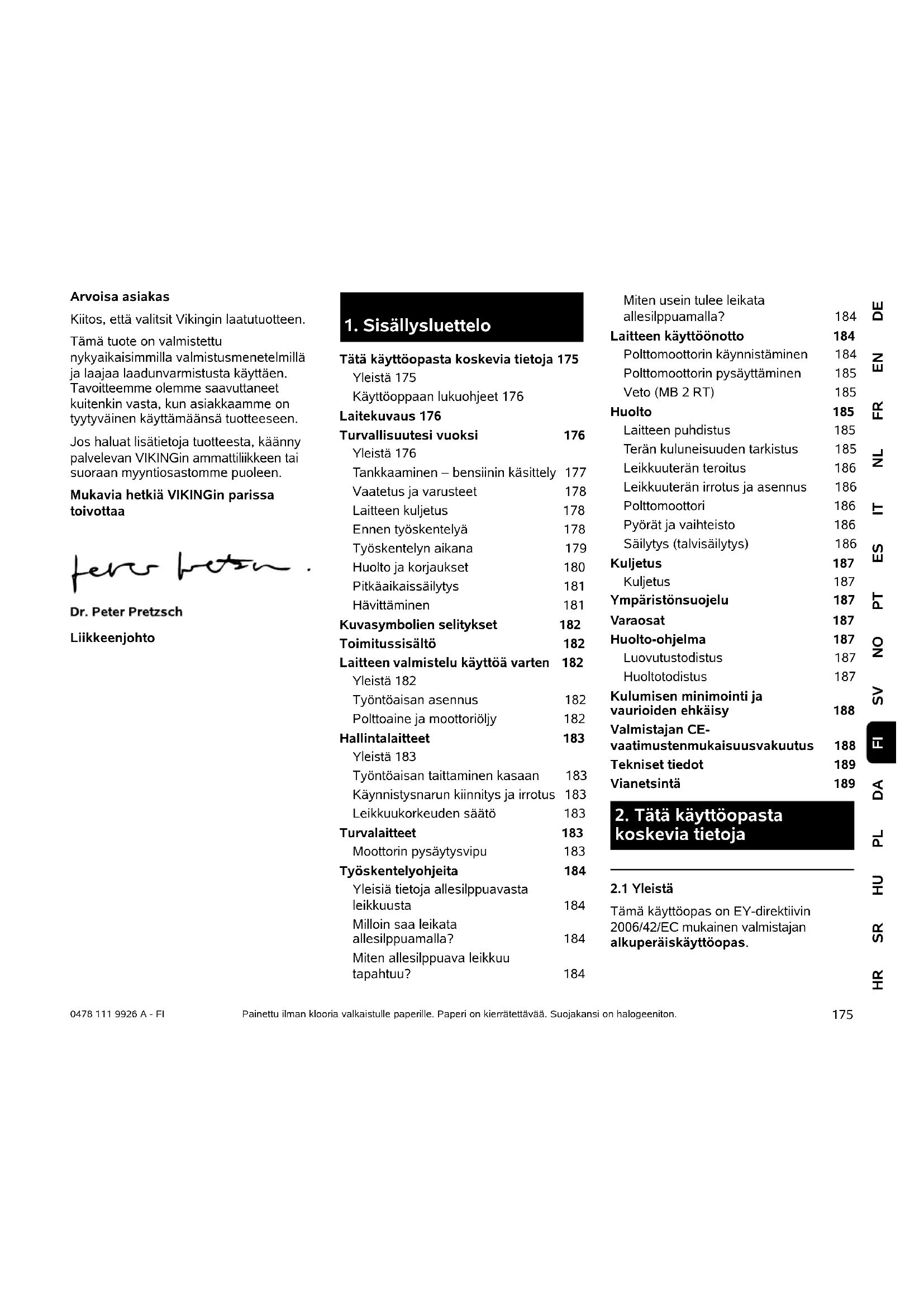 Tätä käyttöopasta koskevia tietoja 175 Yleistä 175 Käyttöoppaan lukuohjeet 176 Laitekuvaus 176 Turvallisuutesi vuoksi 176 Yleistä 176 Tankkaaminen – bensiinin käsittely 177 Vaatetus ja varusteet 178 Laitteen kuljetus 178 Ennen työskentelyä 178 Työskentelyn aikana 179 Huolto ja korjaukset 180 Pitkäaikaissäilytys 181 Hävittäminen 181 Kuvasymbolien selitykset 182 Toimitussisältö 182 Laitteen valmistelu käyttöä varten 182 Yleistä 182 Työntöaisan asennus 182 Polttoaine ja moottoriöljy 182 Hallintalaitteet 183 Yleistä 183 Työntöaisan taittaminen kasaan 183 Käynnistysnarun kiinnitys ja irrotus 183 Leikkuukorkeuden säätö 183 Turvalaitteet 183 Moottorin pysäytysvipu 183 Työskentelyohjeita 184 Yleisiä tietoja allesilppuavasta leikkuusta 184 Milloin saa leikata allesilppuamalla? 184 Miten allesilppuava leikkuu tapahtuu? 184 Miten usein tulee leikata allesilppuamalla? 184 Laitteen käyttöönotto 184 Polttomoottorin käynnistäminen 184 Polttomoottorin pysäyttäminen 185 Veto (MB 2 RT) 185 Huolto 185 Laitteen puhdistus 185 Terän kuluneisuuden tarkistus 185 Leikkuuterän teroitus 186 Leikkuuterän irrotus ja asennus 186 Polttomoottori 186 Pyörät ja vaihteisto 186 Säilytys (talvisäilytys) 186 Kuljetus 187 Kuljetus 187 Ympäristönsuojelu 187 Varaosat 187 Huolto-ohjelma 187 Luovutustodistus 187 Huoltotodistus 187 Kulumisen minimointi ja vaurioiden ehkäisy 188 Valmistajan CE- vaatimustenmukaisuusvakuutus 188 Tekniset tiedot 189 Vianetsintä 189
