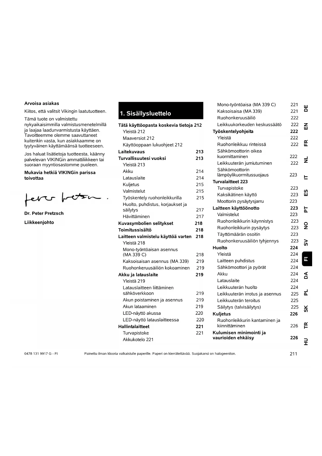 DEENFRNLITESPTNOSVDAPLSKTRHU FI 0478 131 9917 G - FI Arvoisa asiakas Kiitos, että valitsit Vikingin laatutuotteen. Tämä tuote on valmistettu nykyaikaisimmilla valmistusmenetelmillä ja laajaa laadunvarmistusta käyttäen. Tavoitteemme olemme saavuttaneet kuitenkin vasta, kun asiakkaamme on tyytyväinen käyttämäänsä tuotteeseen. Jos haluat lisätietoja tuotteesta, käänny palvelevan VIKINGin ammattiliikkeen tai suoraan myyntiosastomme puoleen. Mukavia hetkiä VIKINGin parissa toivottaa Liikkeenjohto Painettu ilman klooria valkaistulle paperille. Paperi on kierrätettävää. Suojakansi on halogeeniton.