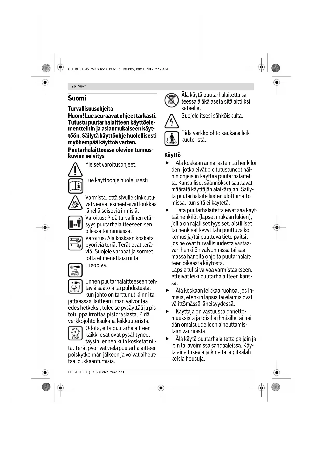 : suurin pituus 100 m Huomio: Jos käytät jatkojohtoa, on sii- nä – kuten turvaohjeissa on selostettu – oltava suojajohdin, joka pistotulpan kautta on yhteydessä verkon maadoi- tukseen. Kysy epävarmoissa tapauksissa sähkö- mieheltä tai lähimmästä Bosch-sopi- mushuollosta. VAROITUS: Sääntöjenvastaiset jatkojohdot saattavat olla vaaral- lisia. Jatkojohdon, pistotulpan ja liittimen tulee olla vesitiiviitä ul- kokäyttöön hyväksyttyä mallia. Johdon liitoskohtien tulee olla kuivat ei- vätkä ne saa maata maassa. Turvallisuuden parantamiseksi suosi- tellaan käyttämään FI-kytkintä (RCD), jonka vikavirta on korkeintaan 30 mA. Tämä FI-kytkin tulisi tarkistaa ennen jo- kaista käyttöä. Ohjeita tuotteille, joita ei myydä alu- eella GB: HUOMIO: Turvallisuutesi takia on vält- tämätöntä, että puutarhalaitteen pisto- tulppa kiinnitetään jatkojohtoon. Jat- kojohdon liitin on oltava roiskevesisuojattu, kumia tai kumipääl- lysteinen. Jatkojohdossa on oltava ve- donpoistin. On säännöllisesti tarkistettava, että lii- täntäjohdossa ei ole merkkejä vauriois- ta, ainoastaan moitteettomassa kun- nossa olevaa johtoa saa käyttää. Jos liitäntäjohto on vahingoittunut, sen saa korjata vain Bosch-sopimushuolto. Huolto Käytä aina puutarhakäsineitä, kun työskentelet terävien terien alueella. Varmista kaikkien muttereiden, pulttien ja ruuvien hyvä kiinnitys, jotta puutarhalaitteen turvallinen työkunto olisi taattu. Tarkista säännöllisesti ruohonko- koojasäiliön kunto ja kuluneisuus. Tarkista puutarhalaite ja vaihda var- muuden vuoksi kaikki loppuun kulu- neet tai vaurioituneet osat uusiin. Käytä ainoastaan puutarhalaittee- seen tarkoitettuja leikkuuteriä. Varmista, että vaihto-osat ovat Bosch-tuotantoa. Varmista ennen puutarhalaitteen va- rastointia, että se on puhdas eikä sii- nä ole leikkuujäännöksiä. Puhdista tarvittaessa pehmeällä kuivalla har- jalla. Tunnusmerkit Seuraavat tunnusmerkit ovat tärkeitä käyttöohjeen lukemi- sessa ja ymmärtämisessä. Paina mieleesi tunnusmerkit ja nii- den merkitys. Tunnusmerkkien oikea tulkinta auttaa sinua käyttämään puutarhalaitettasi paremmin ja turvallisemmin. Tunnusmerkki Merkitys Liikesuunta Reaktiosuunta Käytä suojakäsineitä Paino Käynnistys OBJ_BUCH-1919-004.book Page 79 Tuesday, July 1, 2014 9:57 AM80 | Suomi F 016 L81 153 | (1.7.14) Bosch Power Tools Määräyksenmukainen käyttö Puutarhalaite on tarkoitettu ruohonleikkuun yksityisalueella. Tekniset tiedot Melu-/tärinätiedot Poiskytkentä Sallittu käsittely Kielletty menettely Lisälaitteet/varaosat Tunnusmerkki Merkitys Ruohonleikkuri Rotak 33/Rotak 34 Rotak 34 M/Rotak 1300-34 R Rotak 36/Rotak 37 Rotak 37 M/Rotak 1400-37 R Tuotenumero 3 600 HA4 0.. 3 600 HA4 1.. Ottoteho W 1300 1400 Terän leveys cm 34 37 Leikkuukorkeus mm 20 – 70 20 –70 Kokoojasäiliön tilavuus l4040 Paino vastaa EPTA-Procedure 01/2003 kg 11,6 11,7 Suojausluokka /II /II Sarjanumero katso sarjanumero puutarhalaitteen tyyppikilvestä Tiedot koskevat 230V nimellisjännitettä [U]. Poikkeavilla jännitteillä ja maakohtaisissa malleissa nämä tiedot voivat vaihdella. Ota huomioon puutarhalaitteesi mallikilvessä oleva tuotenumero. Yksittäisten puutarhalaitteiden kauppanimitys saattaa vaihdella. Ruohonleikkuri Rotak 39/Rotak 40 Rotak 40 M/Rotak 1700-40 R Rotak 42/Rotak 43 Rotak 43 M/Rotak 1800-43 R Tuotenumero 3 600 HA4 2.. 3 600 HA4 3.. Ottoteho W 1700 1800 Terän leveys cm 40 43 Leikkuukorkeus mm 20 – 70 20 –70 Kokoojasäiliön tilavuus l5050 Paino vastaa EPTA-Procedure 01/2003 kg 13,1 13,2 Suojausluokka /II /II Sarjanumero katso sarjanumero puutarhalaitteen tyyppikilvestä Tiedot koskevat 230V nimellisjännitettä [U]. Poikkeavilla jännitteillä ja maakohtaisissa malleissa nämä tiedot voivat vaihdella. Ota huomioon puutarhalaitteesi mallikilvessä oleva tuotenumero. Yksittäisten puutarhalaitteiden kauppanimitys saattaa vaihdella. Melun mittausarvot on määritetty EN 60335-2-77 mukaan. 3 600 ... HA4 0.. HA4 1.. HA4 2.. HA4 3.. Laitteen tyypillinen A-painotettu melutaso on: Äänen painetaso Äänen tehotaso Epävarmuus K Käytä kuulonsuojaimia! dB(A) dB(A)