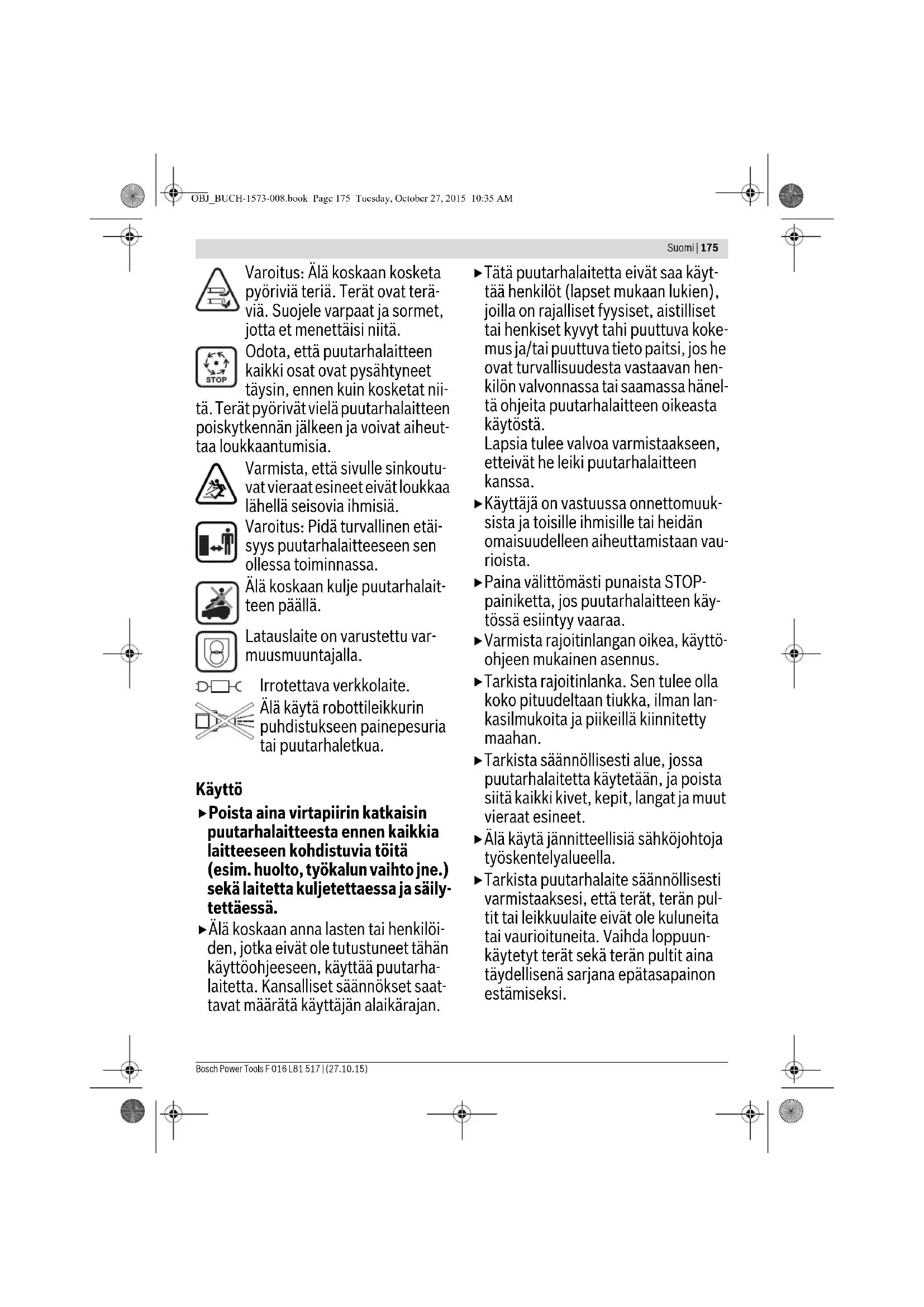*riippuen laitteen mallista **riippuu nurmikon muodosta ja monimutkaisuudesta (katso esimerkkejä kuva 3) ***riippuu leikkuukorkeudesta, ruohon laadusta ja kosteudesta Tiedot koskevat 230V nimellisjännitettä [U]. Poikkeavilla jännitteillä ja maakohtaisissa malleissa nämä tiedot voivat vaihdella. OBJ_BUCH-1573-008.book Page 179 Tuesday, October 27, 2015 10:35 AM180 | Suomi F 016 L81 517 | (27.10.15) Bosch Power Tools Melu-/tärinätiedot Melun mittausarvot on määritetty EN 50636-2-107 mukaan. Laitteen tyypillinen A-painotettu melutaso on: äänen paineta- so 64 dB(A); äänen tehotaso 72 dB(A). Epävarmuus K=2,74 dB. Standardinmukaisuusvakuutus Vakuutamme yksin vastaavamme siitä, että kohdassa ”Tekni- set tiedot” selostettu tuote vastaa kaikkia direktiivien 2006/42/EY, 1999/5/EY (13.6.2016 asti), 2014/53/EU (alkaen 14.6.2016), 2000/14/EY, 2009/125/EY, 2011/65/EU asiaankuuluvia määräyksiä sekä niiden muutok- sia ja seuraavia standardeja: EN 60335-1:2012+A11:2014/ EN 50636-2-107:2015 (tuoteturvallisuus), EN 61558-1:2005+A1:2009/ EN 61558-2-16:2009+A1:2013 (verkkolaitteiden turvalli- suus), EN 301 489-7 V1.3.1 (EMV ja ERM koskien GSM ja DCS), EN 301 511 V9.0.2 (olennaiset vaatimukset koskien GSM 900 ja GSM 1800), EN 55014-1:2006+A2:2011 (EMV häiriölähettimet), EN 55014-2:1997+A2:2008 (EMC häiriönsuoja). 2000/14/EY: Taattu äänen tehotaso 75 dB(A). Yhteensopivuuden arviointimenetelmä liitteen VI mukaan. Tuotelaji: 32 Nimetty asema 2000/14/EY: SRL, Sudbury, England, Nr. 1088 Tekninen tiedosto (2006/42/EY, 2000/14/EY): Bosch Lawn and Garden Ltd., PT-HG/ENS-PA2, Stowmarket, Suffolk IP14 1EY, England Robert Bosch GmbH, Power Tools Division 70764 Leinfelden-Echterdingen, GERMANY Leinfelden, 27.10.2015 Asennuskuvien selitys (katso sivut 3 – 14) Sähkönsyöttölaite Tuotenumero Sveitsi Englanti Muu Eurooppa Australia F 016 ... ... L69 117 ... L69 118 ... L69 116 ... L69 119 ... L69 117 ... L69 118 ... L69 116 ... L69 119 ... L69 117 ... L69 118 ... L69 116 ... L69 119 ... L69 117 ... L69 118 ... L69 116 ... L69 119 ... L69 117 ... L69 118 ... L69 116 ... L69 119 ... L69 117 ... L69 118 ... L69 116 ... L69 119 Sisääntulojännite (vaihtojännite) V 220–240 220 – 240 220 – 240 220 – 240 220 – 240 220 –240 Suojausluokka /II /II /II /II /II /II Taajuus Hz 50/60 50/60 50/60 50/60 50/60 50/60 Ulostulojännite (tasajännite) V4242 42 42 42 42 Suojaus