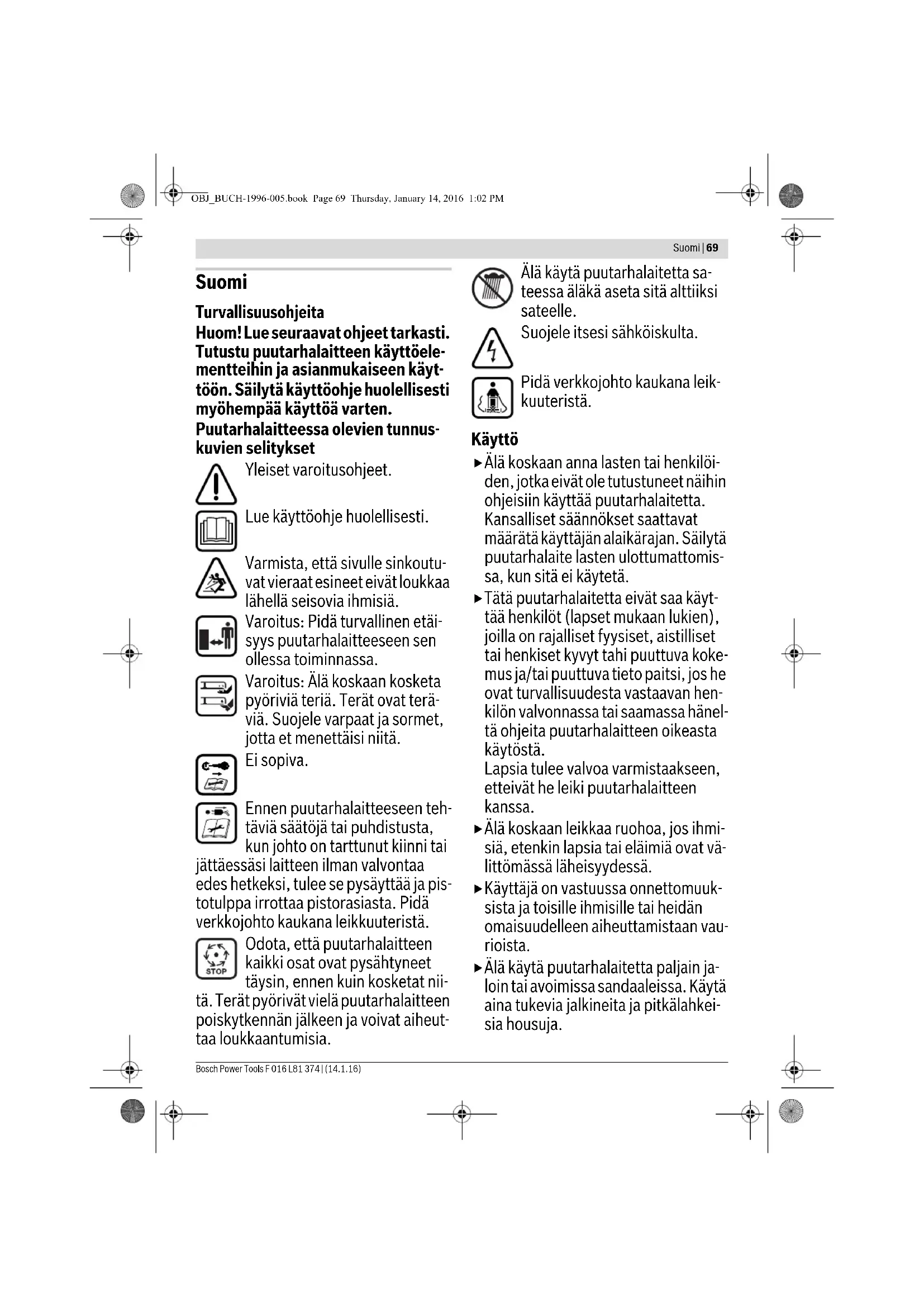 OBJ_BUCH-1996-005.book Page 67 Thursday, January 14, 2016 1:02 PM68 | Norsk F 016 L81 374 | (14.1.16) Bosch Power Tools Feilsøking Kundeservice og rådgivning ved bruk www.bosch-garden.com Ved alle forespørsler og reservedelsbestillinger må du oppgi det 10-sifrede produktnummeret som er angitt på hagered- skapets typeskilt. Norsk Robert Bosch AS Postboks 350 1402 Ski Tel.: 64 87 89 50 Faks: 64 87 89 55 Deponering Hageredskaper, tilbehøret og emballasjen må leveres inn til miljøvennlig gjenvinning. Hageredskaper må ikke kastes i vanlig søppel! Kun for EU-land: Jf. det europeiske direktivet 2012/19/EU vedr. gamle elektriske og elektroniske appa- rater og tilpassingen til nasjonale lover må gamle elektriske og elektroniske maskiner som ikke lenger kan brukes samles inn og le- veres inn til en miljøvennlig resirkulering. Rett til endringer forbeholdes. STOP Symptomer Mulig årsak Utbedring Motoren starter ikke Nettspenningen finnes ikke Sjekk og slå på Nett-stikkontakten er defekt Bruk en annen stikkkontakt Skjøteledningen er skadet Sjekk ledningen og skift den ut hvis den er ska- det Sikringen er utløst Utskifting av sikringen For høyt gress Innstill en større klippehøyde og vipp hagered- skapet for å redusere startbelastningen Motorvernet er utløst La motoren avkjøle og innstill større klippehøyder Hageredskapet går rykkvis Skjøteledningen er skadet Sjekk ledningen og skift den ut hvis den er skadet Interne kabelforbindelser i hageredskapet er defekt Ta kontakt med kundeservice Motorvernet er utløst La motoren avkjøle og innstill større klippehøyder Hageredskapet etterlater et uregelmessig klippebilde og/eller motoren går tungt For liten klippehøyde Innstill en høyere klippehøyde Kniven er butt Utskifting av kniven Tetting mulig Sjekk undersiden av hageredskapet og frigjør den eventuelt igjen (bruk alltid arbeidshan- sker) Kniven er galt montert Monter kniven riktig Etter innkopling av hagered- skapet dreier kniven seg ikke Knivene blokkeres av gressSlå av hageredskapet Fjern tettingen (bruk alltid arbeidshansker) Løs knivmutter/-skrue Trekk fast knivmutter/-skrue (17 Nm) Sterke vibrasjoner/lyder Løs knivmutter/-skrue Trekk fast knivmutter/-skrue (17 Nm) Skadet kniv Utskifting av kniven OBJ_BUCH-1996-005.book Page 68 Thursday, January 14, 2016 1:02 PMSuomi | 69 Bosch Power Tools F 016 L81 374 | (14.1.16) Suomi Turvallisuusohjeita Huom! Lue seuraavat ohjeet tarkasti. Tutustu puutarhalaitteen käyttöele- mentteihin ja asianmukaiseen käyt- töön. Säilytä käyttöohje huolellisesti myöhempää käyttöä varten. Puutarhalaitteessa olevien tunnus- kuvien selitykset Yleiset varoitusohjeet. Lue käyttöohje huolellisesti. Varmista, että sivulle sinkoutu- vat vieraat esineet eivät loukkaa lähellä seisovia ihmisiä. Varoitus: Pidä turvallinen etäi- syys puutarhalaitteeseen sen ollessa toiminnassa. Varoitus: Älä koskaan kosketa pyöriviä teriä. Terät ovat terä- viä. Suojele varpaat ja sormet, jotta et menettäisi niitä. Ei sopiva. Ennen puutarhalaitteeseen teh- täviä säätöjä tai puhdistusta, kun johto on tarttunut kiinni tai jättäessäsi laitteen ilman valvontaa edes hetkeksi, tulee se pysäyttää ja pis- totulppa irrottaa pistorasiasta. Pidä verkkojohto kaukana leikkuuteristä. Odota, että puutarhalaitteen kaikki osat ovat pysähtyneet täysin, ennen kuin kosketat nii- tä. Terät pyörivät vielä puutarhalaitteen poiskytkennän jälkeen ja voivat aiheut- taa loukkaantumisia. Älä käytä puutarhalaitetta sa- teessa äläkä aseta sitä alttiiksi sateelle. Suojele itsesi sähköiskulta. Pidä verkkojohto kaukana leik- kuuteristä. Käyttö Älä koskaan anna lasten tai henkilöi- den, jotka eivät ole tutustuneet näihin ohjeisiin käyttää puutarhalaitetta. Kansalliset säännökset saattavat määrätä käyttäjän alaikärajan. Säilytä puutarhalaite lasten ulottumattomis- sa, kun sitä ei käytetä. Tätä puutarhalaitetta eivät saa käyt- tää henkilöt (lapset mukaan lukien), joilla on rajalliset fyysiset, aistilliset tai henkiset kyvyt tahi puuttuva koke- mus ja/tai puuttuva tieto paitsi, jos he ovat turvallisuudesta vastaavan hen- kilön valvonnassa tai saamassa hänel- tä ohjeita puutarhalaitteen oikeasta käytöstä. Lapsia tulee valvoa varmistaakseen, etteivät he leiki puutarhalaitteen kanssa. Älä koskaan leikkaa ruohoa, jos ihmi- siä, etenkin lapsia tai eläimiä ovat vä- littömässä läheisyydessä. Käyttäjä on vastuussa onnettomuuk- sista ja toisille ihmisille tai heidän omaisuudelleen aiheuttamistaan vau- rioista. Älä käytä puutarhalaitetta paljain ja- loin tai avoimissa sandaaleissa. Käytä aina tukevia jalkineita ja pitkälahkei- sia housuja. OBJ_BUCH-1996-005.book Page 69 Thursday, January 14, 2016 1:02 PM70 | Suomi F 016 L81 374 | (14.1.16) Bosch Power Tools Tarkista perusteellisesti työstettävä alue ja poista siitä kivet, oksat, langat, luut ja muut vieraat esineet. Tarkista aina silmämääräisesti ennen käyttöä, etteivät terät, teränpultit tai leikkuriosa ole loppuun käytetyt tai vaurioituneet. Vaihda loppuunkäyte- tyt tai vaurioituneet terät sekä terän- pultit aina yhdessä epätasapainon es- tämiseksi. Käytä laitetta vain valoisaan aikaan tai hyvässä keinovalossa. Älä työskentele ruohonleikkurin kanssa huonoissa sääolosuhteissa, etenkin ukonilman lähestyessä. Vältä puutarhalaitteen käyttöä mä- rässä ruohossa. Kävele aina rauhallisesti, älä koskaan juokse. Älä koskaan käytä puutarhalaitetta, jos suojalaitteet tai suojukset ovat vi- allisia tai ilman turvalaitteita, kuten esimerkiksi silpunohjainta ja/tai ruo- honkokoojasäiliötä. Käytä kuulonsuojainta. Käyttö rinteessä saattaa olla vaa- rallista. – Älä koskaan leikkaa erityisen jyrkissä rinteissä. – Varmista aina kaltevalla pinnalla ja märässä ruohossa tukeva askellus. – Leikkaa kaltevissa pinnoissa poikit- tain rinteeseen nähden äläkä koskaan ylös- alas suunnassa. –