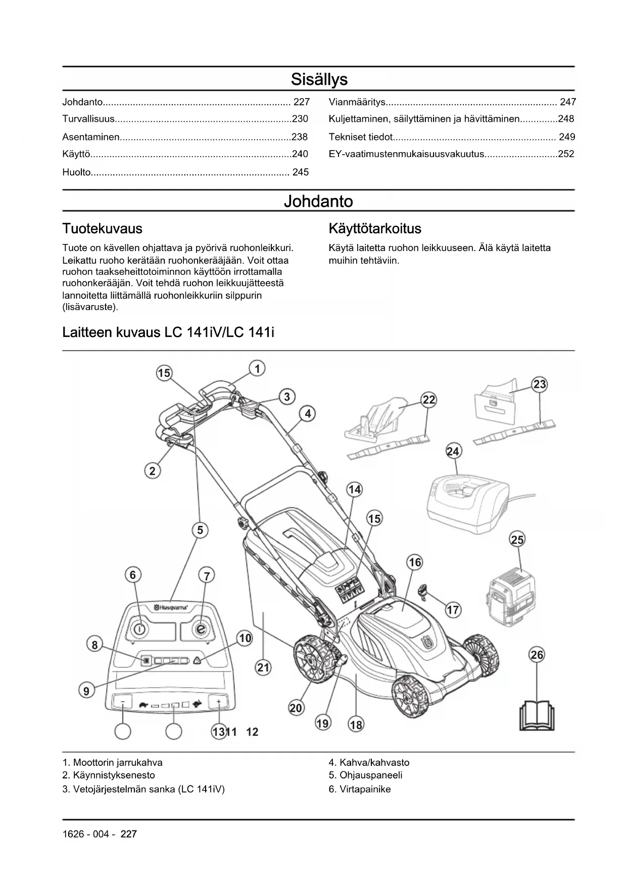 - EY-vaatimustenmukaisuusvakuutus Johdanto Tuotekuvaus Tuote on kävellen ohjattava ja pyörivä ruohonleikkuri. Leikattu ruoho kerätään ruohonkerääjään. Voit ottaa ruohon taakseheittotoiminnon käyttöön irrottamalla ruohonkerääjän. Voit tehdä ruohon leikkuujätteestä lannoitetta liittämällä ruohonleikkuriin silppurin (lisävaruste). Käyttötarkoitus Käytä laitetta ruohon leikkuuseen. Älä käytä laitetta muihin tehtäviin. Laitteen kuvaus LC 141iV/LC 141i p. 252