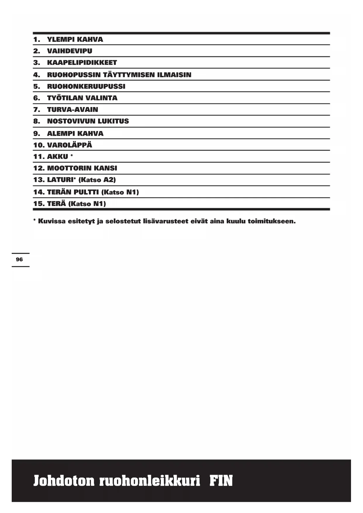 - Kuvissa esitetyt ja selostetut lisävarusteet eivät aina kuulu toimitukseen.97 Johdoton ruohonleikkuri FIN