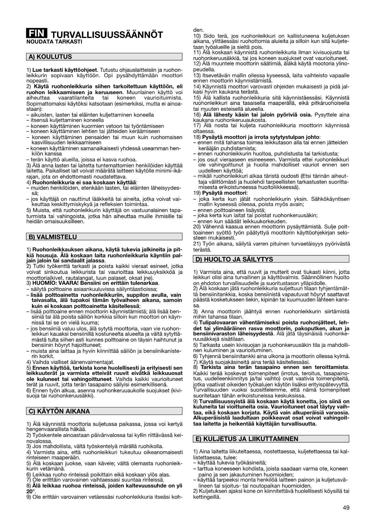 TURVALLISUUSSÄÄNNÖKSET - Ruohonleikkuria on käytet- tävä varovaisesti. Tämän vuoksi koneeseen on kiinnitetty kuva- merkkejä, jotka osoittavat tärkeimmät käyttöön liittyvät varoi- tukset. Niiden selitykset on esitetty seuraavassa. Me kehotam- FIN11 me sinua lukemaan erittäin tarkasti turvallisuussäännöt, jotka on annettu ohjekirjassa niille varatussa luvussa.