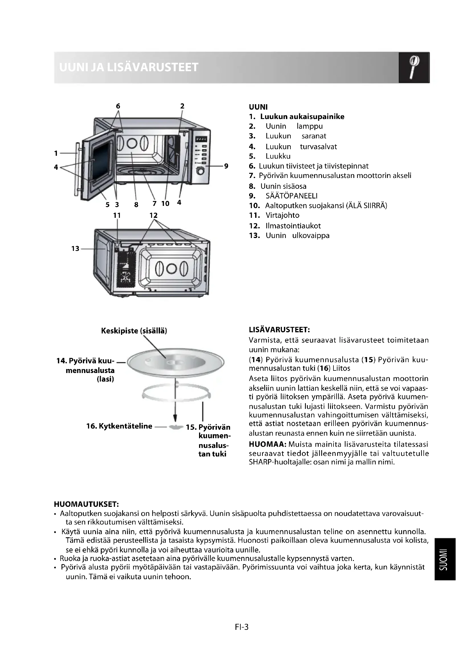 LISÄVARUSTEET: Varmista, että seuraavat lisävarusteet toimitetaan uunin mukana: (14) Pyörivä kuumennusalusta (15) Pyörivän kuu- mennusalustan tuki (16) Liitos Aseta liitos pyörivän kuumennusalustan moottorin akseliin uunin lattian keskellä niin, että se voi vapaas- ti pyöriä liitoksen ympärillä. Aseta pyörivä kuumen- nusalustan tuki lujasti liitokseen. Varmistu pyörivän kuumennusalustan vahingoittumisen välttämiseksi, että astiat nostetaan erilleen pyörivän kuumennus- alustan reunasta ennen kuin ne siirretään uunista. HUOMAA: Muista mainita lisävarusteita tilatessasi seuraavat tiedot jälleenmyyjälle tai valtuutetulle SHARP-huoltajalle: osan nimi ja mallin nimi. HUOMAUTUKSET: