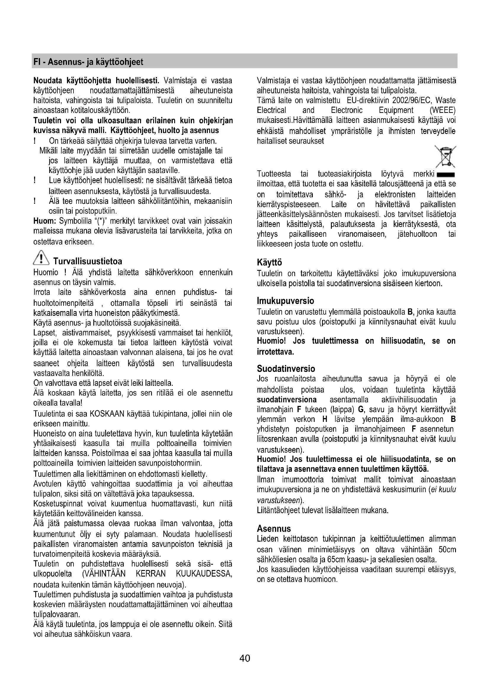 Käytä ainoastaan max 12V -20W – G4 halogeenilamppuja ja varo koskemasta niitä käsin.