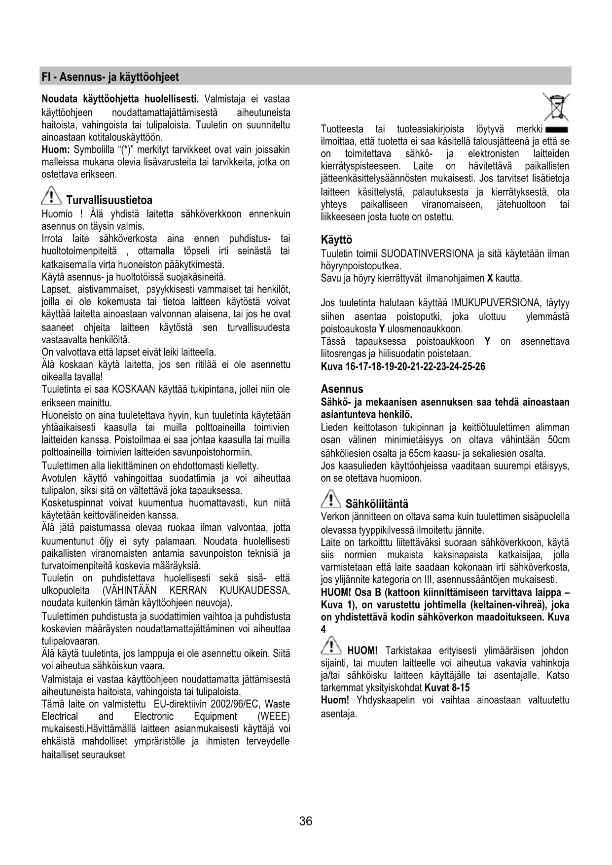 Alguns modelos prevêem lâmpadas laterais: Substituí-las por lâmpadas de forma idêntica com no máx. 40W (E14). Para acessar ao vão lâmpadas remover a cobertura A. Se a iluminação não funcionar, verifique se as lâmpadas foram instaladas corretamente no seu devido lugar antes de chamar a assistência técnica.36 FI - Asennus- ja käyttöohjeet Noudata käyttöohjetta huolellisesti. Valmistaja ei vastaa käyttöohjeen noudattamattajättämisestä aiheutuneista haitoista, vahingoista tai tulipaloista. Tuuletin on suunniteltu ainoastaan kotitalouskäyttöön. Huom: Symbolilla “(*)” merkityt tarvikkeet ovat vain joissakin malleissa mukana olevia lisävarusteita tai tarvikkeita, jotka on ostettava erikseen. Turvallisuustietoa Huomio ! Älä yhdistä laitetta sähköverkkoon ennenkuin asennus on täysin valmis. Irrota laite sähköverkosta aina ennen puhdistus- tai huoltotoimenpiteitä , ottamalla töpseli irti seinästä tai katkaisemalla virta huoneiston pääkytkimestä. Käytä asennus- ja huoltotöissä suojakäsineitä. Lapset, aistivammaiset, psyykkisesti vammaiset tai henkilöt, joilla ei ole kokemusta tai tietoa laitteen käytöstä voivat käyttää laitetta ainoastaan valvonnan alaisena, tai jos he ovat saaneet ohjeita laitteen käytöstä sen turvallisuudesta vastaavalta henkilöltä. On valvottava että lapset eivät leiki laitteella. Älä koskaan käytä laitetta, jos sen ritilää ei ole asennettu oikealla tavalla! Tuuletinta ei saa KOSKAAN käyttää tukipintana, jollei niin ole erikseen mainittu. Huoneisto on aina tuuletettava hyvin, kun tuuletinta käytetään yhtäaikaisesti kaasulla tai muilla polttoaineilla toimivien laitteiden kanssa. Poistoilmaa ei saa johtaa kaasulla tai muilla polttoaineilla toimivien laitteiden savunpoistohormiin. Tuulettimen alla liekittäminen on ehdottomasti kielletty. Avotulen käyttö vahingoittaa suodattimia ja voi aiheuttaa tulipalon, siksi sitä on vältettävä joka tapauksessa. Kosketuspinnat voivat kuumentua huomattavasti, kun niitä käytetään keittovälineiden kanssa. Älä jätä paistumassa olevaa ruokaa ilman valvontaa, jotta kuumentunut öljy ei syty palamaan. Noudata huolellisesti paikallisten viranomaisten antamia savunpoiston teknisiä ja turvatoimenpiteitä koskevia määräyksiä. Tuuletin on puhdistettava huolellisesti sekä sisä- että ulkopuolelta (VÄHINTÄÄN KERRAN KUUKAUDESSA, noudata kuitenkin tämän käyttöohjeen neuvoja). Tuulettimen puhdistusta ja suodattimien vaihtoa ja puhdistusta koskevien määräysten noudattamattajättäminen voi aiheuttaa tulipalovaaran. Älä käytä tuuletinta, jos lamppuja ei ole asennettu oikein. Siitä voi aiheutua sähköiskun vaara. Valmistaja ei vastaa käyttöohjeen noudattamatta jättämisestä aiheutuneista haitoista, vahingoista tai tulipaloista. Tämä laite on valmistettu EU-direktiivin 2002/96/EC, Waste Electrical and Electronic Equipment (WEEE) mukaisesti.Hävittämällä laitteen asianmukaisesti käyttäjä voi ehkäistä mahdolliset ympräristölle ja ihmisten terveydelle haitalliset seuraukset Tuotteesta tai tuoteasiakirjoista löytyvä merkki ilmoittaa, että tuotetta ei saa käsitellä talousjätteenä ja että se on toimitettava sähkö- ja elektronisten laitteiden kierrätyspisteeseen. Laite on hävitettävä paikallisten jätteenkäsittelysäännösten mukaisesti. Jos tarvitset lisätietoja laitteen käsittelystä, palautuksesta ja kierrätyksestä, ota yhteys paikalliseen viranomaiseen, jätehuoltoon tai liikkeeseen josta tuote on ostettu. Käyttö Tuuletin toimii SUODATINVERSIONA ja sitä käytetään ilman höyrynpoistoputkea. Savu ja höyry kierrättyvät ilmanohjaimen X kautta. Jos tuuletinta halutaan käyttää IMUKUPUVERSIONA, täytyy siihen asentaa poistoputki, joka ulottuu ylemmästä poistoaukosta Y ulosmenoaukkoon. Tässä tapauksessa poistoaukkoon Y on asennettava liitosrengas ja hiilisuodatin poistetaan. Kuva 16-17-18-19-20-21-22-23-24-25-26 Asennus Sähkö- ja mekaanisen asennuksen saa tehdä ainoastaan asiantunteva henkilö. Lieden keittotason tukipinnan ja keittiötuulettimen alimman osan välinen minimietäisyys on oltava vähintään 50cm sähköliesien osalta ja 65cm kaasu- ja sekaliesien osalta. Jos kaasulieden käyttöohjeissa vaaditaan suurempi etäisyys, on se otettava huomioon. Sähköliitäntä Verkon jännitteen on oltava sama kuin tuulettimen sisäpuolella olevassa tyyppikilvessä ilmoitettu jännite. Laite on tarkoitttu liitettäväksi suoraan sähköverkkoon, käytä siis normien mukaista kaksinapaista katkaisijaa, jolla varmistetaan että laite saadaan kokonaan irti sähköverkosta, jos ylijännite kategoria on III, asennussääntöjen mukaisesti. HUOM! Osa B (kattoon kiinnittämiseen tarvittava laippa – Kuva 1), on varustettu johtimella (keltainen-vihreä), joka on yhdistettävä kodin sähköverkon maadoitukseen. Kuva