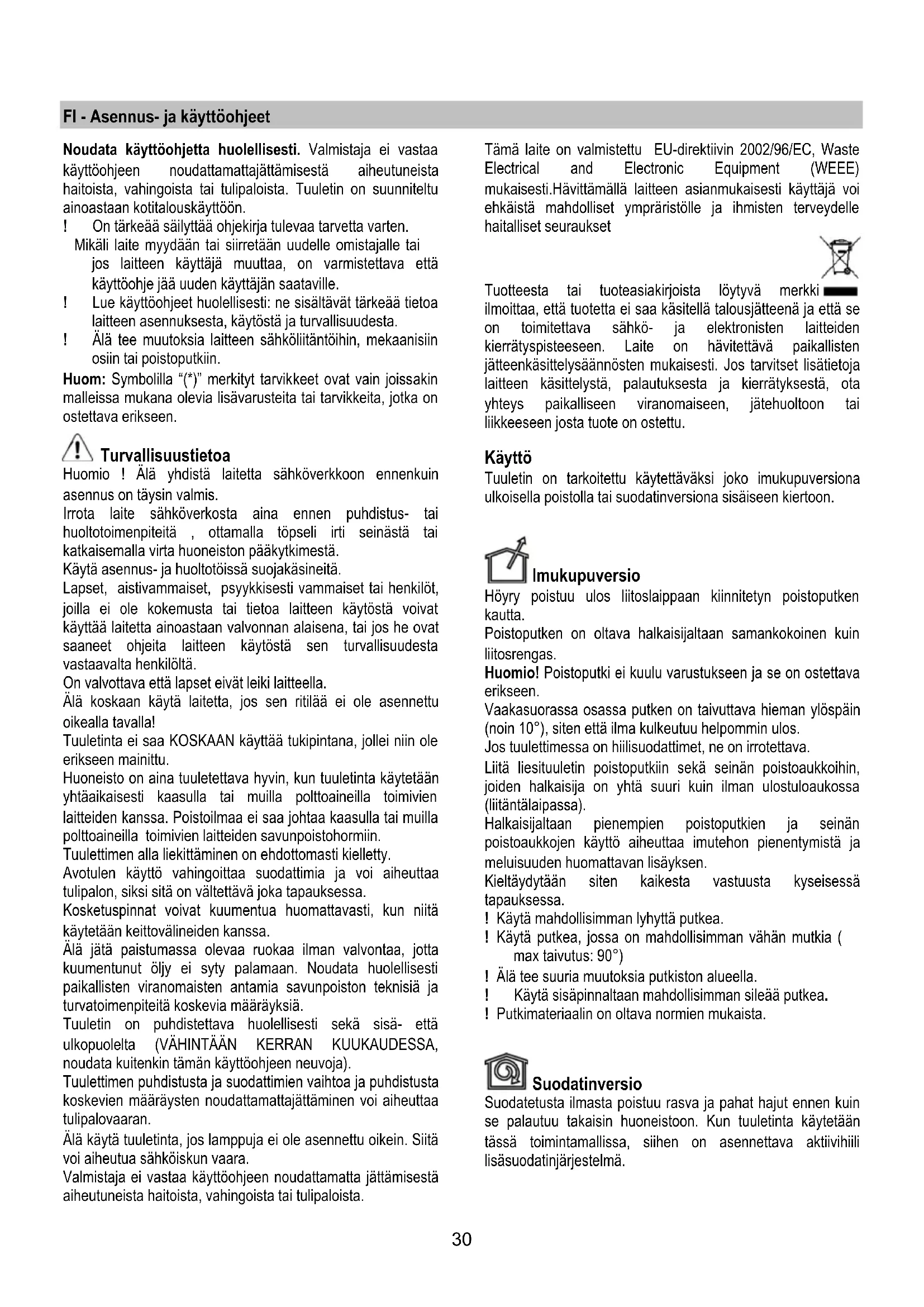 Se a iluminação não funcionar, verifique se as lâmpadas foram correctamente instaladas na sua sede antes de chamar a assistência técnica.30 FI - Asennus- ja käyttöohjeet Noudata käyttöohjetta huolellisesti. Valmistaja ei vastaa käyttöohjeen noudattamattajättämisestä aiheutuneista haitoista, vahingoista tai tulipaloista. Tuuletin on suunniteltu ainoastaan kotitalouskäyttöön. ! On tärkeää säilyttää ohjekirja tulevaa tarvetta varten. Mikäli laite myydään tai siirretään uudelle omistajalle tai jos laitteen käyttäjä muuttaa, on varmistettava että käyttöohje jää uuden käyttäjän saataville. ! Lue käyttöohjeet huolellisesti: ne sisältävät tärkeää tietoa laitteen asennuksesta, käytöstä ja turvallisuudesta. ! Älä tee muutoksia laitteen sähköliitäntöihin, mekaanisiin osiin tai poistoputkiin. Huom: Symbolilla “(*)” merkityt tarvikkeet ovat vain joissakin malleissa mukana olevia lisävarusteita tai tarvikkeita, jotka on ostettava erikseen. Turvallisuustietoa Huomio ! Älä yhdistä laitetta sähköverkkoon ennenkuin asennus on täysin valmis. Irrota laite sähköverkosta aina ennen puhdistus- tai huoltotoimenpiteitä , ottamalla töpseli irti seinästä tai katkaisemalla virta huoneiston pääkytkimestä. Käytä asennus- ja huoltotöissä suojakäsineitä. Lapset, aistivammaiset, psyykkisesti vammaiset tai henkilöt, joilla ei ole kokemusta tai tietoa laitteen käytöstä voivat käyttää laitetta ainoastaan valvonnan alaisena, tai jos he ovat saaneet ohjeita laitteen käytöstä sen turvallisuudesta vastaavalta henkilöltä. On valvottava että lapset eivät leiki laitteella. Älä koskaan käytä laitetta, jos sen ritilää ei ole asennettu oikealla tavalla! Tuuletinta ei saa KOSKAAN käyttää tukipintana, jollei niin ole erikseen mainittu. Huoneisto on aina tuuletettava hyvin, kun tuuletinta käytetään yhtäaikaisesti kaasulla tai muilla polttoaineilla toimivien laitteiden kanssa. Poistoilmaa ei saa johtaa kaasulla tai muilla polttoaineilla toimivien laitteiden savunpoistohormiin. Tuulettimen alla liekittäminen on ehdottomasti kielletty. Avotulen käyttö vahingoittaa suodattimia ja voi aiheuttaa tulipalon, siksi sitä on vältettävä joka tapauksessa. Kosketuspinnat voivat kuumentua huomattavasti, kun niitä käytetään keittovälineiden kanssa. Älä jätä paistumassa olevaa ruokaa ilman valvontaa, jotta kuumentunut öljy ei syty palamaan. Noudata huolellisesti paikallisten viranomaisten antamia savunpoiston teknisiä ja turvatoimenpiteitä koskevia määräyksiä. Tuuletin on puhdistettava huolellisesti sekä sisä- että ulkopuolelta (VÄHINTÄÄN KERRAN KUUKAUDESSA, noudata kuitenkin tämän käyttöohjeen neuvoja). Tuulettimen puhdistusta ja suodattimien vaihtoa ja puhdistusta koskevien määräysten noudattamattajättäminen voi aiheuttaa tulipalovaaran. Älä käytä tuuletinta, jos lamppuja ei ole asennettu oikein. Siitä voi aiheutua sähköiskun vaara. Valmistaja ei vastaa käyttöohjeen noudattamatta jättämisestä aiheutuneista haitoista, vahingoista tai tulipaloista. Tämä laite on valmistettu EU-direktiivin 2002/96/EC, Waste Electrical and Electronic Equipment (WEEE) mukaisesti.Hävittämällä laitteen asianmukaisesti käyttäjä voi ehkäistä mahdolliset ympräristölle ja ihmisten terveydelle haitalliset seuraukset Tuotteesta tai tuoteasiakirjoista löytyvä merkki ilmoittaa, että tuotetta ei saa käsitellä talousjätteenä ja että se on toimitettava sähkö- ja elektronisten laitteiden kierrätyspisteeseen. Laite on hävitettävä paikallisten jätteenkäsittelysäännösten mukaisesti. Jos tarvitset lisätietoja laitteen käsittelystä, palautuksesta ja kierrätyksestä, ota yhteys paikalliseen viranomaiseen, jätehuoltoon tai liikkeeseen josta tuote on ostettu. Käyttö Tuuletin on tarkoitettu käytettäväksi joko imukupuversiona ulkoisella poistolla tai suodatinversiona sisäiseen kiertoon. Imukupuversio Höyry poistuu ulos liitoslaippaan kiinnitetyn poistoputken kautta. Poistoputken on oltava halkaisijaltaan samankokoinen kuin liitosrengas. Huomio! Poistoputki ei kuulu varustukseen ja se on ostettava erikseen. Vaakasuorassa osassa putken on taivuttava hieman ylöspäin (noin 10°), siten että ilma kulkeutuu helpommin ulos. Jos tuulettimessa on hiilisuodattimet, ne on irrotettava. Liitä liesituuletin poistoputkiin sekä seinän poistoaukkoihin, joiden halkaisija on yhtä suuri kuin ilman ulostuloaukossa (liitäntälaipassa). Halkaisijaltaan pienempien poistoputkien ja seinän poistoaukkojen käyttö aiheuttaa imutehon pienentymistä ja meluisuuden huomattavan lisäyksen. Kieltäydytään siten kaikesta vastuusta kyseisessä tapauksessa. ! Käytä mahdollisimman lyhyttä putkea. ! Käytä putkea, jossa on mahdollisimman vähän mutkia ( max taivutus: 90°) ! Älä tee suuria muutoksia putkiston alueella. ! Käytä sisäpinnaltaan mahdollisimman sileää putkea. ! Putkimateriaalin on oltava normien mukaista. Suodatinversio Suodatetusta ilmasta poistuu rasva ja pahat hajut ennen kuin se palautuu takaisin huoneistoon. Kun tuuletinta käytetään tässä toimintamallissa, siihen on asennettava aktiivihiili lisäsuodatinjärjestelmä.31 Asennus Lieden keittotason tukipinnan ja keittiötuulettimen alimman osan välinen minimietäisyys on oltava vähintään 40cm sähköliesien osalta ja 65cm kaasu- ja sekaliesien osalta. Jos kaasulieden käyttöohjeissa vaaditaan suurempi etäisyys, on se otettava huomioon. Sähköliitäntä Verkon jännitteen on oltava sama kuin tuulettimen sisäpuolella olevassa tyyppikilvessä ilmoitettu jännite. Jos laitteessa on pistoke, liitä tuuletin voimassaolevien normien mukaiseen pistorasiaan, joka sijaitsee sellaisessa paikassa, että siihen pääsee käsiksi myös asennuksen jälkeen. Jos laitteessa ei ole pistoketta (suora liitos verkkoon) tai pistoke ei ole sellaisessa paikassa että siihen pääsee käsiksi myös asennuksen jälkeen, käytä normien mukaista kaksinapaist