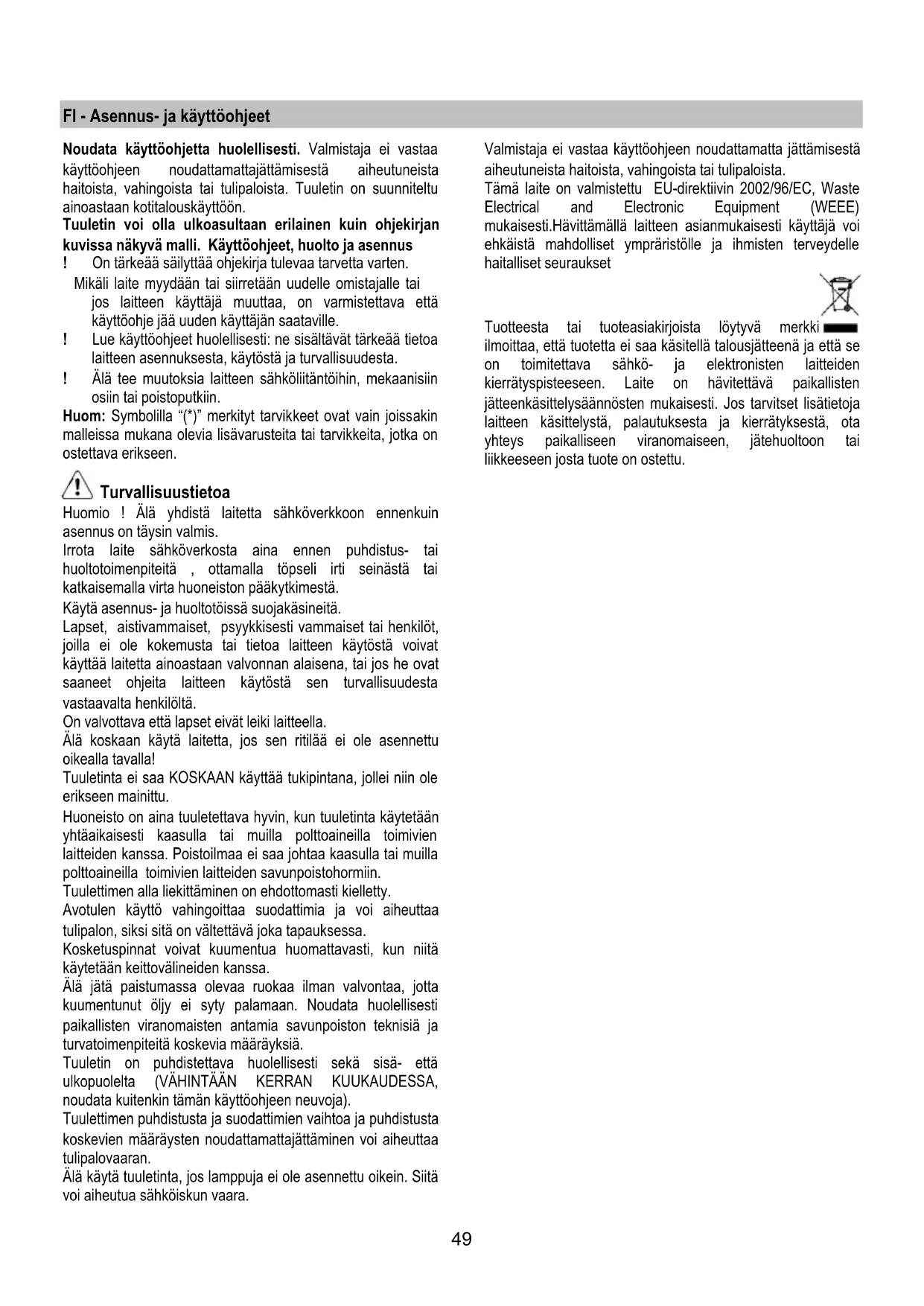 Se a iluminação não funcionar, verifique se as lâmpadas foram instaladas corretamente no seu devido lugar antes de chamar a assistência técnica.49 FI - Asennus- ja käyttöohjeet Noudata käyttöohjetta huolellisesti. Valmistaja ei vastaa käyttöohjeen noudattamattajättämisestä aiheutuneista haitoista, vahingoista tai tulipaloista. Tuuletin on suunniteltu ainoastaan kotitalouskäyttöön. Tuuletin voi olla ulkoasultaan erilainen kuin ohjekirjan kuvissa näkyvä malli. Käyttöohjeet, huolto ja asennus ! On tärkeää säilyttää ohjekirja tulevaa tarvetta varten. Mikäli laite myydään tai siirretään uudelle omistajalle tai jos laitteen käyttäjä muuttaa, on varmistettava että käyttöohje jää uuden käyttäjän saataville. ! Lue käyttöohjeet huolellisesti: ne sisältävät tärkeää tietoa laitteen asennuksesta, käytöstä ja turvallisuudesta. ! Älä tee muutoksia laitteen sähköliitäntöihin, mekaanisiin osiin tai poistoputkiin. Huom: Symbolilla “(*)” merkityt tarvikkeet ovat vain joissakin malleissa mukana olevia lisävarusteita tai tarvikkeita, jotka on ostettava erikseen. Turvallisuustietoa Huomio ! Älä yhdistä laitetta sähköverkkoon ennenkuin asennus on täysin valmis. Irrota laite sähköverkosta aina ennen puhdistus- tai huoltotoimenpiteitä , ottamalla töpseli irti seinästä tai katkaisemalla virta huoneiston pääkytkimestä. Käytä asennus- ja huoltotöissä suojakäsineitä. Lapset, aistivammaiset, psyykkisesti vammaiset tai henkilöt, joilla ei ole kokemusta tai tietoa laitteen käytöstä voivat käyttää laitetta ainoastaan valvonnan alaisena, tai jos he ovat saaneet ohjeita laitteen käytöstä sen turvallisuudesta vastaavalta henkilöltä. On valvottava että lapset eivät leiki laitteella. Älä koskaan käytä laitetta, jos sen ritilää ei ole asennettu oikealla tavalla! Tuuletinta ei saa KOSKAAN käyttää tukipintana, jollei niin ole erikseen mainittu. Huoneisto on aina tuuletettava hyvin, kun tuuletinta käytetään yhtäaikaisesti kaasulla tai muilla polttoaineilla toimivien laitteiden kanssa. Poistoilmaa ei saa johtaa kaasulla tai muilla polttoaineilla toimivien laitteiden savunpoistohormiin. Tuulettimen alla liekittäminen on ehdottomasti kielletty. Avotulen käyttö vahingoittaa suodattimia ja voi aiheuttaa tulipalon, siksi sitä on vältettävä joka tapauksessa. Kosketuspinnat voivat kuumentua huomattavasti, kun niitä käytetään keittovälineiden kanssa. Älä jätä paistumassa olevaa ruokaa ilman valvontaa, jotta kuumentunut öljy ei syty palamaan. Noudata huolellisesti paikallisten viranomaisten antamia savunpoiston teknisiä ja turvatoimenpiteitä koskevia määräyksiä. Tuuletin on puhdistettava huolellisesti sekä sisä- että ulkopuolelta (VÄHINTÄÄN KERRAN KUUKAUDESSA, noudata kuitenkin tämän käyttöohjeen neuvoja). Tuulettimen puhdistusta ja suodattimien vaihtoa ja puhdistusta koskevien määräysten noudattamattajättäminen voi aiheuttaa tulipalovaaran. Älä käytä tuuletinta, jos lamppuja ei ole asennettu oikein. Siitä voi aiheutua sähköiskun vaara. Valmistaja ei vastaa käyttöohjeen noudattamatta jättämisestä aiheutuneista haitoista, vahingoista tai tulipaloista. Tämä laite on valmistettu EU-direktiivin 2002/96/EC, Waste Electrical and Electronic Equipment (WEEE) mukaisesti.Hävittämällä laitteen asianmukaisesti käyttäjä voi ehkäistä mahdolliset ympräristölle ja ihmisten terveydelle haitalliset seuraukset Tuotteesta tai tuoteasiakirjoista löytyvä merkki ilmoittaa, että tuotetta ei saa käsitellä talousjätteenä ja että se on toimitettava sähkö- ja elektronisten laitteiden kierrätyspisteeseen. Laite on hävitettävä paikallisten jätteenkäsittelysäännösten mukaisesti. Jos tarvitset lisätietoja laitteen käsittelystä, palautuksesta ja kierrätyksestä, ota yhteys paikalliseen viranomaiseen, jätehuoltoon tai liikkeeseen josta tuote on ostettu.50 Käyttö Tuuletin on tarkoitettu käytettäväksi joko imukupuversiona ulkoisella poistolla tai suodatinversiona sisäiseen kiertoon. Imukupuversio Höyry poistuu ulos liitoslaippaan kiinnitetyn poistoputken kautta. Poistoputken on oltava halkaisijaltaan samankokoinen kuin liitosrengas. Huomio! Poistoputki ei kuulu varustukseen ja se on ostettava erikseen. Vaakasuorassa osassa putken on taivuttava hieman ylöspäin (noin 10°), siten että ilma kulkeutuu helpommin ulos. Jos tuulettimessa on hiilisuodattimet, ne on irrotettava. Liitä liesituuletin poistoputkiin sekä seinän poistoaukkoihin, joiden halkaisija on yhtä suuri kuin ilman ulostuloaukossa (liitäntälaipassa). Halkaisijaltaan pienempien poistoputkien ja seinän poistoaukkojen käyttö aiheuttaa imutehon pienentymistä ja meluisuuden huomattavan lisäyksen. Kieltäydytään siten kaikesta vastuusta kyseisessä tapauksessa. ! Käytä mahdollisimman lyhyttä putkea. ! Käytä putkea, jossa on mahdollisimman vähän mutkia ( max taivutus: 90°) ! Älä tee suuria muutoksia putkiston alueella. ! Käytä sisäpinnaltaan mahdollisimman sileää putkea. ! Putkimateriaalin on oltava normien mukaista. Suodatinversio Suodatetusta ilmasta poistuu rasva ja pahat hajut ennen kuin se palautuu takaisin huoneistoon. Kun tuuletinta käytetään tässä toimintamallissa, siihen on asennettava aktiivihiili lisäsuodatinjärjestelmä. Ilman imumoottoria toimivat mallit toimivat ainoastaan imukupuversiona ja ne on yhdistettävä keskusimuriin (ei kuulu varustukseen). Liitäntäohjeet tulevat lisälaitteen mukana. Asennus Lieden keittotason tukipinnan ja keittiötuulettimen alimman osan välinen minimietäisyys on oltava vähintään 50cm sähköliesien osalta ja 65cm kaasu- ja sekaliesien osalta. Jos kaasulieden käyttöohjeissa vaaditaan suurempi etäisyys, on se otettava huomioon. Sähköliitäntä Verkon jännitteen on oltava sama kuin tuulettimen sisäpuolella olevassa tyyppikilvessä ilmoitettu jännite. Jos laitteessa on pistoke, liitä tuuletin voimassaolevien normien mukaisee