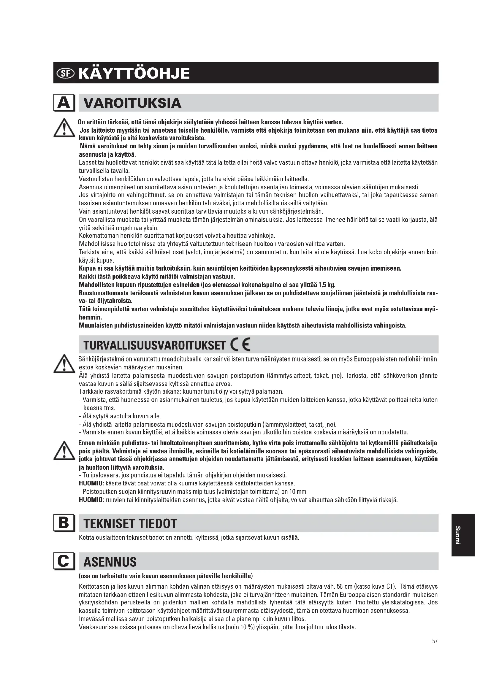 (osa on tarkoitettu vain kuvun asennukseen päteville henkilöille) Keittotason ja liesikuvun alimman kohdan välinen etäisyys on määräysten mukaisesti oltava väh. 56 cm (katso kuva C1). Tämä etäisyys mitataan tarkkaan ottaen liesikuvun alimmasta kohdasta, joka ei turvajännitteen mukainen. Tämän Eurooppalaisen standardin mukaisen yksityiskohdan perusteella on joidenkin mallien kohdalla mahdollista lyhentää tätä etäisyyttä kuten ilmoitettu yleiskatalogissa. Jos kaasulla toimivan keittotason käyttöohjeet määrittävät suuremmasta etäisyydestä, tämä on otettava huomioon asennuksessa. Imevässä mallissa savun poistoputken halkaisija ei saa olla pienempi kuin kuvun liitos. Vaakasuorissa osissa putkessa on oltava lievä kallistus (noin 10 %) ylöspäin, jotta ilma johtuu ulos tilasta. Suomi58 Vältä mutkia ja varmista, että putkien pituus on minimoitu. Noudata voimassa olevia ilman ulkoilmaan poistoa koskevia määräyksiä Jos käytössä on samanaikaisesti muita kaasulla tai muilla polttoaineilla toimivia laitteita (lämmityslaitteet, takat, uunit jne.), huolehdi tarvittavasta tuuletuksesta tilassa, jossa imu tapahtuu, voimassa olevien määräysten mukaisesti. Asennusohjeet: katso tämän käyttöoppaan osa “O”.