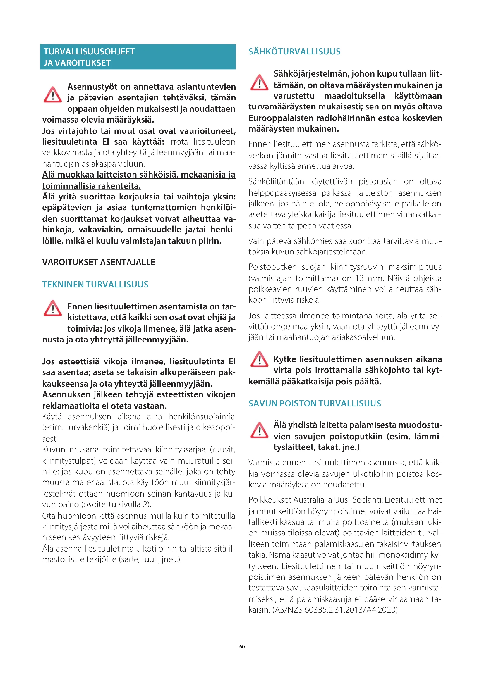 Älä yhdistä laitetta palamisesta muodostu- vien savujen poistoputkiin (esim. lämmi- tyslaitteet, takat, jne.) Varmista ennen liesituulettimen asennusta, että kaik- kia voimassa olevia savujen ulkotiloihin poistoa kos- kevia määräyksiä on noudatettu. Poikkeukset Australia ja Uusi-Seelanti: Liesituulettimet ja muut keittiön höyrynpoistimet voivat vaikuttaa hai- tallisesti kaasua tai muita polttoaineita (mukaan luki- en muissa tiloissa olevat) polttavien laitteiden turval- liseen toimintaan palamiskaasujen takaisinvirtauksen takia. Nämä kaasut voivat johtaa hiilimonoksidimyrky- tykseen. Liesituulettimen tai muun keittiön höyryn- poistimen asennuksen jälkeen pätevän henkilön on testattava savukaasulaitteiden toiminta sen varmista- miseksi, että palamiskaasuja ei pääse virtaamaan ta- kaisin. (AS/NZS 60335.2.31:2013/A4:2020)61 SUOMI