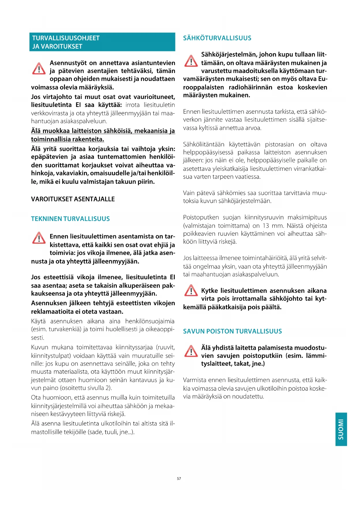Älä yhdistä laitetta palamisesta muodostu- vien savujen poistoputkiin (esim. lämmi- tyslaitteet, takat, jne.) Varmista ennen liesituulettimen asennusta, että kaik- kia voimassa olevia savujen ulkotiloihin poistoa koske- via määräyksiä on noudatettu.58