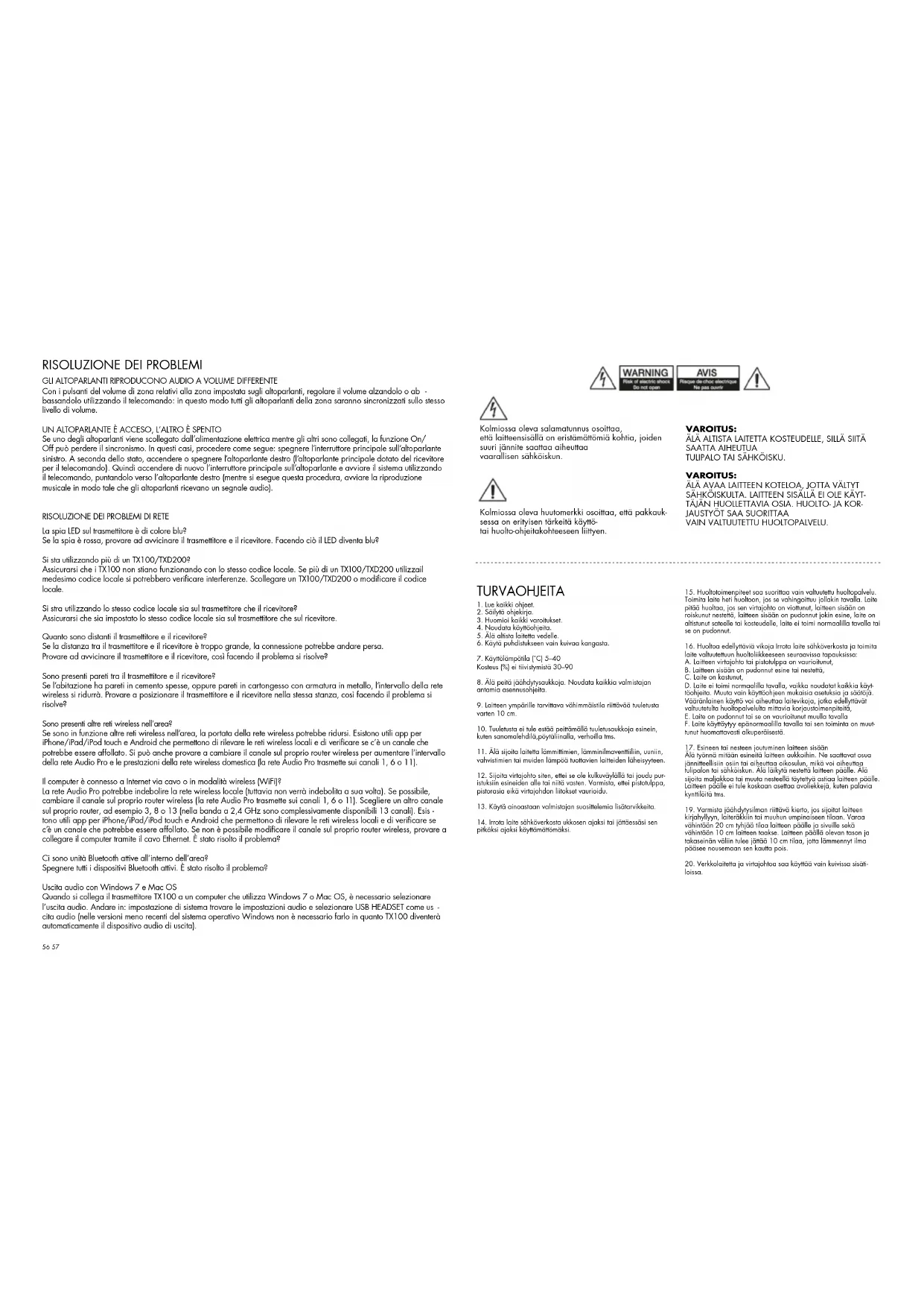 Onko lähettimen LED-valo sininen? Jos valo on punainen, yritä siirtää lähetintä ja vastaanotinta lähemmäksi toisiaan. Muuttuuko LED-valo tämän jälkeen siniseksi? Käytätkö useampaa kuin yhtä TX100-lähetintä? Varmista, että TX100-lähettimet eivät käytä samaa talokoodia. Jos useampi kuin yksi TX100 käyttää samaa talok- oodia, häiriöitä saattaa ilmetä. Kytke irti yksi TX100 tai vaihda talokoodia. Käytätkö lähetintä ja vastaanotinta samalla talokoodilla? Varmista, että sekä lähettimelle että vastaanottimelle asetetaan sama talokoodi. Kuinka kaukana lähetin ja vastaaotin ovat toisistaan? Jos lähettimen ja vastaanottimen etäisyys on liian suuri, yhteys saattaa kadota. Yritä asettaa lähetin ja vastaanotin lähemmäksi toisiaan ja kokeile, oliko siitä apua. Onko lähettimen ja vastaanottimen välissä seiniä? Jos kodissasi on paksuja sementtiseiniä tai kipsiseiniä metallilankasäleellä, langaton kantama pienenee. Yritä aset- taa lähetin ja vastaanotin samaan huoneeseen ja kokeile, onko siitä apua. Onko lähialueella muita langattomia verkkoja? Jos lähialueella on käytössä muita langattomia verkkoja, langaton kantama pienenee. iPhone/iPad/iPod touch ja Android-laitteille on olemassa käteviä sovelluksia paikallisten verkkojen havaitsemiseksi ja mahdollisten ruuh- kaantuneiden kanavien tarkistamiseksi. Voit myös yrittää muuttaa langattoman reitittimesi kanavaa Audio Pro -verkkokantaman ja langattoman kotiverkkosi tehokkuuden kasvattamiseksi (Audio Pro -verkko lähettää kanavilla 1, 6 tai 11). Onko tietokoneesi kytketty Internetiin kaapelilla vai langattomasti (WiFi)? Audio Pro -verkko saattaa heikentää langatonta paikallisverkkoa (mutta se ei itse heikkene). Mikäli mahdollista, muuta langattoman reitittimesi kanavaa (Audio Pro -verkko lähettää kanavilla 1, 6 tai 11). Valitse reitittimellesi uusi kanava, esimerkiksi 3, 8 tai 13. (2.4 GHz kaistalla on käytettävissä kaikkiaan 13 kanavaa.) iPhone/iPad/iPod touch ja Android-laitteille on olemassa käteviä sovelluksia paikallisten verkkojen havaitsemiseksi ja mahdollisten ruuhkaantuneiden kanavien tarkistamiseksi. Jos et voi muuttaa langattoman reitittimesi kanavaa, yritä kytkeä tietokoneesi sen sijaan Ethernet-kaapelilla. Auttoiko tämä? Onko lähialueella käytössä Bluetooth-yksiköitä? Sulje kaikki käytössä olevat Bluetooth-laitteet. Auttoiko tämä? Windows 7 ja Mac OS, äänilähtö Kun kytket TX100-lähettimen Windows 7 tai Mac OS -käyttöjärjestelmää käyttävään tietokoneeseen, sinun tulee valita äänilähtö. Mene kohtaan Järjestelmäasetukset, etsi ääniasetukset ja valitse äänilähdöksi USB-Headset (van- hemmissa Windows-käyttöjärjestelmissä ei tarvitse tehdä tätä, sillä TX100 valitaan automaattisesti äänilähtölait- teeksi). ÄÄNENVOIMAKKUUDEN SÄÄTÖ KOLMELLA ERI ALUEELLA ERIKSEEN Jotta voisit kuunnella samaa musiikkia eri äänenvoimakkuuksilla eri huoneissa/alueilla, voit jakaa kunkin talokoodin kolmeen eri äänenvoimakkuusalueeseen. Kullakin alueella on eri äänenvoimak- kuustaso. Tämä on erittäin kätevää silloin, kun haluat esimerkiksi yhden äänenvoimakkuustason olohuoneeseen ja matalamman äänenvoimakkuustason keittiöön. Voit asentaa kullekin alueelle niin monta LIVING-kaiutinta kuin haluat tai vain yhden kaiutinparin. Alueen äänenvoimakkuutta voi säätää helposti kauko-ohjaimella. Huomio: