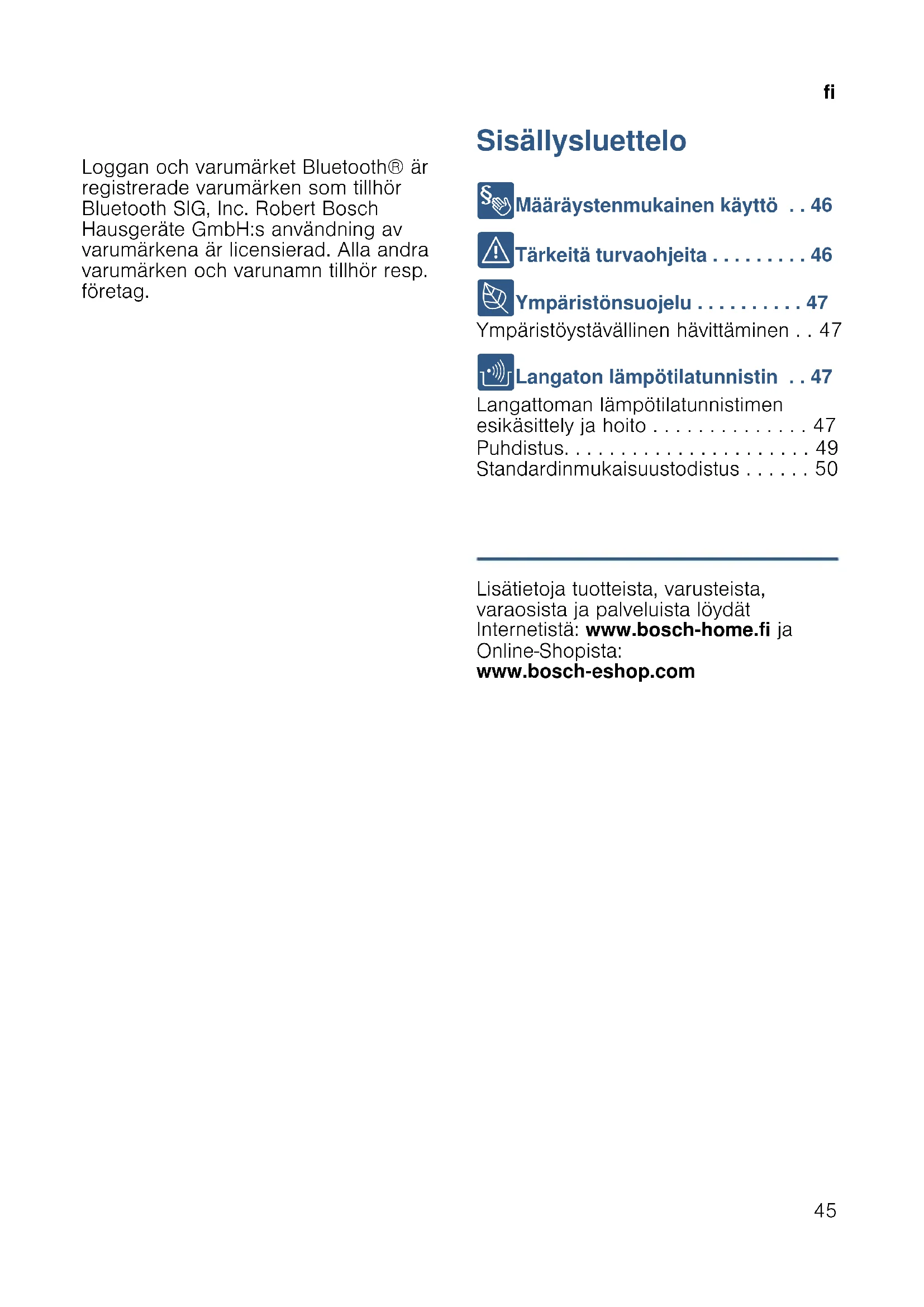 - Loggan och varumärket Bluetooth® är registrerade varumärken som tillhör Bluetooth SIG, Inc. Robert Bosch Hausgeräte GmbH:s användning av varumärkena är licensierad. Alla andra varumärken och varunamn tillhör resp. företag. Sisällysluettelo fiKäyt t öohj e 8 Määräystenmukainen käyttö p. 46