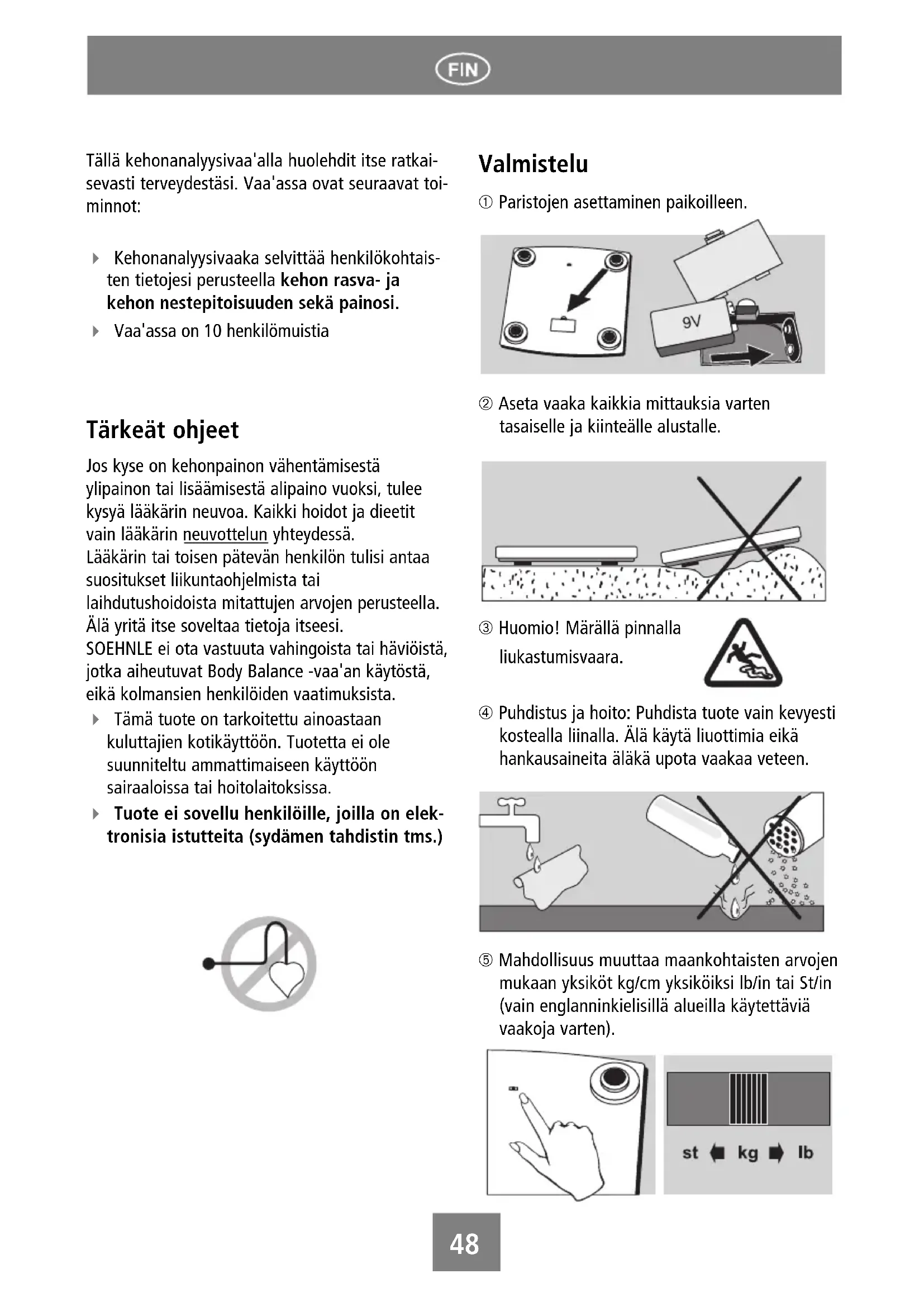SOEHNLE ei ota vastuuta vahingoista tai haviöistä, jotka aiheutuvat Body Balance -vaa'an kaytostä, eikä kolmansien henkilöiden vaatimuksista.