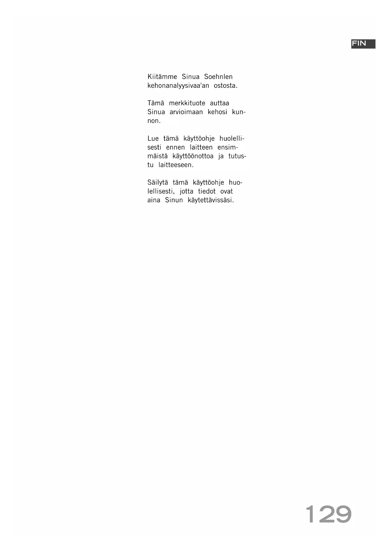 BA63721slimF5_120863_V10.qxd:BA63721slimF5_120863_V9.qxd 05.01.2010 13:22 Uhr Seite 128129 Kiitämme Sinua Soehnlen kehonanalyysivaa'an ostosta. Tämä merkkituote auttaa Sinua arvioimaan kehosi kun- non. Lue tämä käyttöohje huolelli- sesti ennen laitteen ensim- mäistä käyttöönottoa ja tutus- tu laitteeseen. Säilytä tämä käyttöohje huo- lellisesti, jotta tiedot ovat aina Sinun käytettävissäsi. FIN BA63721slimF5_120863_V10.qxd:BA63721slimF5_120863_V9.qxd 05.01.2010 13:22 Uhr Seite 129130