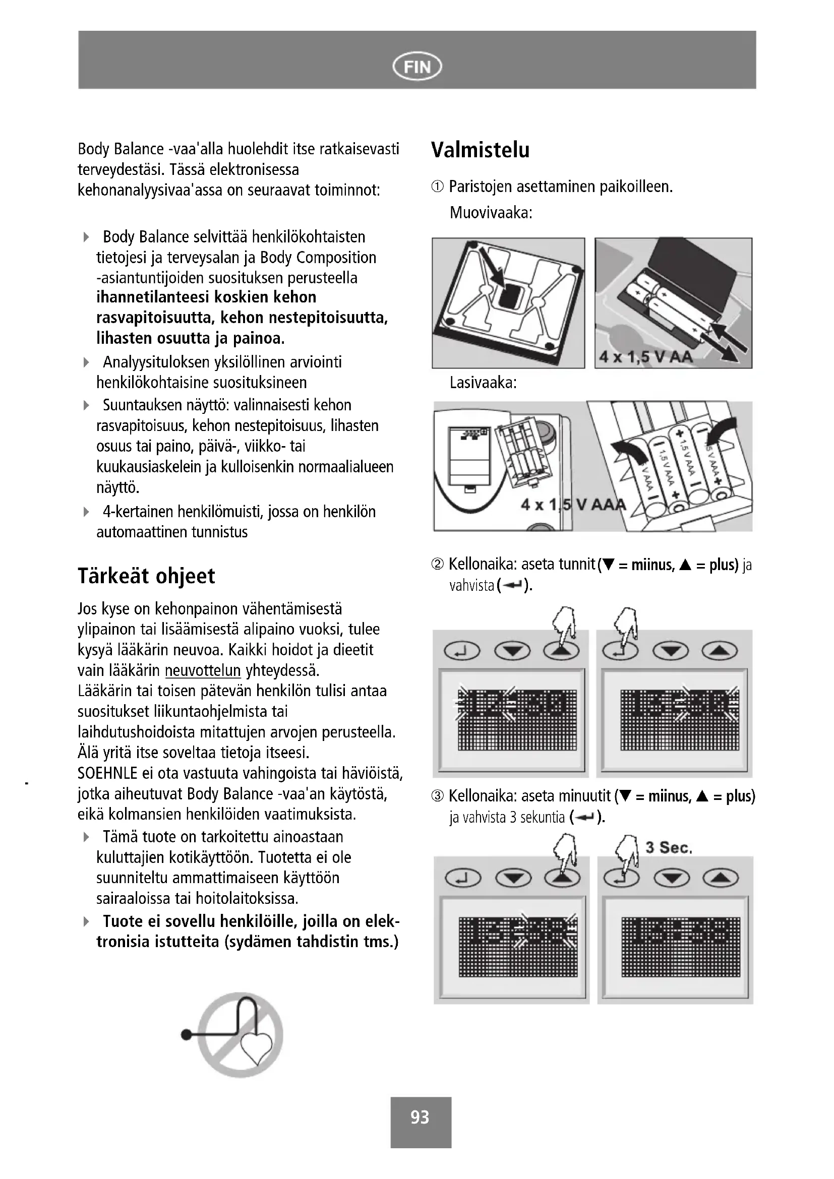BA_63711_neu_V8.qxd 19.01.2006 12:03 Uhr Seite 9293 Body Balance -vaa'alla huolehdit itse ratkaisevasti terveydestäsi. Tässä elektronisessa kehonanalyysivaa'assa on seuraavat toiminnot: Body Balance selvittää henkilökohtaisten tietojesi ja terveysalan ja Body Composition -asiantuntijoiden suosituksen perusteella ihannetilanteesi koskien kehon rasvapitoisuutta, kehon nestepitoisuutta, lihasten osuutta ja painoa. Analyysituloksen yksilöllinen arviointi henkilökohtaisine suosituksineen Suuntauksen näyttö: valinnaisesti kehon rasvapitoisuus, kehon nestepitoisuus, lihasten osuus tai paino, päivä-, viikko- tai kuukausiaskelein ja kulloisenkin normaalialueen näyttö. 4-kertainen henkilömuisti, jossa on henkilön automaattinen tunnistus Tärkeät ohjeet Jos kyse on kehonpainon vähentämisestä ylipainon tai lisäämisestä alipaino vuoksi, tulee kysyä lääkärin neuvoa. Kaikki hoidot ja dieetit vain lääkärin neuvottelun yhteydessä. Lääkärin tai toisen pätevän henkilön tulisi antaa suositukset liikuntaohjelmista tai laihdutushoidoista mitattujen arvojen perusteella. Älä yritä itse soveltaa tietoja itseesi. SOEHNLE ei ota vastuuta vahingoista tai häviöistä, jotka aiheutuvat Body Balance -vaa'an käytöstä, eikä kolmansien henkilöiden vaatimuksista. Tämä tuote on tarkoitettu ainoastaan kuluttajien kotikäyttöön. Tuotetta ei ole suunniteltu ammattimaiseen käyttöön sairaaloissa tai hoitolaitoksissa. Tuote ei sovellu henkilöille, joilla on elek- tronisia istutteita (sydämen tahdistin tms.) Valmistelu ➀ Paristojen asettaminen paikoilleen. Muovivaaka: Lasivaaka: ➁ Kellonaika: aseta tunnit (▼ = miinus, ▲ = plus) ja vahvista