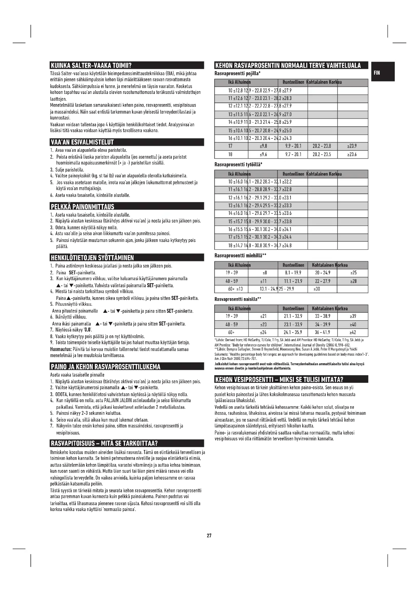 Kuinka laite mittaa kehon raspitoisuuden ja vesipronsetin? Tässä Salter-vaa’assa käytetään bioimpedanssimittaukseksi kutsuttua mittausmenetelmää. Äärimmäisen pieni määrä sähkövirtaa johdetaan kehon läpi jalkojen ja säärien kautta. Tämä sähkövirta kulkee helposti rasvattoman lihaskudoksen läpi, jossa on korkea nestepitoisuus, mutta ei niin helposti rasvan läpi. Näin ollen mittaamalla kehon impedanssi (ts. sähkövirran vastuksen) voidaan määritellä lihasmassa. Tästä lukemasta voidaan sitten arvioida rasvan ja veden osuus. Kuinka suuri sähkövirta kehoni läpi kulkee mittauksen aikana? Onko se turvallista? Sähkövirta on alle 1 mA, mikä on äärimmäisen vähäistä ja täysin turvallista. Sitä ei edes tunne. Tästä huolimatta, tätä laitetta eivät saa käyttää henkilöt, joille on asennettu sisäinen lääkinnällinen laite, kuten sydämen tahdistin, välineeseen mahdollisesti aiheutuvien häiriöiden varalta. Jos mittaan kehoni rasva- ja vesiprosentit eri vuorokauden aikaan, ne vaihtelevat melko paljon. Mikä lukema on oikea? Kehon rasvaprosenttilukema vaihtelee kehon vesipitoisuuden mukaan, ja vesipitoisuus muuttuu päivän aikana. Ei ole olemassa oikeaa tai väärää aikaa ottaa lukemaa, mutta mittaukset tulisi pyrkiä tekemään säännöllisesti silloin kun arvioit kehosi nestetasapainon olevan normaali. Vältä mittaamista kylvyn tai saunan jälkeen, tehokkaan kuntoilun jälkeen tai 1-2 tunnin sisällä juomisesta tai syömisestä. Ystävälläni on toisen valmistajan kehon rasvaprosentin analyysivaaka. Kun käytin sitä, huomasin, että kehoni rasvaprosenttilukema oli erilainen. Miksi? Eri kehon rasvaprosenttianalysaattorit tekevät mittaukset eri kohdista kehoa ja käyttävät erilaisia matemaattisia algoritmeja kehon rasvaprosentin laskemiseen. Laitteita ei kannata vertailla toisiinsa, vaan käyttää samaa laitetta joka kerta muutoksen seuraamiseksi. Kuinka kehon rasva- ja vesiprosenttilukemat tulkitaan? Katso laitteen mukana toimitettuja Kehon rasvaprosentti- ja vesipitoisuustaulukoita. Ne antavat viitteitä siitä, ovatko kehosi rasvaprosentti- ja vesipitoisuuslukemat terveellisissä rajoissa (ikä ja sukupuoli vaikuttavat tähän). Mitä minun pitäisi tehdä, jos kehoni rasvaprosenttilukema on erittäin korkea? Kehon rasvaprosenttia voi pienentää järkevällä ruokavalio-, neste- ja kunto-ohjelmalla. Terveydenhoitoalan ammattilaisilta tulisi aina kysyä neuvoa ennen tällaisen ohjelman aloittamista. Mitkä ovat kehon rasvaprosenttilukemat miehillä ja naisilla? Naisten rasvaprosentti on luonnostaan korkeampia kuin miesten, koska kehon koostumus on erilainen johtuen valmistautumisesta raskauteen, imettämiseen jne. Mitä minun pitäisi tehdä, jos kehoni vesiprosenttilukema on erittäin alhainen? Varmista, että juot säännöllisesti ja riittävästi vettä ja pyrit saamaan kehosi rasvaprosentin terveellisiin lukemiin. Miksi kehon koostumuksen analyysivakaa ei tulisi käyttää raskauden aikana? Naisen kehon koostumus muuttuu huomattavasti raskauden aikana tukeakseen vauvan kehitystä. Tällöin kehon rasvaprosenttilukemat saattavat olla epätarkkoja ja harhaanjohtavia. Raskaana olevien tulisi tästä syystä käyttää vain painotoimintoa.