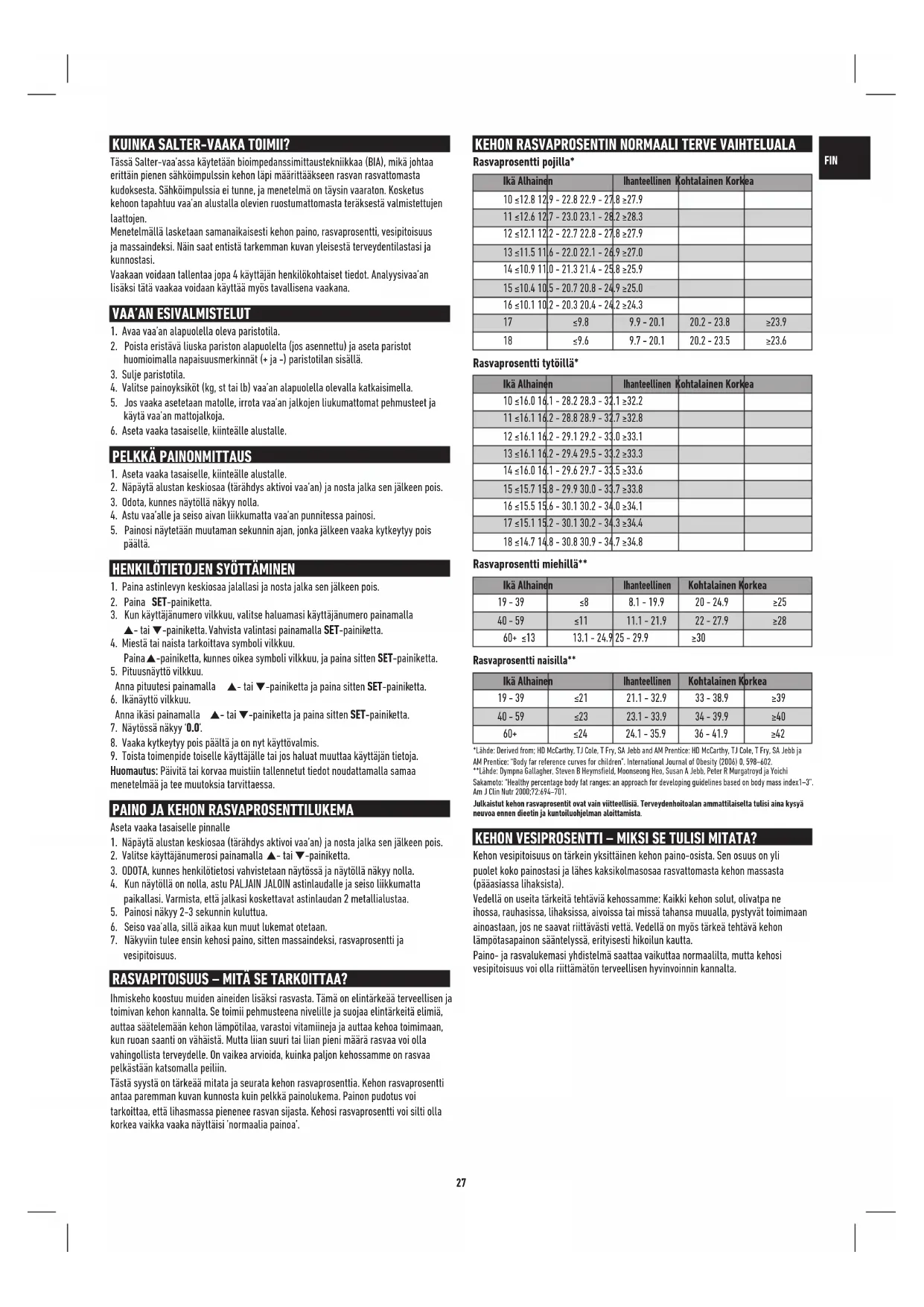 60+ ≤24 24.1 - 35.9 36 - 41.9 ≥42 *Lähde: Derived from; HD McCarthy, TJ Cole, T Fry, SA Jebb and AM Prentice: HD McCarthy, TJ Cole, T Fry, SA Jebb ja AM Prentice: “Body far reference curves for children”. International Journal of Obesity (2006) 0, 598–602.**Lähde: Dympna Gallagher, Steven B Heymsfield, Moonseong Heo, Susan A Jebb, Peter R Murgatroyd ja Yoichi Sakamoto: “Healthy percentage body fat ranges: an approach for developing guidelines based on body mass index1–3”.Am J Clin Nutr 2000;72:694–701.Julkaistut kehon rasvaprosentit ovat vain viitteellisiä. Terveydenhoitoalan ammattilaiselta tulisi aina kysyä neuvoa ennen dieetin ja kuntoiluohjelman aloittamista. KEHON VESIPROSENTTI – MIKSI SE TULISI MITATA? Kehon vesipitoisuus on tärkein yksittäinen kehon paino-osista. Sen osuus on yli puolet koko painostasi ja lähes kaksikolmasosaa rasvattomasta kehon massasta (pääasiassa lihaksista). Vedellä on useita tärkeitä tehtäviä kehossamme: Kaikki kehon solut, olivatpa ne ihossa, rauhasissa, lihaksissa, aivoissa tai missä tahansa muualla, pystyvät toimimaan ainoastaan, jos ne saavat riittävästi vettä. Vedellä on myös tärkeä tehtävä kehon lämpötasapainon sääntelyssä, erityisesti hikoilun kautta. Paino- ja rasvalukemasi yhdistelmä saattaa vaikuttaa normaalilta, mutta kehosi vesipitoisuus voi olla riittämätön terveellisen hyvinvoinnin kannalta.28 FIN
