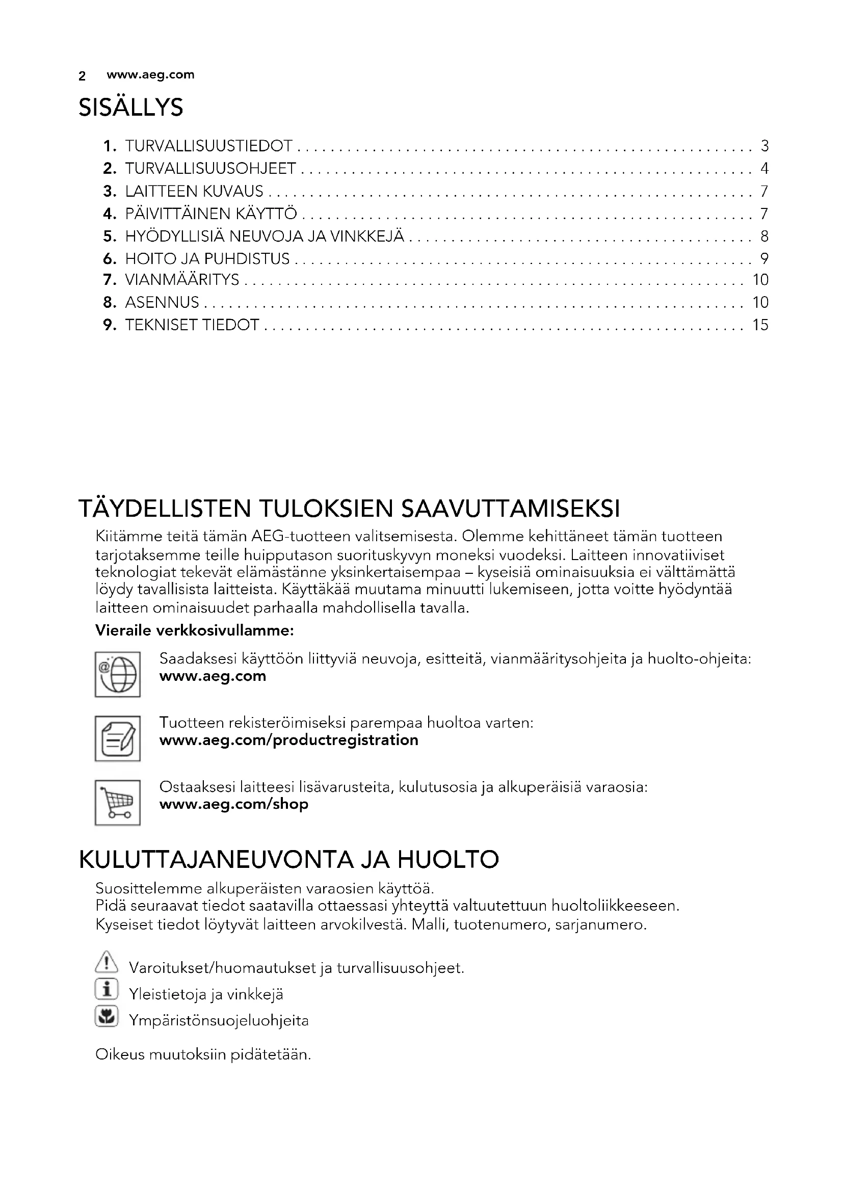 Kiitämme teitä tämän AEG-tuotteen valitsemisesta. Olemme kehittäneet tämän tuotteen tarjotaksemme teille huipputason suorituskyvyn moneksi vuodeksi. Laitteen innovatiiviset teknologiat tekevät elämästänne yksinkertaisempaa – kyseisiä ominaisuuksia ei välttämättä löydy tavallisista laitteista. Käyttäkää muutama minuutti lukemiseen, jotta voitte hyödyntää laitteen ominaisuudet parhaalla mahdollisella tavalla. Vieraile verkkosivullamme: Saadaksesi käyttöön liittyviä neuvoja, esitteitä, vianmääritysohjeita ja huolto-ohjeita: www.aeg.com Tuotteen rekisteröimiseksi parempaa huoltoa varten: www.aeg.com/productregistration Ostaaksesi laitteesi lisävarusteita, kulutusosia ja alkuperäisiä varaosia: www.aeg.com/shop
