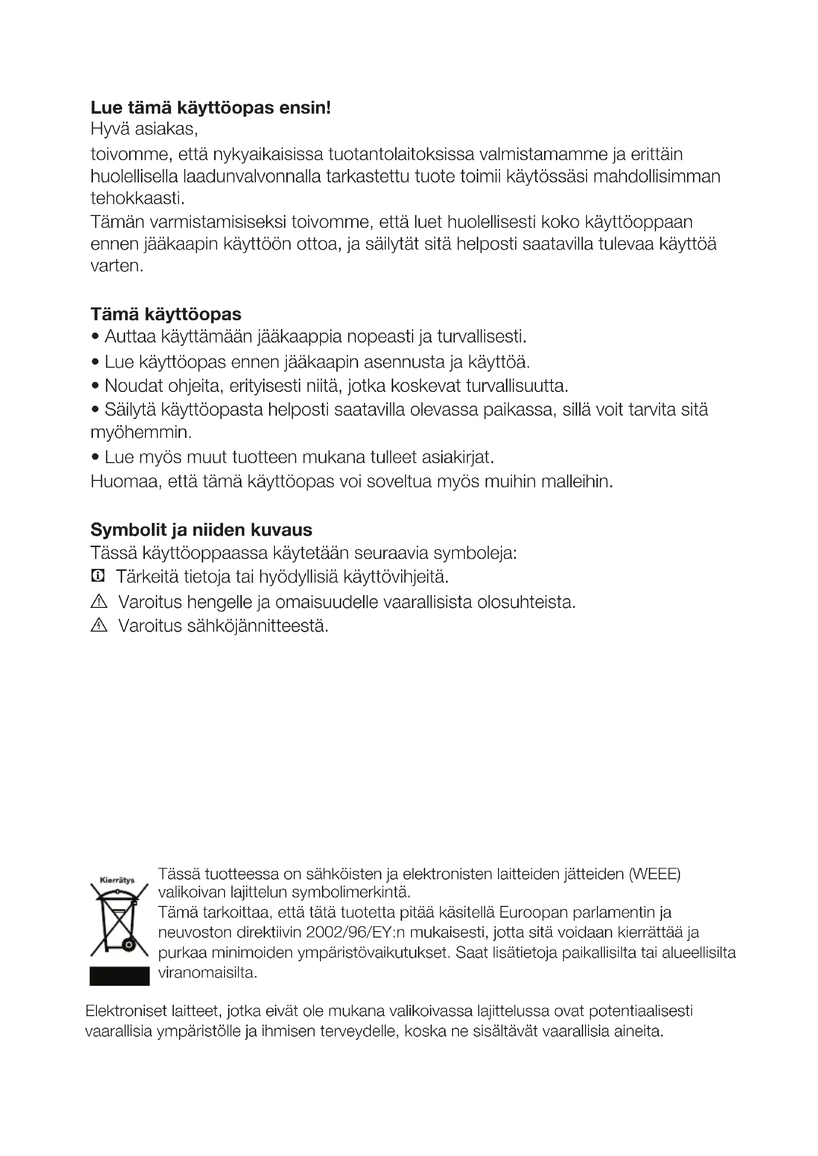 - Lue käyttöopas ennen jääkaapin asennusta ja käyttöä.