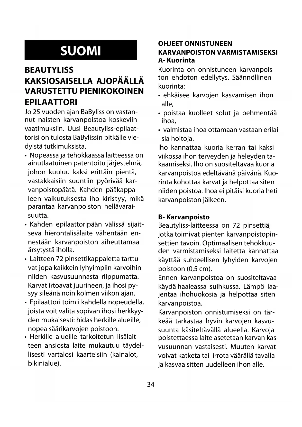 - Käytä Babylissin Beautyliss-laitetta ainoastaan karvojen poistoon käyttöo- hjeiden mukaisesti.