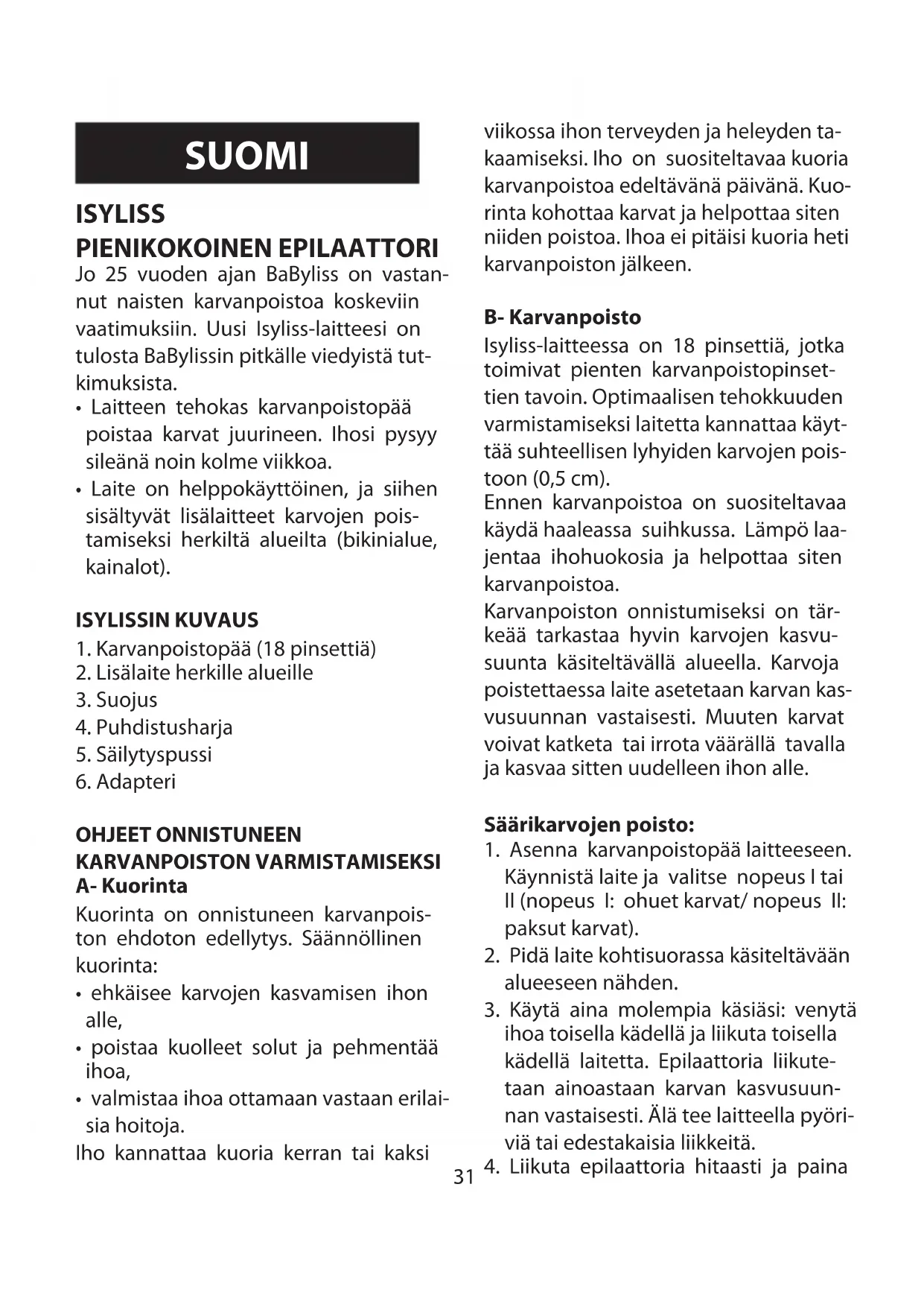 - Laitetta ei saa käyttää kasvojen, rinnan tai intiimialueiden karvojen poistoon eikä hiusten, kulmakarvojen tai sil- märipsien poistoon. Isylissiä käytetään ainoastaan säärien, bikinialueen, käsi- varsien ja kainaloiden karvojen pois- toon. HUOLTO