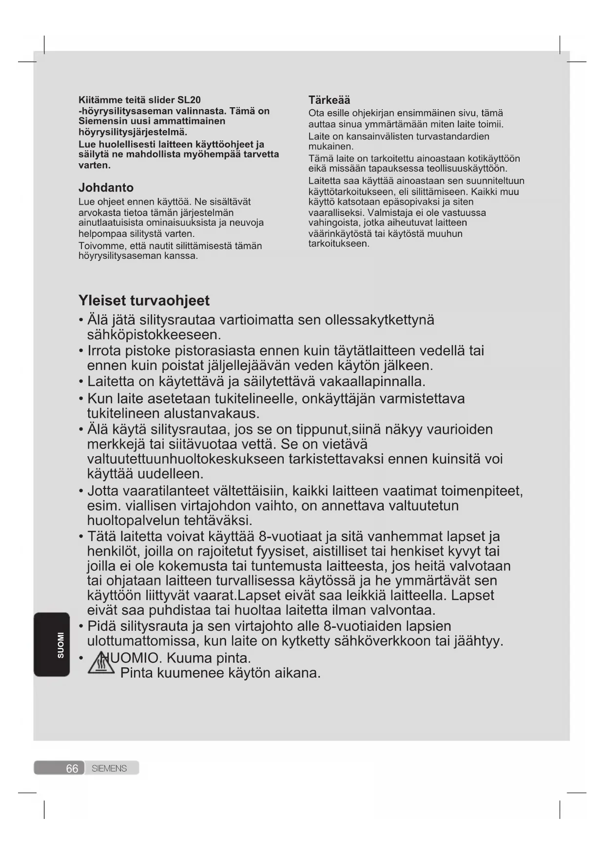 - Tryck bara på knappen igen och strykjärnet slutar ånga omedelbart. Om ovanstående råd inte löser problemet bör dukontakta ett auktoriserat tekniskt servicecenter.66 S I E M E N SSUOMI KiitämmeteitäsliderSL20 -höyrysilitysasemanvalinnasta.Tämäon Siemensinuusiammattimainen höyrysilitysjärjestelmä. Luehuolellisestilaitteenkäyttöohjeetja säilytänemahdollistamyöhempäätarvetta varten. Johdanto Lue ohjeet ennen käyttöä. Ne sisältävät arvokasta tietoa tämän järjestelmän ainutlaatuisista ominaisuuksista ja neuvoja helpompaa silitystä varten. Toivomme, että nautit silittämisestä tämän höyrysilitysaseman kanssa. Tärkeää Ota esille ohjekirjan ensimmäinen sivu, tämä auttaa sinua ymmärtämään miten laite toimii. Laite on kansainvälisten turvastandardien mukainen. Tämä laite on tarkoitettu ainoastaan kotikäyttöön eikä missään tapauksessa teollisuuskäyttöön. Laitetta saa käyttää ainoastaan sen suunniteltuun käyttötarkoitukseen, eli silittämiseen. Kaikki muu käyttö katsotaan epäsopivaksi ja siten vaaralliseksi. Valmistaja ei ole vastuussa vahingoista, jotka aiheutuvat laitteen väärinkäytöstä tai käytöstä muuhun tarkoitukseen. Yleisetturvaohjeet