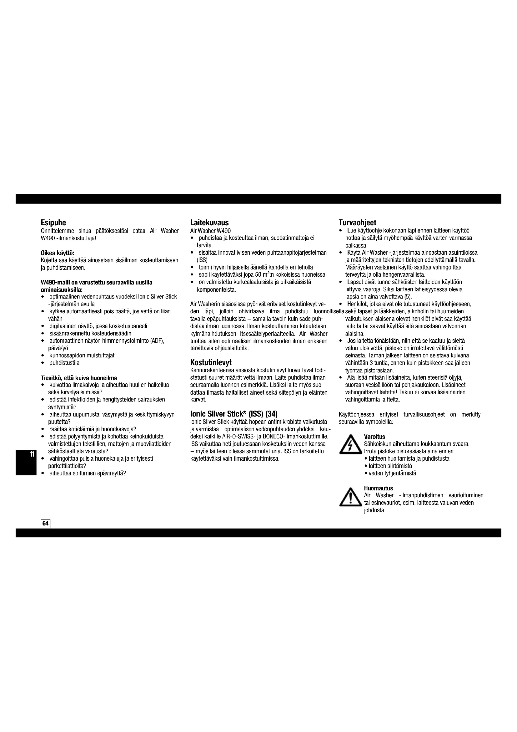 - KäytäAirWasher-järjestelmääainoastaanasuintiloissa jamääriteltyjenteknistentietojenedellyttämällätavalla. Määräystenvastainenkäyttösaattaavahingoittaa terveyttäjaollahengenvaarallista.