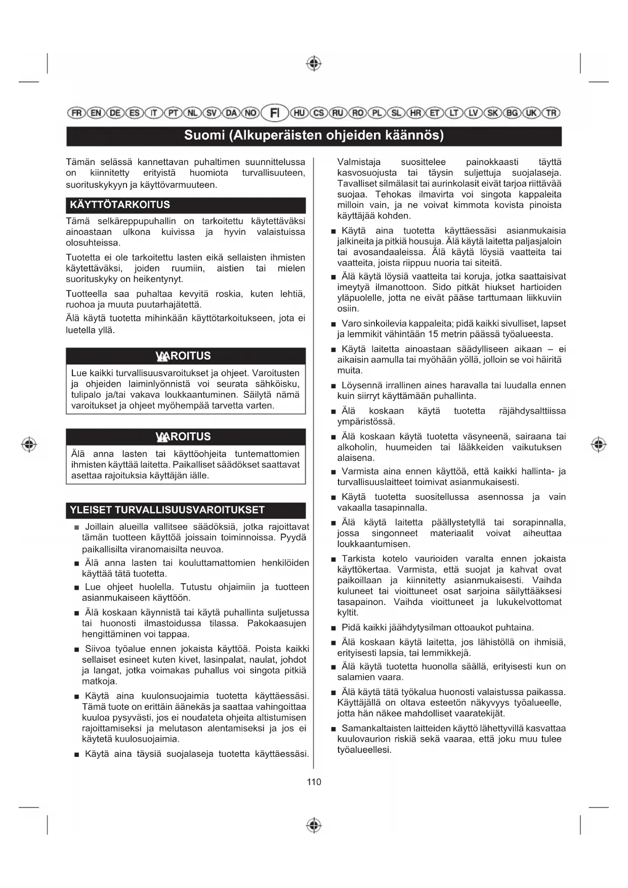Tämä selkäreppupuhallin on tarkoitettu käytettäväksi ainoastaan ulkona kuivissa ja hyvin valaistuissa olosuhteissa. Tuotetta ei ole tarkoitettu lasten eikä sellaisten ihmisten käytettäväksi, joiden ruumiin, aistien tai mielen suorituskyky on heikentynyt. Tuotteella saa puhaltaa kevyitä roskia, kuten lehtiä, ruohoa ja muuta puutarhajätettä. Älä käytä tuotetta mihinkään käyttötarkoitukseen, jota ei luetella yllä. VAROITUS Lue kaikki turvallisuusvaroitukset ja ohjeet. Varoitusten ja ohjeiden laiminlyönnistä voi seurata sähköisku, tulipalo ja/tai vakava loukkaantuminen. Säilytä nämä varoitukset ja ohjeet myöhempää tarvetta varten. VAROITUS Älä anna lasten tai käyttöohjeita tuntemattomien ihmisten käyttää laitetta. Paikalliset säädökset saattavat asettaa rajoituksia käyttäjän iälle. YLEISET TURVALLISUUSVAROITUKSET ■ Joillain alueilla vallitsee säädöksiä, jotka rajoittavat tämän tuotteen käyttöä joissain toiminnoissa. Pyydä paikallisilta viranomaisilta neuvoa. ■ Älä anna lasten tai kouluttamattomien henkilöiden käyttää tätä tuotetta. ■ Lue ohjeet huolella. Tutustu ohjaimiin ja tuotteen asianmukaiseen käyttöön. ■ Älä koskaan käynnistä tai käytä puhallinta suljetussa tai huonosti ilmastoidussa tilassa. Pakokaasujen hengittäminen voi tappaa. ■ Siivoa työalue ennen jokaista käyttöä. Poista kaikki sellaiset esineet kuten kivet, lasinpalat, naulat, johdot ja langat, jotka voimakas puhallus voi singota pitkiä matkoja. ■ Käytä aina kuulonsuojaimia tuotetta käyttäessäsi. Tämä tuote on erittäin äänekäs ja saattaa vahingoittaa kuuloa pysyvästi, jos ei noudateta ohjeita altistumisen rajoittamiseksi ja melutason alentamiseksi ja jos ei käytetä kuulosuojaimia. ■ Käytä aina täysiä suojalaseja tuotetta käyttäessäsi. Valmistaja suosittelee painokkaasti täyttä kasvosuojusta tai täysin suljettuja suojalaseja. Tavalliset silmälasit tai aurinkolasit eivät tarjoa riittävää suojaa. Tehokas ilmavirta voi singota kappaleita milloin vain, ja ne voivat kimmota kovista pinoista käyttäjää kohden. ■ Käytä aina tuotetta käyttäessäsi asianmukaisia jalkineita ja pitkiä housuja. Älä käytä laitetta paljasjaloin tai avosandaaleissa. Älä käytä löysiä vaatteita tai vaatteita, joista riippuu nuoria tai siteitä. ■ Älä käytä löysiä vaatteita tai koruja, jotka saattaisivat imeytyä ilmanottoon. Sido pitkät hiukset hartioiden yläpuolelle, jotta ne eivät pääse tarttumaan liikkuviin osiin. ■ Varo sinkoilevia kappaleita; pidä kaikki sivulliset, lapset ja lemmikit vähintään 15 metrin päässä työalueesta. ■ Käytä laitetta ainoastaan säädylliseen aikaan – ei aikaisin aamulla tai myöhään yöllä, jolloin se voi häiritä muita. ■ Löysennä irrallinen aines haravalla tai luudalla ennen kuin siirryt käyttämään puhallinta. ■ Älä koskaan käytä tuotetta räjähdysalttiissa ympäristössä. ■ Älä koskaan käytä tuotetta väsyneenä, sairaana tai alkoholin, huumeiden tai lääkkeiden vaikutuksen alaisena. ■ Varmista aina ennen käyttöä, että kaikki hallinta- ja turvallisuuslaitteet toimivat asianmukaisesti. ■ Käytä tuotetta suositellussa asennossa ja vain vakaalla tasapinnalla. ■ Älä käytä laitetta päällystetyllä tai sorapinnalla, jossa singonneet materiaalit voivat aiheuttaa loukkaantumisen. ■ Tarkista kotelo vaurioiden varalta ennen jokaista käyttökertaa. Varmista, että suojat ja kahvat ovat paikoillaan ja kiinnitetty asianmukaisesti. Vaihda kuluneet tai vioittuneet osat sarjoina säilyttääksesi tasapainon. Vaihda vioittuneet ja lukukelvottomat kyltit. ■ Pidä kaikki jäähdytysilman ottoaukot puhtaina. ■ Älä koskaan käytä laitetta, jos lähistöllä on ihmisiä, erityisesti lapsia, tai lemmikkejä. ■ Älä käytä tuotetta huonolla säällä, erityisesti kun on salamien vaara. ■ Älä käytä tätä työkalua huonosti valaistussa paikassa. Käyttäjällä on oltava esteetön näkyvyys työalueelle, jotta hän näkee mahdolliset vaaratekijät. ■ Samankaltaisten laitteiden käyttö lähettyvillä kasvattaa kuulovaurion riskiä sekä vaaraa, että joku muu tulee työalueellesi.111 Suomi (Alkuperäisten ohjeiden käännös) ■ Seiso rinteissä aina tukevasti. Kävele, älä koskaan juokse. ■ Pysyttele tukevasti jaloillasi äläkä kurkota käsivartta liian kauas. Älä kurkota liian pitkälle. Liian pitkälle kurkotta minen saattaa johtaa tasapainon menettämiseen. ■ Älä koskaan käytä tuotetta, jos suojat tai suojukset ovat epäkunnossa tai ilman suojalaitteita, kuten roskien kerääjää. ■ Älä muunna laitetta millään tavoin tai käytä osia tai lisävarusteita, jotka eivät ole valmistajan suosittelemia. VAROITUS Jos tuote putoaa, saa kovan iskun tai alkaa täristä normaalia enemmän, sammuta se heti ja tarkista se vaurioiden varalta tai paikanna tärinän syy. Valtuutetun huoltopisteen on korjattava tai vaihdettava vioittuneet osat asianmukaisesti. ■ Älä kosketa laitetta äänenvaimentimen tai moottorin läheltä, sillä nämä osat kuumenevat käytössä. ■ Aina ennen polttoaineen lisäämistä sammuta puhallin ja anna sen jäähtyä kokonaan. ■ Kun lisäät tai sekoitat polttoainetta, tee se aina hyvin ilmastoidussa tilassa, etäällä avotulen aiheuttamista kipinöistä, paloherkistä materiaaleista ja muista vastaavista sytytyslähteistä. ■ Älä tupakoi sekoittaessasi polttoainetta tai täyttäessäsi polttoainesäiliötä. ■ Sekoita ja säilytä polttoainetta bensiinin säilytykseen hyväksytyssä astiassa. ■ Pidä asianmukainen tulensammutin lähellä polttoainepalon varalta. ■ Älä unohda kiinnittää bensiinitankin korkkia kunnolla ennen moottorin käynnistämistä. Tarkista, ettei sahassa ole polttoainevuotoja. ■ Pyyhi pois läikkynyt polttoaine. Siirry 9 metrin päähän täyttöpaikasta ennen moottorin käynnistämistä. ■ Jos joudut koskemaan puhaltimen pyöriviin 