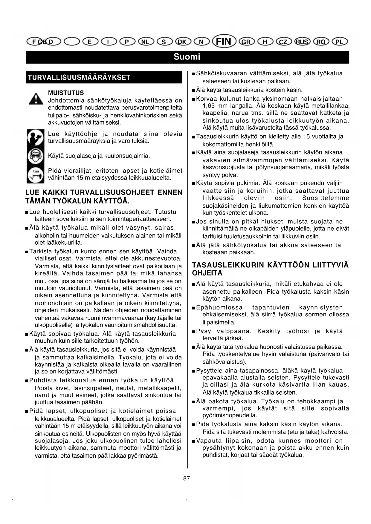 OHJEITA ■ Alä käytä tasausleikkuria, mikäli etukahvaa ei ole asennettu paikalleen. Pidä työkalusta kaksin käsin käytön aikana. ■ Epähuomiossa tapahtuvien käynnistysten ehkäisemiseksi, älä siirrä työkalua sormen ollessa liipaisimella. ■ Pysy valppaana. Keskity työhösi ja käytä tervettä järkeä. ■ Älä käytä tätä työkalua huonosti valaistussa paikassa. Pidä työskentelyalue hyvin valaistuna (päivänvalo tai sähkövalaistus). ■ Pysyttele aina tasapainossa, äläkä käytä työkalua epävakaalla alustalla seisten. Pysyttele tukevasti jaloillasi ja älä kurkota käsivartta liian kauas. Älä käytä työkalua tikkailla seisten. ■ Älä pakota työkalua. Työkalu on tehokkaampi ja varmempi, jos käytät sitä sille sopivalla pyörimisnopeudella. ■ Pidä työkalusta aina kaksin käsin käytön aikana. Pidä sitä tukevasti molemmista (etu ja taka) kahvoista. ■ Vapauta liipaisin, odota kunnes moottori on pysähtynyt kokonaan ja poista akku ennen kuin puhdistat, korjaat tai säädät työkalua. CLT-1423P / 1823 P manual 24/11/04 11:57 Page 87TURVALLISUUSMÄÄRÄYKSET ■ Tasausleikkuri on tarkoitettu ruohon ja risukon laikkaukseen ja viimeistelytyöhön. Älä käytä sitä reunaleikkurina. ■ Varmista, ettei tasaimen pää osu esteisiin ennen kuin käynnistät työkalun. ■ Jos tasausleikkuri osuu esteisiin tai mikäli joku esine tarttuu tasaimen päähän, sammuta työkalu välittömästi, poista akku ja tarkista, ettei osia ole vaurioitunut. Älä käytä työkalua ennen kuin olet tehnyt tarvittavat korjaukset. Älä käytä työkalua, mikäli siinä on huonosti kiinnitettyjä tai vioittuneita osia. ■ Pysyttele kaukana tasaimen päästä ja muista liikkuvista osista. Älä koske tai yritä keskeyttää käsin pyörivää tasaimen päätä. ■ Pidä tasaimen pää aina vyötärön alapuolella. ■ Sammuta aina moottori kun keskeytät leikkuutyön tai kun siirryt paikasta toiseen. ■ Ruohonohjain on pidettävä aina paikallaan tasausleikkurin käytön aikana. Älä käytä tasausleikkuria, jos lanka ei ole sopiva ja oikein ulos vedettynä. Älä vedä lankaa ruohonohjaimen reunan ulkopuolelle. ■ Älä anna leikkuujätteiden tai muun materiaalin kertyä työkalulle. Ne voivat juuttua tasaimen päähän tai ruohonohjaimelle. ■ Varastoi työkalu kuivaan tilaan, korkealle ja avaimella lukittavaan paikkaan luvattoman käytön ja vaurioittamisen ehkäisemiseksi. Pidä työkalu aina pois lasten ja kokemattomien henkilöiden ulottuvilta. ■ Älä koskaan upota työkalua veteen tai muuhun nesteeseen äläkä suihkuta vettä tai nesteitä sille. Pidä kahvat aina kuivina, puhtaina ja ilman leikkuujätteitä. Puhdista työkalu joka käytön jälkeen: katso ohjeita kohdista ”Tasausleikkurin puhdistaminen” ja ”Tasausleikkurin säilytys”. ■ Varmista ennen työkalun kuljetusta, että sen osat ovat kireällä. ■ Säilytä nämä ohjeet. Lue niitä säännöllisesti ja anna muiden käyttäjien tiedoksi. Mikäli lainaat tasausleikkurin, lainaa myös tämä käsikirja. KORJAUKSET ■ Korjaukset saa tehdä vain ammattitaitoinen huoltomies. Mikäli huolto- tai korjaustyöt on tehnyt ammattitaidoton henkilö, on seurauksena vakava ruumiinvammavaara ja työkalun vaurioituminen. Tämän ohjeen laiminlyönti johtaa takuun peruuntumiseen. ■ Käytä vaihdossa yksinomaan alkuperäisiä varaosia. Noudata tämän käyttöoppaan ”Huolto ja korjaukset” osassa annettuja ohjeita. Näin vältät vakavan sähköisku- ja ruumiinvammavaaran ja työkalun vaurioitumisen. Tämän ohjeen laiminlyönti johtaa takuun peruuntumiseen.