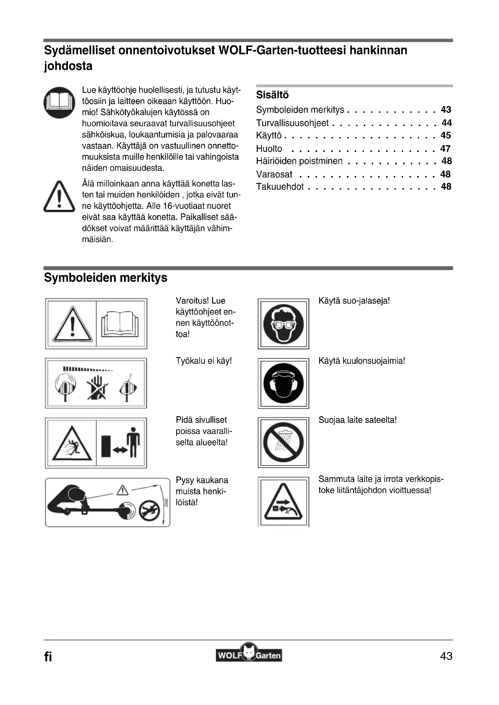 Sydämelliset onnentoivotukset WOLF-Garten-tuotteesi hankinnan johdosta Sisältö Symboleiden merkitys