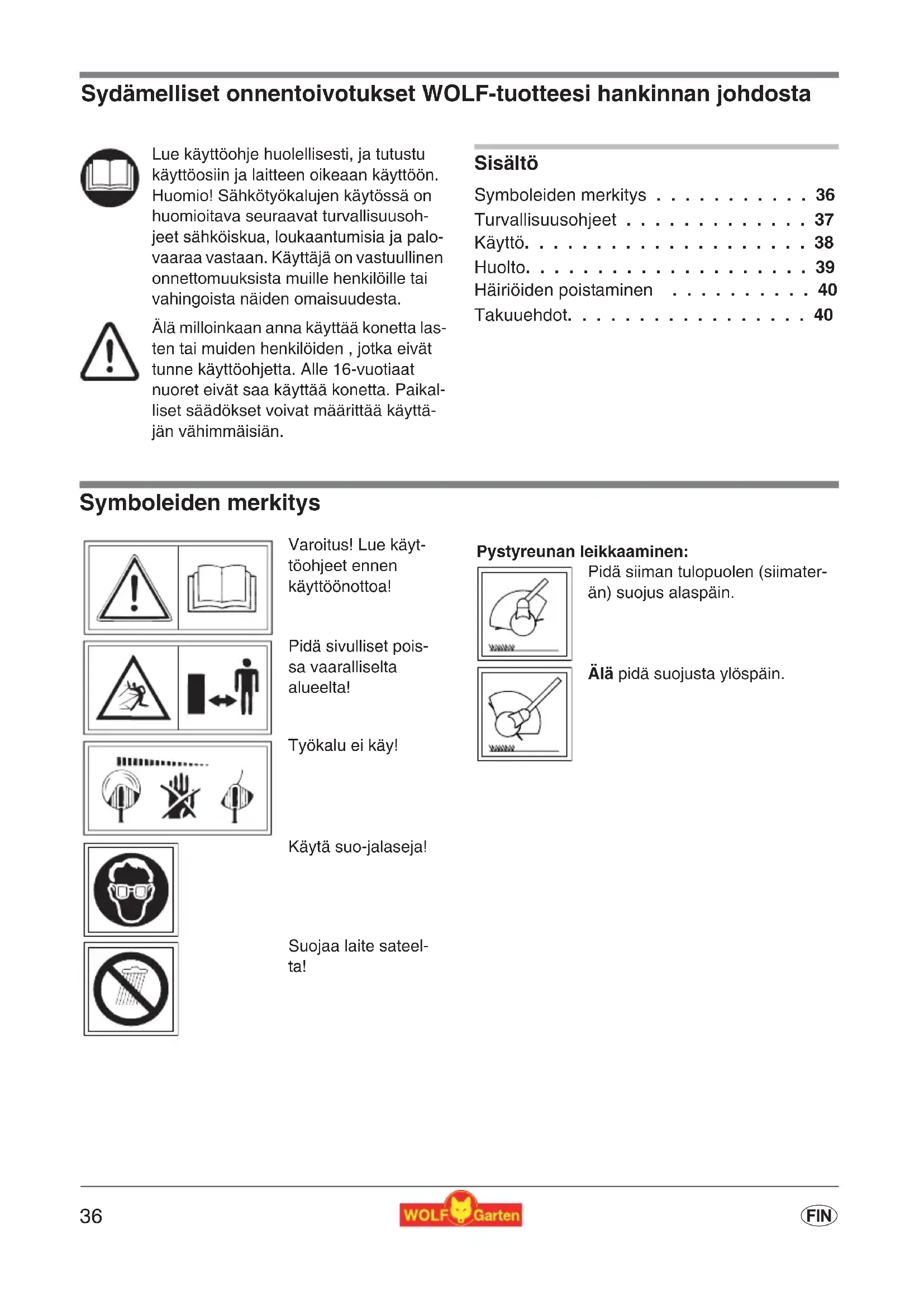 - f Sydämelliset onnentoivotukset WOLF-tuotteesi hankinnan johdosta Sisältö Symboleiden merkitys p. 36