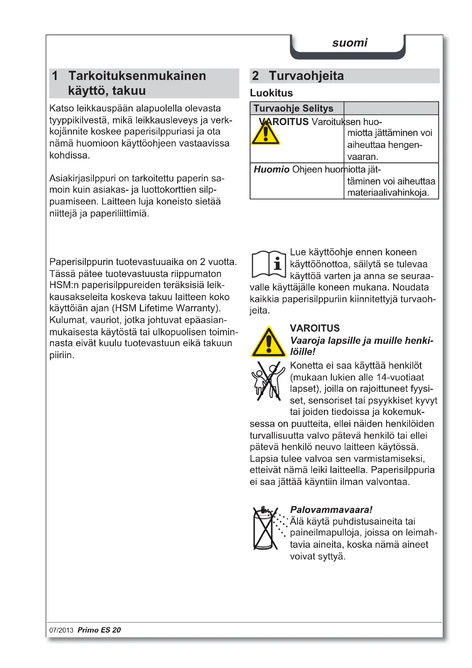 - EN 60950-1:2006 +A12:2011 Frickingen, 10.7.2013 ppa. Hubert Kötzinger - Chef för produktutveckling miljöteknik07/2013 Primo ES 20 57 suomi 1 Tarkoituksenmukainen käyttö, takuu 2 Turvaohjeita Luokitus Turvaohje Selitys VAROITUS Varoituksen huo- miotta jättäminen voi aiheuttaa hengen- vaaran. Huomio Ohjeen huomiotta jät- täminen voi aiheuttaa materiaalivahinkoja. Lue käyttöohje ennen koneen käyttöönottoa, säilytä se tulevaa käyttöä varten ja anna se seuraa- valle käyttäjälle koneen mukana. Noudata kaikkia paperisilppuriin kiinnitettyjä turvaoh- jeita. VAROITUS Vaaroja lapsille ja muille henki- löille! Konetta ei saa käyttää henkilöt (mukaan lukien alle 14-vuotiaat lapset), joilla on rajoittuneet fyysi- set, sensoriset tai psyykkiset kyvyt tai joiden tiedoissa ja kokemuk- sessa on puutteita, ellei näiden henkilöiden turvallisuutta valvo pätevä henkilö tai ellei pätevä henkilö neuvo laitteen käytössä. Lapsia tulee valvoa sen varmistamiseksi, etteivät nämä leiki laitteella. Paperisilppuria ei saa jättää käyntiin ilman valvontaa. Paperisilppurin tuotevastuuaika on 2 vuotta. Tässä pätee tuotevastuusta riippumaton HSM:n paperisilppureiden teräksisiä leik- kausakseleita koskeva takuu laitteen koko käyttöiän ajan (HSM Lifetime Warranty). Kulumat, vauriot, jotka johtuvat epäasian- mukaisesta käytöstä tai ulkopuolisen toimin- nasta eivät kuulu tuotevastuun eikä takuun piiriin. Katso leikkauspään alapuolella olevasta tyyppikilvestä, mikä leikkausleveys ja verk- kojännite koskee paperisilppuriasi ja ota nämä huomioon käyttöohjeen vastaavissa kohdissa. Palovammavaara! Älä käytä puhdistusaineita tai paineilmapulloja, joissa on leimah- tavia aineita, koska nämä aineet voivat syttyä. Asiakirjasilppuri on tarkoitettu paperin sa- moin kuin asiakas- ja luottokorttien silp- puamiseen. Laitteen luja koneisto sietää niittejä ja paperiliittimiä.58 Primo ES 20 07/2013 suomi VAROITUS Vaarallinen verkkojännite! Koneen vääränlainen käsittely voi aiheuttaa sähköiskun. – Tarkasta ennen verkkopistokkeen pai- kalleen asettamista, että sähköverkon jännite ja taajuus vastaavat tyyppikilven tietoja. – Huomioi, että verkkopistokkeeseen pää- see helposti käsiksi. – Vältä veden joutumista paperisilppuriin. Älä upota verkkojohtoa tai verkkopistoket- ta veteen. – Älä koske verkkopistokkeeseen kosteilla käsillä. – Älä koskaan irrota verkkopistoketta pis- torasiasta vetämällä johdosta, vaan tartu aina verkkopistokkeeseen. – Käytä laitetta ainoastaan kuivissa sisäti- loissa. Älä käytä sitä kosteissa tiloissa tai sateessa. VAROITUS Loukkaantumisvaara! Älä kosketa paperinsyöttöaukon rakoa. Loukkaantumisvaara sisäänve- dosta! Älä päästä hiuksia, löysiä vaattei- ta, kravatteja, huiveja, kaula- tai ranneketjuja tms. syöttöaukon lähelle. Älä silppua mitään materi- aalia, jolla on taipumus muodostaa silmukoita, esim. hihnoja, naruja, kalvoja jne. Tarkasta laitteen ja johdon vauriot säännöllisesti. Katkaise paperi- silppurista virta, jos siinä on vauri- oita tai jos se toimii epäasianmu- kaisesti, sekä kun vaihdat sen paikkaa tai puhdistat sitä, irrota verkkopistoke. – Älä vie laitetta, verkkopistoketta tai verk- kojohtoa avotulen tai kuumien pintojen lähettyville. Tuuletusrakoja ei saa peittää. Rakojen ja seinän tai huonekalujen välis- sä täytyy olla vähintään 5 cm:n väli. – Laitetta ei saa käyttää kuvaruutujen tai toimistotyöpaikkojen välittömässä lähei- syydessä. Ainoastaan HSM-asiakaspalvelu ja sopimuskumppaniemme huolto- asentajat saavat tehdä huoltotöitä, jotka edellyttävät katteiden irrotta- mista kotelosta. Asiakaspalvelun osoitteet sivulla 68. HSM takaa varaosien toimittamisen jopa 10 vuotta tämän mallin valmistuksen lopet- tamisen jälkeen. Huomio Väärinkäyttö aiheuttaa vaaran Käytä konetta ainoastaan ”Määräystenmu- kainen käyttö”-kappaleessa mainitulla taval- la.07/2013 Primo ES 20 59 suomi 3 Yleiskatsaus 1 Silppusäiliö 2 Leikkuuterä 3 Turvaohjeita, suojaelementti 4 Syöttörako paperia ja asiakas-/ luottokortteja varten 5 Start-stop-automatiikka 6 Peruutuspainike R: palautus 7 Tyyppikilpi leikkauspään alapuolella 4 Toimituksen sisältö