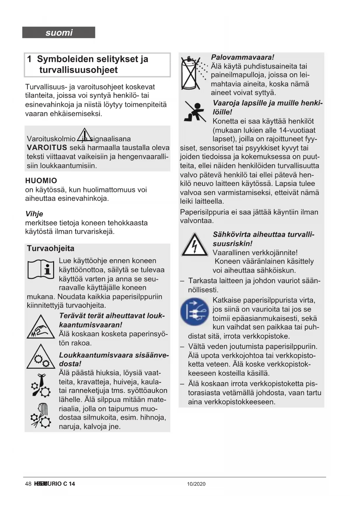 Vikt 4,0 kg 4,5 kg Eff ektbehov vid max. arkantal 160 W (EU) / 145 W (US) Emissionsljudtrycksnivå (tomgång / last) 55-60 dB(A) / 60-65 dB(A) 55-60 dB(A) / 65-70 dB(A) Inmatningsbredd 225 mm Skärhastighet 44 mm/s Anslutning 220-240 V / 50/60 Hz 110-130 V / 60 Hz Energiförbrukning i standby-läge < 2 Wh Drifttid upp till 15 min Omgivningsförhållande för drift: Temperatur Relative luftfuktighet Höjd över havet -10 °C till +25 °C max. 90 %, ej kondenserande max. 2 000 m Mått B x D x H (mm) 366 x 258 x 405 Behållarens volym 20 l A-vägd ljudeff ektnivå (LWAd på tomgång) 65,9 dB svenska48 SECURIO C 14 10/2020 1 Symboleiden selitykset ja turvallisuusohjeet Turvallisuus- ja varoitusohjeet koskevat tilanteita, joissa voi syntyä henkilö- tai esinevahinkoja ja niistä löytyy toimenpiteitä vaaran ehkäisemiseksi. Vihje merkitsee tietoja koneen tehokkaasta käytöstä ilman turvariskejä. Varoituskolmio ja signaalisana VAROITUS sekä harmaalla taustalla oleva teksti viittaavat vaikeisiin ja hengenvaaralli- siin loukkaantumisiin. HUOMIO on käytössä, kun huolimattomuus voi aiheuttaa esinevahinkoja. Turvaohjeita Lue käyttöohje ennen koneen käyttöönottoa, säilytä se tulevaa käyttöä varten ja anna se seu- raavalle käyttäjälle koneen mukana. Noudata kaikkia paperisilppuriin kiinnitettyjä turvaohjeita. Terävät terät aiheuttavat louk- kaantumisvaaran! Älä koskaan kosketa paperinsyö- tön rakoa. Loukkaantumisvaara sisäänve- dosta! Älä päästä hiuksia, löysiä vaat- teita, kravatteja, huiveja, kaula- tai ranneketjuja tms. syöttöaukon lähelle. Älä silppua mitään mate- riaalia, jolla on taipumus muo- dostaa silmukoita, esim. hihnoja, naruja, kalvoja jne. Palovammavaara! Älä käytä puhdistusaineita tai paineilmapulloja, joissa on lei- mahtavia aineita, koska nämä aineet voivat syttyä. Vaaroja lapsille ja muille henki- löille! Konetta ei saa käyttää henkilöt (mukaan lukien alle 14-vuotiaat lapset), joilla on rajoittuneet fyy- siset, sensoriset tai psyykkiset kyvyt tai joiden tiedoissa ja kokemuksessa on puut- teita, ellei näiden henkilöiden turvallisuutta valvo pätevä henkilö tai ellei pätevä hen- kilö neuvo laitteen käytössä. Lapsia tulee valvoa sen varmistamiseksi, etteivät nämä leiki laitteella. Paperisilppuria ei saa jättää käyntiin ilman valvontaa. Sähkövirta aiheuttaa turvalli- suusriskin! Vaarallinen verkkojännite! Koneen vääränlainen käsittely voi aiheuttaa sähköiskun. – Tarkasta laitteen ja johdon vauriot sään- nöllisesti. Katkaise paperisilppurista virta, jos siinä on vaurioita tai jos se toimii epäasianmukaisesti, sekä kun vaihdat sen paikkaa tai puh- distat sitä, irrota verkkopistoke. – Vältä veden joutumista paperisilppuriin. Älä upota verkkojohtoa tai verkkopisto- ketta veteen. Älä koske verkkopistok- keeseen kosteilla käsillä. – Älä koskaan irrota verkkopistoketta pis- torasiasta vetämällä johdosta, vaan tartu aina verkkopistokkeeseen. suomi10/2020 SECURIO C 14 49 3 Yleiskatsaus 4 Toimituksen sisältö