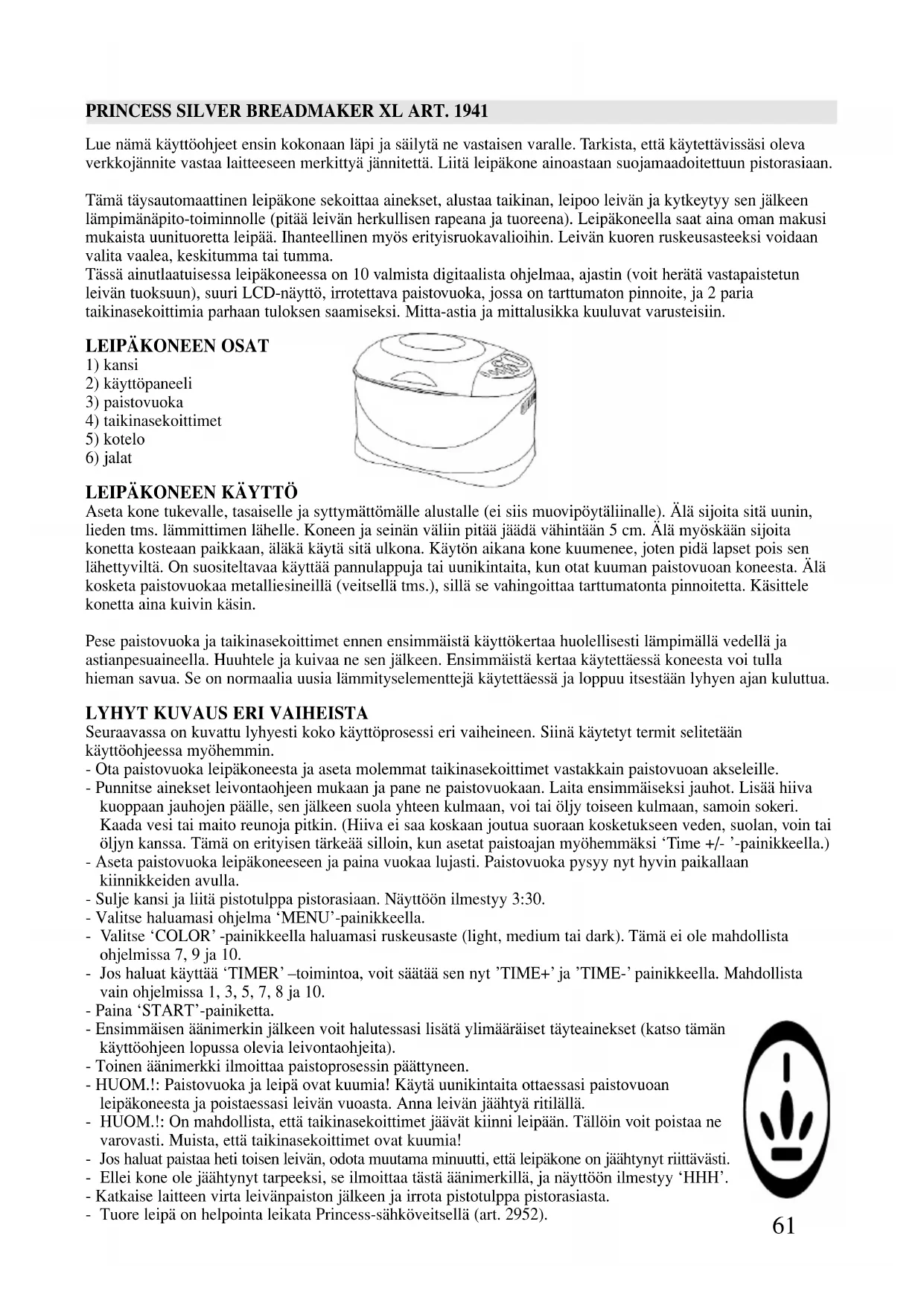 Seuraavassa on kuvattu lyhyesti koko käyttöprosessi eri vaiheineen. Siinä käytetyt termit selitetään käyttöohjeessa myöhemmin. - Ota paistovuoka leipäkoneesta ja aseta molemmat taikinasekoittimet vastakkain paistovuoan akseleille. - Punnitse ainekset leivontaohjeen mukaan ja pane ne paistovuokaan. Laita ensimmäiseksi jauhot. Lisää hiiva kuoppaan jauhojen päälle, sen jälkeen suola yhteen kulmaan, voi tai öljy toiseen kulmaan, samoin sokeri. Kaada vesi tai maito reunoja pitkin. (Hiiva ei saa koskaan joutua suoraan kosketukseen veden, suolan, voin tai öljyn kanssa. Tämä on erityisen tärkeää silloin, kun asetat paistoajan myöhemmäksi ‘Time +/- ’-painikkeella.) - Aseta paistovuoka leipäkoneeseen ja paina vuokaa lujasti. Paistovuoka pysyy nyt hyvin paikallaan kiinnikkeiden avulla. - Sulje kansi ja liitä pistotulppa pistorasiaan. Näyttöön ilmestyy 3:30. - Valitse haluamasi ohjelma ‘MENU’-painikkeella. - Valitse ‘COLOR’ -painikkeella haluamasi ruskeusaste (light, medium tai dark). Tämä ei ole mahdollista ohjelmissa 7, 9 ja 10. - Jos haluat käyttää ‘TIMER’ –toimintoa, voit säätää sen nyt ’TIME+’ ja ’TIME-’ painikkeella. Mahdollista vain ohjelmissa 1, 3, 5, 7, 8 ja 10. - Paina ‘START’-painiketta. - Ensimmäisen äänimerkin jälkeen voit halutessasi lisätä ylimääräiset täyteainekset (katso tämän käyttöohjeen lopussa olevia leivontaohjeita). - Toinen äänimerkki ilmoittaa paistoprosessin päättyneen. - HUOM.!: Paistovuoka ja leipä ovat kuumia! Käytä uunikintaita ottaessasi paistovuoan leipäkoneesta ja poistaessasi leivän vuoasta. Anna leivän jäähtyä ritilällä. - HUOM.!: On mahdollista, että taikinasekoittimet jäävät kiinni leipään. Tällöin voit poistaa ne varovasti. Muista, että taikinasekoittimet ovat kuumia! - Jos haluat paistaa heti toisen leivän, odota muutama minuutti, että leipäkone on jäähtynyt riittävästi. - Ellei kone ole jäähtynyt tarpeeksi, se ilmoittaa tästä äänimerkillä, ja näyttöön ilmestyy ‘HHH’. - Katkaise laitteen virta leivänpaiston jälkeen ja irrota pistotulppa pistorasiasta. - Tuore leipä on helpointa leikata Princess-sähköveitsellä (art. 2952).62