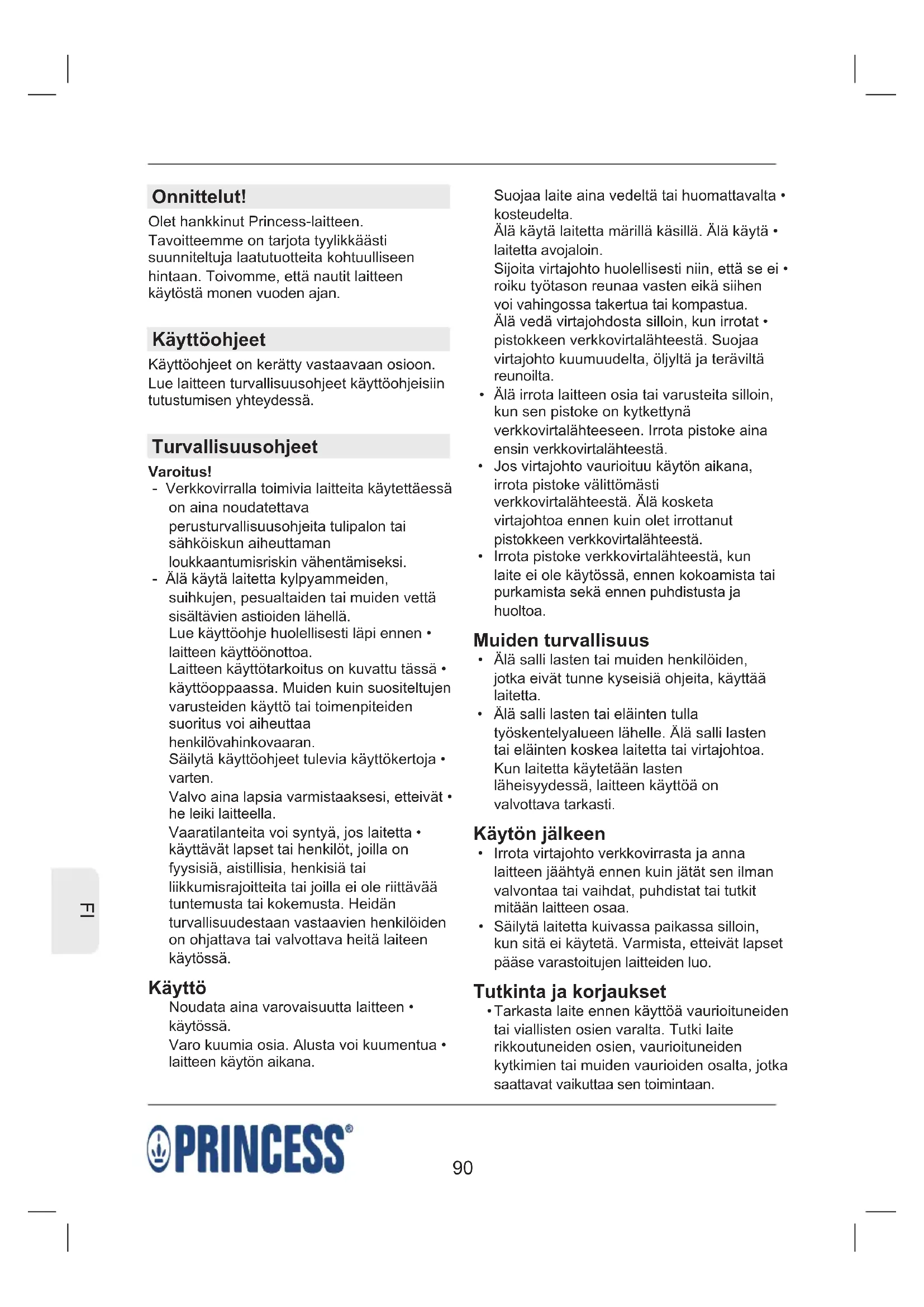 Onnittelut! Olet hankkinut Princess-laitteen. Tavoitteemme on tarjota tyylikkäästi suunniteltuja laatutuotteita kohtuulliseen hintaan. Toivomme, että nautit laitteen käytöstä monen vuoden ajan. Käyttöohjeet Käyttöohjeet on kerätty vastaavaan osioon. Lue laitteen turvallisuusohjeet käyttöohjeisiin tutustumisen yhteydessä. Turvallisuusohjeet Varoitus! - Verkkovirralla toimivia laitteita käytettäessä on aina noudatettava perusturvallisuusohjeita tulipalon tai sähköiskun aiheuttaman loukkaantumisriskin vähentämiseksi. - Älä käytä laitetta kylpyammeiden, suihkujen, pesualtaiden tai muiden vettä sisältävien astioiden lähellä. Lue käyttöohje huolellisesti läpi ennen • laitteen käyttöönottoa. Laitteen käyttötarkoitus on kuvattu tässä • käyttöoppaassa. Muiden kuin suositeltujen varusteiden käyttö tai toimenpiteiden suoritus voi aiheuttaa henkilövahinkovaaran. Säilytä käyttöohjeet tulevia käyttökertoja • varten. Valvo aina lapsia varmistaaksesi, etteivät • he leiki laitteella. Vaaratilanteita voi syntyä, jos laitetta • käyttävät lapset tai henkilöt, joilla on fyysisiä, aistillisia, henkisiä tai liikkumisrajoitteita tai joilla ei ole riittävää tuntemusta tai kokemusta. Heidän turvallisuudestaan vastaavien henkilöiden on ohjattava tai valvottava heitä laiteen käytössä. Käyttö Noudata aina varovaisuutta laitteen • käytössä. Varo kuumia osia. Alusta voi kuumentua • laitteen käytön aikana. Suojaa laite aina vedeltä tai huomattavalta • kosteudelta. Älä käytä laitetta märillä käsillä. Älä käytä • laitetta avojaloin. Sijoita virtajohto huolellisesti niin, että se ei • roiku työtason reunaa vasten eikä siihen voi vahingossa takertua tai kompastua. Älä vedä virtajohdosta silloin, kun irrotat • pistokkeen verkkovirtalähteestä. Suojaa virtajohto kuumuudelta, öljyltä ja teräviltä reunoilta. Älä irrota laitteen osia tai varusteita silloin, • kun sen pistoke on kytkettynä verkkovirtalähteeseen. Irrota pistoke aina ensin verkkovirtalähteestä. Jos virtajohto vaurioituu käytön aikana, • irrota pistoke välittömästi verkkovirtalähteestä. Älä kosketa virtajohtoa ennen kuin olet irrottanut pistokkeen verkkovirtalähteestä. Irrota pistoke verkkovirtalähteestä, kun • laite ei ole käytössä, ennen kokoamista tai purkamista sekä ennen puhdistusta ja huoltoa. Muiden turvallisuus Älä salli lasten tai muiden henkilöiden, • jotka eivät tunne kyseisiä ohjeita, käyttää laitetta. Älä salli lasten tai eläinten tulla • työskentelyalueen lähelle. Älä salli lasten tai eläinten koskea laitetta tai virtajohtoa. Kun laitetta käytetään lasten läheisyydessä, laitteen käyttöä on valvottava tarkasti. Käytön jälkeen Irrota virtajohto verkkovirrasta ja anna • laitteen jäähtyä ennen kuin jätät sen ilman valvontaa tai vaihdat, puhdistat tai tutkit mitään laitteen osaa. Säilytä laitetta kuivassa paikassa silloin, • kun sitä ei käytetä. Varmista, etteivät lapset pääse varastoitujen laitteiden luo. Tutkinta ja korjaukset Tarkasta laite ennen käyttöä vaurioituneiden • tai viallisten osien varalta. Tutki laite rikkoutuneiden osien, vaurioituneiden kytkimien tai muiden vaurioiden osalta, jotka saattavat vaikuttaa sen toimintaan.91