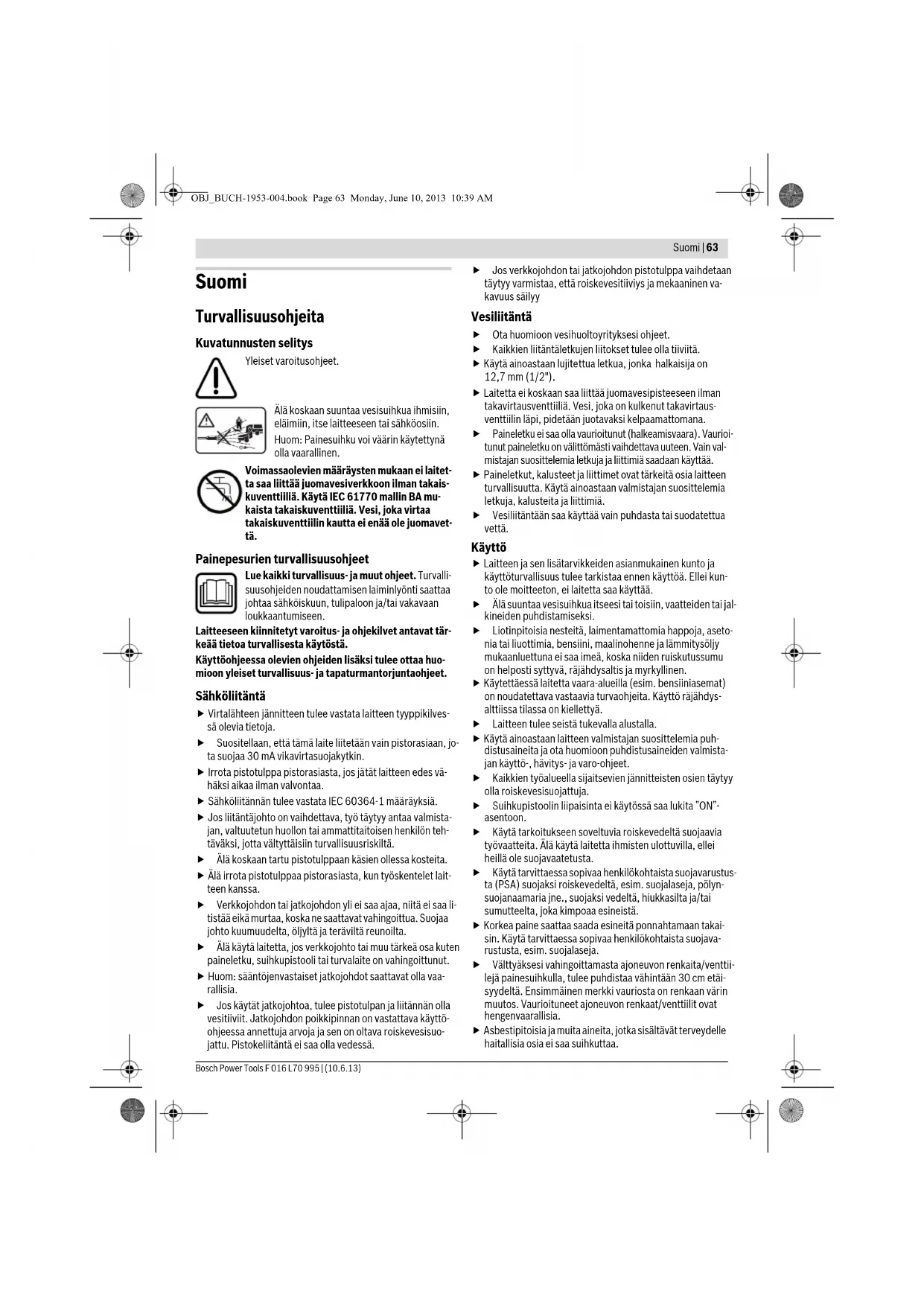 3 600 ... HA7 1.. HA7 2.. Vakuutamme yksin vastaavamme siitä, että kohdassa ”Tekniset tiedot” selostettu tuote vastaa seuraavia standardeja tai standardoituja asiakirjoja: EN 60335 direktiivien 2011/65/EU, 2004/108/EY, 2006/42/EY, 2000/14/EY määräysten mukaan. 2000/14/EY: Taattu äänen tehotaso Yhteensopivuuden arviointimenetelmä liitteen V mukaan. dB(A) 99 93 Henk Becker Executive Vice President Engineering Helmut Heinzelmann Head of Product Certification PT/ETM9 Tehtävä Kuva Vakiovarusteet 1 Käännä kahva alas 2 Suuttimen liitäntä suihkupistooliin 3 Paineletkun/suihkupistoolin liitäntä 4 Suuttimen kiinnitys 5 Vesiliitäntä 6 Käynnistys ja pysäytys 7 Suuttimen suihkun säätö 8 Pesuainepullon liitäntä 9 Puhdista suodatin 10 Puhdista suutin 11 Pistoolin säilytys 12 Pistoolin/putken/suuttimen säilytys käytön aikana 13 Aseta letku letkunpitimeen 14 Varastointi 15 Lisälaitteen valinta 16 Tehtävä Kuva OBJ_BUCH-1953-004.book Page 65 Monday, June 10, 2013 10:39 AM66 | Suomi F 016 L70 995 | (10.6.13) Bosch Power Tools Huomio: Jos käytät jatkojohtoa, on siinä – kuten turvaohjeis- sa on selostettu – oltava suojajohdin, joka pistotulpan kautta on yhteydessä verkon maadoitukseen. Kysy epävarmoissa tapauksissa sähkömieheltä tai lähimmäs- tä Bosch-sopimushuollosta. VAROITUS: Sääntöjenvastaiset jatkojohdot saattavat olla vaarallisia. Jatkojohdon, pisto- tulpan ja liittimen tulee olla vesitiiviitä ulko- käyttöön hyväksyttyä mallia. Johdon liitoskohtien tulee olla kuivat eivätkä ne saa maata maassa. Käytä turvallisuuden parantamiseksi FI-kytkintä (RCD), jonka vikavirta on korkeintaan 30 mA. Tarkista tätä FI-kytkintä en- nen jokaista käyttöä. Jos liitäntäjohto on vahingoittunut, sen saa korjata vain Bosch-sopimushuolto. Ohjeita tuotteille, joita ei myydä Iso-Britanniassa: HUOMIO: Turvallisuutesi takia on välttämätöntä, että konees- sa oleva pistoke liitetään jatkojohtoon. Jatkojohdon liitännän täytyy olla roiskevesisuojattu, olla kumista tai kumipinnoitet- tu. Jatkojohdossa on oltava vedonpoistin. Ota huomioon, että laitetta ei saa käyttää ilman vettä. Käyttö Käynnistys Liitä vesiletku (ei kuulu toimitukseen) veden tulopisteeseen ja laitteeseen. Varmista, että käynnistyskytkin on asennossa ”0” ja liitä laite verkkopistorasiaan. Avaa vesihana. Paina käynnistysvarmistinta (pistoolinkahvan taempi kytkin) liipaisimen vapauttamiseksi. Paina liipaisin pohjaan asti, kunnes vesi virtaa tasaisesti, eikä laitteessa tai paineletkussa enää ole ilmaa. Päästä liipaisin vapaaksi. Paina käynnistysvar- mistinta (pistoolinkahvan etumaisempi kytkin). Kierrä verkkokytkintä. Suuntaa suihkupistooli alaspäin. Paina käynnistysvarmistinta, jotta liipaisin vapautuu. Paina liipaisin- ta pohjaan. Autostop-toiminta Laitteen moottori pysähtyy heti, kun pistoolikahvassa olevaa liipaisinta vapautetaan. Työskentelyohjeita Yleistä Varmista, että painepesuri seisoo tasaisella alustalla. Älä siirrä paineletkua liian kauas äläkä vedä painepesuria pai- neletkusta. Tämä saattaa johtaa siihen, että painepesuri ei enää seiso tukevasti vaan kaatuu. Älä taita paineletkua äläkä aja sen yli ajoneuvolla. Suojaa pai- neletkua teräviltä reunoilta ja kulmilta. Älä käytä tehosuutinta auton pesuun. Varoitus! Parvekepesuri (Patio Cleaners) on tarkoitettu käy- tettäväksi vain tasaisilla pinnoilla! Älä käytä sitä portaissa tai pystysuorissa pinnoissa. Älä koskaan kosketa tehosuutinta, sen ollessa käytössä. Työskentelyohjeita työskentelyyn puhdistusaineiden kanssa Käytä ainoastaan puhdistusaineita, jotka on tarkoitet- tu nimenomaan painepesuria varten. Suosittelemme käyttämään puhdistusainetta säästeliäästi ympäristönsuojelun takia. Noudata säiliöön merkityt laimen- nussuositukset. Suositeltu puhdistusmenetelmä Vaihe 1: Lian irrotus Käytä 3-toimisuuttimen vaahtoasetusta ja annostele puhdis- tusainetta säästeliäästi. Vaihe 2: lian poisto Poista liuotettu lika suurella paineella. Huomio: Aloita alhaalta ja työskentele ylöspäin pystysuoria pintoja puhdistettaessa puhdistusainetta käyttäen. Huuhtele työskentelemällä ylhäältä alaspäin. Vianetsintä Vian oire Mahdolliset vikalähteet Korjaus Moottori ei käynnisty Pistotulppaa ei olla liitetty pistorasiaan Liitä pistotulppa pistorasiaan Pistorasia on viallinen Käytä toista pistorasiaa Sulake on lauennut Vaihda sulake Jatkojohto on vaurioitunut Kokeile ilman jatkojohtoa Moottorin suojakytkin on lauennut Anna moottorin jäähtyä 15 min. Jäätynyt Anna pumpun, vesiletkun tai lisätarvik- keen sulata Moottori pysähtyy Sulake on lauennut Vaihda sulake Verkkojännite on väärä Tarkista verkkojännite, sen tulee vastata tyyppikilven merkintää Moottorin suojakytkin on lauennut Anna moottorin jäähtyä 15 min. OBJ_BUCH-1953-004.book Page 66 Monday, June 10, 2013 10:39 AMSuomi | 67 Bosch Power Tools F 016 L70 995 | (10.6.13) Hoito ja huolto Huolto Irrota pistotulppa pistorasiasta ja veden tuloletku vesi- liitännästä ennen kaikkia töitä. Huomio: Suorita seuraavat huoltotoimenpiteet säännöllises- ti, takaaksesi pitkän ja luotettavan käyttöajan. Tarkista säännöllisesti, ettei laitteessa ole ilmeisiä puutteita, kuten irtonainen liitos ja kuluneet tai vaurioituneet osat. Tarkista, että suojukset ja suojalaitteet ovat kunnossa ja oi- kein asennettu. Suorita mahdolliset huolto- ja korjaustyöt en- nen käyttöä. Jos sähkölaitteessa, huolellisesta valmistuksesta ja koestus- menettelystä huolimatta esiintyy vikaa, tulee korjaus antaa Bosch sopimushuollon tehtäväksi. Ilmoita kaikissa kyselyissä ja varaosatilauksissa 10-numeroi- nen tuotenumero, joka löytyy sähkölaitteen mallikilvestä. Käytön jälkeen/säilytys Kytke käynnistyskytkin pois päältä ja paina liipaisinta paine- letkun tyhjentämiseksi. Puhdista painepesuri ulkoa pehmeällä harjalla ja rievulla. Vet- tä, liuotinta tai kiillotusainetta ei saa käyt