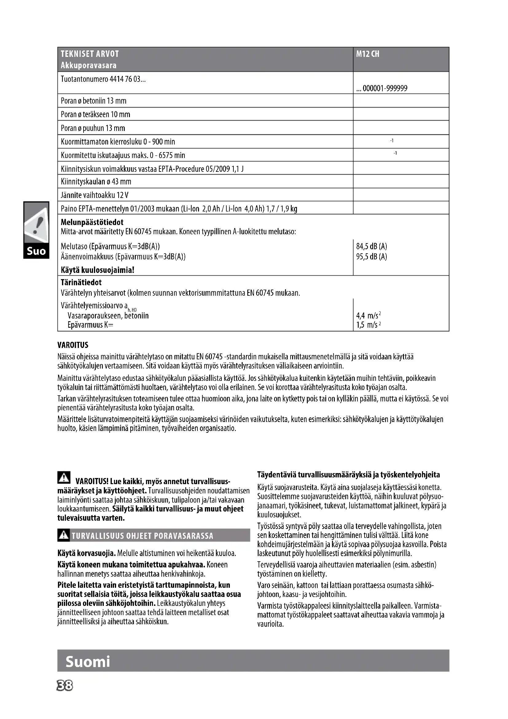Käytä korvasuojia. Melulle altistuminen voi heikentää kuuloa. Käytä koneen mukana toimitettua apukahvaa. Koneen hallinnan menetys saattaa aiheuttaa henkivahinkoja. Pitele laitetta vain eristetyistä tarttumapinnoista, kun suoritat sellaisia töitä, joissa leikkaustyökalu saattaa osua piilossa oleviin sähköjohtoihin. Leikkaustyökalun yhteys jännitteelliseen johtoon saattaa tehdä laitteen metalliset osat jännitteellisíksi ja aiheuttaa sähköiskun. Täydentäviä turvallisuusmääräyksiä ja työskentelyohjeita Käytä suojavarusteita. Käytä aina suojalaseja käyttäessäsi konetta. Suosittelemme suojavarusteiden käyttöä, näihin kuuluvat pölysuo- janaamari, työkäsineet, tukevat, luistamattomat jalkineet, kypärä ja kuulosuojukset. Työstössä syntyvä pöly saattaa olla terveydelle vahingollista, joten sen koskettaminen tai hengittäminen tulisi välttää. Liitä kone kohdeimujärjestelmään ja käytä sopivaa pölysuojaa kasvoilla. Poista laskeutunut pöly huolellisesti esimerkiksi pölynimurilla. Terveydellisiä vaaroja aiheuttavien materiaalien (esim. asbestin) työstäminen on kielletty. Varo seinään, kattoon tai lattiaan porattaessa osumasta sähkö- johtoon, kaasu- ja vesijohtoihin. Varmista työstökappaleesi kiinnityslaitteella paikalleen. Varmista- mattomat työstökappaleet saattavat aiheuttaa vakavia vammoja ja vaurioita. TEKNISET ARVOT Akkuporavasara M12 CH Tuotantonumero 4414 76 03... ... 000001-999999 Poran ø betoniin 13 mm Poran ø teräkseen 10 mm Poran ø puuhun 13 mm Kuormittamaton kierrosluku 0 - 900 min