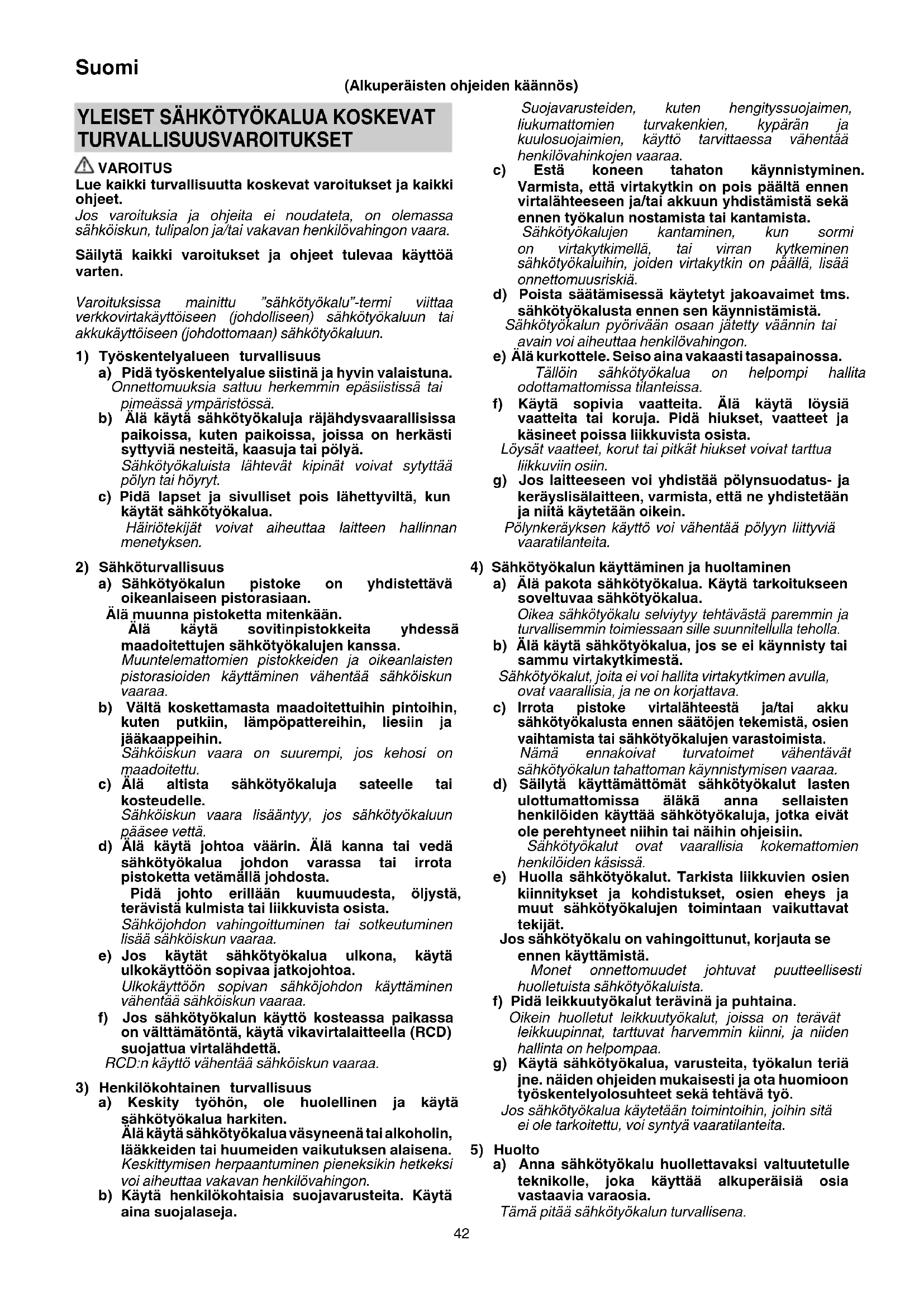 TURVALLISUUSVAROITUKSET VAROITUS Lue kaikki turvallisuutta koskevat varoitukset ja kaikki ohjeet. Jos varoituksia ja ohjeita ei noudateta, on olemassa sähköiskun, tulipalon ja/tai vakavan henkilövahingon vaara. Säilytä kaikki varoitukset ja ohjeet tulevaa käyttöä varten. Varoituksissa mainittu ”sähkötyökalu”-termi viittaa verkkovirtakäyttöiseen (johdolliseen) sähkötyökaluun tai akkukäyttöiseen (johdottomaan) sähkötyökaluun.