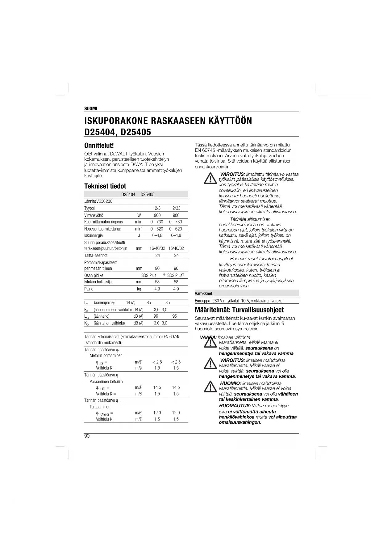 D25404, D25405 Tässä tiedotteessa annettu tärinäarvo on mitattu EN 60745 -määräyksen mukaisen standardoidun testin mukaan. Arvon avulla työkaluja voidaan verrata toisiinsa. Sitä voidaan käyttää altistumisen ennakkoarviointiin. VAROITUS: Ilmoitettu tärinäarvo vastaa työkalun pääasiallisia käyttösovelluksia. Jos työkalua käytetään muihin sovelluksiin, eri lisävarusteiden kanssa tai huonosti huollettuna, tärinäarvot saattavat muuttua. Tämä voi merkittävästi vähentää kokonaistyöjakson aikaista altistustasoa. Tärinälle altistumisen ennakkoarvioinnissa on otettava huomioon ajat, jolloin työkalun virta on katkaistu, sekä ajat, jolloin työkalu on käynnissä, mutta sillä ei työskennellä. Tämä voi merkittävästi vähentää kokonaistyöjakson aikaista altistustasoa. Huomioi muut turvatoimenpiteet käyttäjän suojelemiseksi tärinän vaikutukselta, kuten: työkalun ja lisävarusteiden huolto, käsien pitäminen lämpiminä ja työjärjestyksen organisoiminen. Varokkeet: Eurooppa 230 V:n työkalut 10 A, verkkovirran varoke Määritelmät: Turvallisuusohjeet Seuraavat määritelmät kuvaavat kunkin avainsanan vakavuusastetta. Lue tämä ohjekirja ja kiinnitä huomiota seuraaviin symboleihin: VAARA: Ilmaisee välitöntä vaaratilannetta. Mikäli vaaraa ei voida välttää, seurauksena on hengenmenetys tai vakava vamma. VAROITUS: Ilmaisee mahdollista vaaratilannetta. Mikäli vaaraa ei voida välttää, seurauksena voi olla hengenmenetys tai vakava vamma. HUOMIO: Ilmaisee mahdollista vaaratilannetta. Mikäli vaaraa ei voida välttää, seurauksena voi olla vähäinen tai keskinkertainen vamma. HUOMAUTUS: Viittaa menettelyyn, joka ei välttämättä aiheuta henkilövahinkoa mutta voi aiheuttaa omaisuusvahingon. Onnittelut! Olet valinnut DEWALT-työkalun. Vuosien kokemuksen, perusteellisen tuotekehittelyn ja innovaation ansiosta D EWALT on yksi luotettavimmista kumppaneista ammattityökalujen käyttäjille. Tekniset tiedot D25404 D25405 Jännite V 230 230 Tyyppi 2/3 2/33 Virransyöttö W 900 900 Kuormittamaton nopeus min
