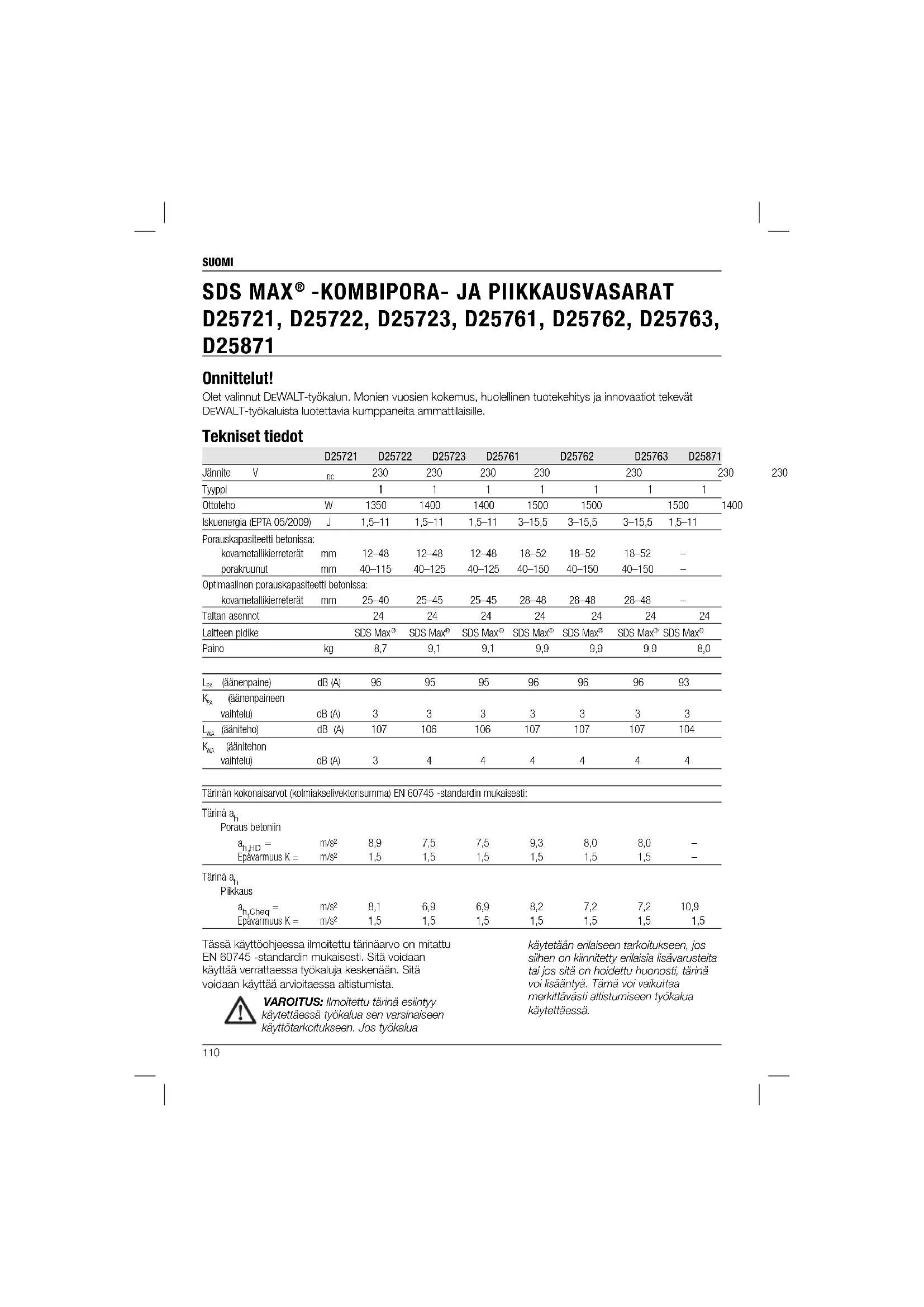 D25721, D25722, D25723, D25761, D25762, D25763, D25871 Onnittelut! Olet valinnut DEWALT-työkalun. Monien vuosien kokemus, huolellinen tuotekehitys ja innovaatiot tekevät DEWALT-työkaluista luotettavia kumppaneita ammattilaisille. Tekniset tiedot D25721 D25722 D25723 D25761 D25762 D25763 D25871 Jännite V