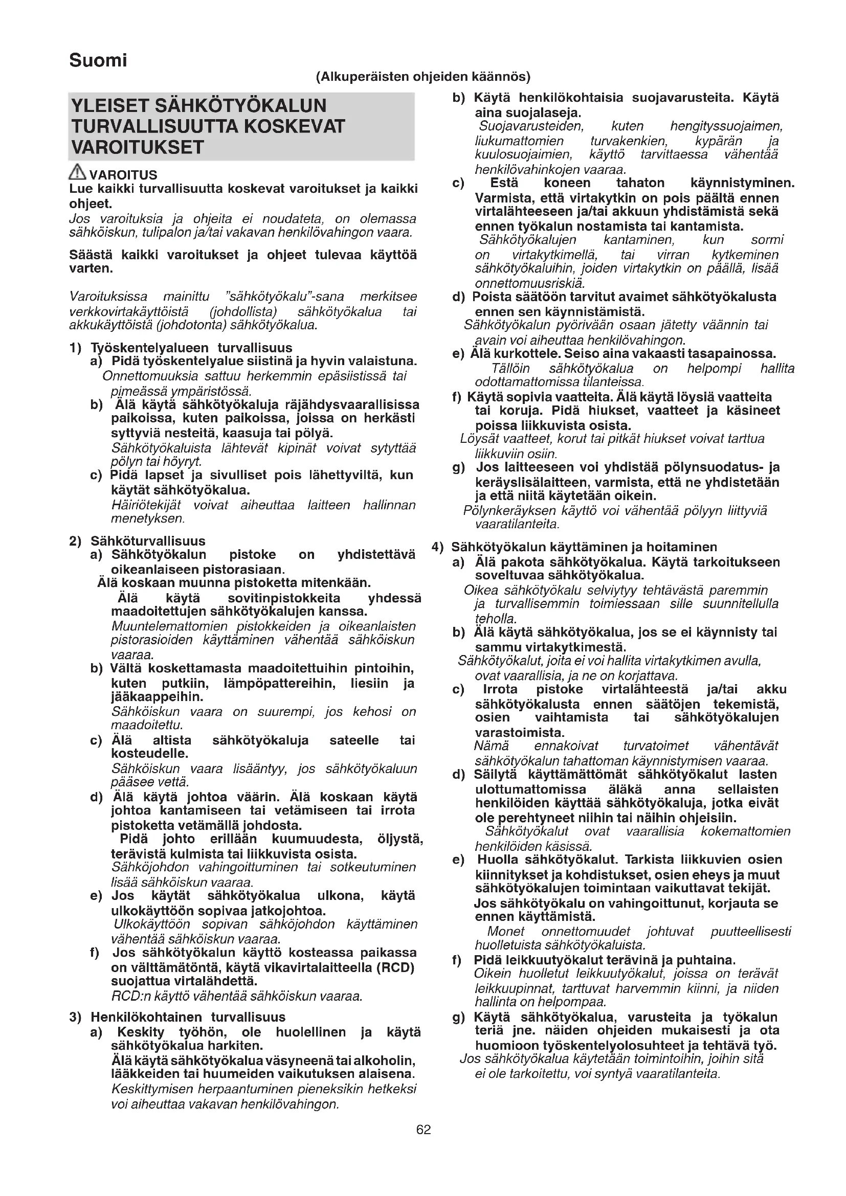 TURVALLISUUTTA KOSKEVAT VAROITUKSET VAROITUS Lue kaikki turvallisuutta koskevat varoitukset ja kaikki ohjeet. Jos varoituksia ja ohjeita ei noudateta, on olemassa sähköiskun, tulipalon ja/tai vakavan henkilövahingon vaara. Säästä kaikki varoitukset ja ohjeet tulevaa käyttöä varten. Varoituksissa mainittu ”sähkötyökalu”-sana merkitsee verkkovirtakäyttöistä (johdollista) sähkötyökalua tai akkukäyttöistä (johdotonta) sähkötyökalua.