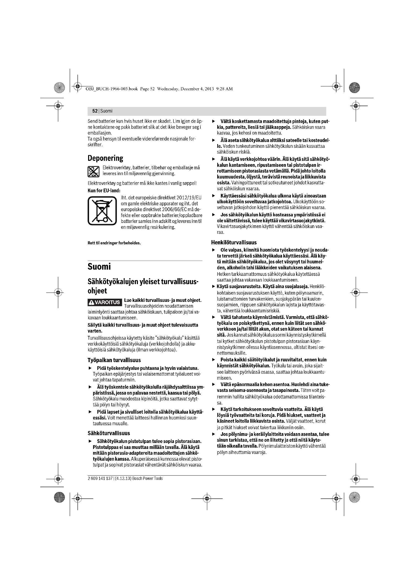 Valg av tilbehør – 163 OBJ_BUCH-1966-003.book Page 51 Wednesday, December 4, 2013 9:28 AM52 | Suomi 2 609 141 137 | (4.12.13) Bosch Power Tools Send batterier kun hvis huset ikke er skadet. Lim igjen de åp- ne kontaktene og pakk batteriet slik at det ikke beveger seg i emballasjen. Ta også hensyn til eventuelle videreførende nasjonale for- skrifter. Deponering Elektroverktøy, batterier, tilbehør og emballasje må leveres inn til miljøvennlig gjenvinning. Elektroverktøy og batterier må ikke kastes i vanlig søppel! Kun for EU-land: Iht. det europeiske direktivet 2012/19/EU om gamle elektriske apparater og iht. det europeiske direktivet 2006/66/EC må de- fekte eller oppbrukte batterier/oppladbare batterier samles inn adskilt og leveres inn til en miljøvennlig resirkulering. Rett til endringer forbeholdes. Suomi Sähkötyökalujen yleiset turvallisuus- ohjeet Lue kaikki turvallisuus- ja muut ohjeet. Turvallisuusohjeiden noudattamisen laiminlyönti saattaa johtaa sähköiskuun, tulipaloon ja/tai va- kavaan loukkaantumiseen. Säilytä kaikki turvallisuus- ja muut ohjeet tulevaisuutta varten. Turvallisuusohjeissa käytetty käsite ”sähkötyökalu” käsittää verkkokäyttöisiä sähkötyökaluja (verkkojohdolla) ja akku- käyttöisiä sähkötyökaluja (ilman verkkojohtoa). Työpaikan turvallisuus Pidä työskentelyalue puhtaana ja hyvin valaistuna. Työpaikan epäjärjestys tai valaisemattomat työalueet voi- vat johtaa tapaturmiin. Älä työskentele sähkötyökalulla räjähdysalttiissa ym- päristössä, jossa on palavaa nestettä, kaasua tai pölyä. Sähkötyökalu muodostaa kipinöitä, jotka saattavat sytyt- tää pölyn tai höyryt. Pidä lapset ja sivulliset loitolla sähkötyökalua käyttä- essäsi. Voit menettää laitteesi hallinnan huomiosi suun- tautuessa muualle. Sähköturvallisuus Sähkötyökalun pistotulpan tulee sopia pistorasiaan. Pistotulppaa ei saa muuttaa millään tavalla. Älä käytä mitään pistorasia-adaptereita maadoitettujen sähkö- työkalujen kanssa. Alkuperäisessä kunnossa olevat pisto- tulpat ja sopivat pistorasiat vähentävät sähköiskun vaaraa. Vältä koskettamasta maadoitettuja pintoja, kuten put- kia, pattereita, liesiä tai jääkaappeja. Sähköiskun vaara kasvaa, jos kehosi on maadoitettu. Älä aseta sähkötyökalua alttiiksi sateelle tai kosteudel- le. Veden tunkeutuminen sähkötyökalun sisään kasvattaa sähköiskun riskiä. Älä käytä verkkojohtoa väärin. Älä käytä sitä sähkötyö- kalun kantamiseen, ripustamiseen tai pistotulpan ir- rottamiseen pistorasiasta vetämällä. Pidä johto loitolla kuumuudesta, öljystä, terävistä reunoista ja liikkuvista osista. Vahingoittuneet tai sotkeutuneet johdot kasvatta- vat sähköiskun vaaraa. Käyttäessäsi sähkötyökalua ulkona käytä ainoastaan ulkokäyttöön soveltuvaa jatkojohtoa. Ulkokäyttöön so- veltuvan jatkojohdon käyttö pienentää sähköiskun vaaraa. Jos sähkötyökalun käyttö kosteassa ympäristössä ei ole vältettävissä, tulee käyttää vikavirtasuojakytkintä. Vikavirtasuojakytkimen käyttö vähentää sähköiskun vaa- raa. Henkilöturvallisuus Ole valpas, kiinnitä huomiota työskentelyysi ja nouda- ta tervettä järkeä sähkötyökalua käyttäessäsi. Älä käy- tä mitään sähkötyökalua, jos olet väsynyt tai huumei- den, alkoholin tahi lääkkeiden vaikutuksen alaisena. Hetken tarkkaamattomuus sähkötyökalua käytettäessä saattaa johtaa vakavaan loukkaantumiseen. Käytä suojavarusteita. Käytä aina suojalaseja. Henkilö- kohtaisen suojavarustuksen käyttö, kuten pölynaamarin, luistamattomien turvakenkien, suojakypärän tai kuulon- suojaimien, riippuen sähkötyökalun lajista ja käyttötavas- ta, vähentää loukkaantumisriskiä. Vältä tahatonta käynnistämistä. Varmista, että sähkö- työkalu on poiskytkettynä, ennen kuin liität sen sähkö- verkkoon ja/tai liität akun, otat sen käteen tai kannat sitä. Jos kannat sähkötyökalua sormi käynnistyskytkimellä tai kytket sähkötyökalun pistotulpan pistorasiaan käyn- nistyskytkimen ollessa käyntiasennossa, altistat itsesi on- nettomuuksille. Poista kaikki säätötyökalut ja ruuvitaltat, ennen kuin käynnistät sähkötyökalun. Työkalu tai avain, joka sijait- see laitteen pyörivässä osassa, saattaa johtaa loukkaantu- miseen. Vältä epänormaalia kehon asentoa. Huolehdi aina tuke- vasta seisoma-asennosta ja tasapainosta. Täten voit pa- remmin hallita sähkötyökalua odottamattomissa tilanteis- sa. Käytä tarkoitukseen soveltuvia vaatteita. Älä käytä löysiä työvaatteita tai koruja. Pidä hiukset, vaatteet ja käsineet loitolla liikkuvista osista. Väljät vaatteet, korut ja pitkät hiukset voivat takertua liikkuviin osiin. Jos pölynimu- ja keräilylaitteita voidaan asentaa, tulee sinun tarkistaa, että ne on liitetty ja että niitä käyte- tään oikealla tavalla. Pölynimulaitteiston käyttö vähentää pölyn aiheuttamia vaaroja. VAROITUS OBJ_BUCH-1966-003.book Page 52 Wednesday, December 4, 2013 9:28 AMSuomi | 53 Bosch Power Tools 2 609 141 137 | (4.12.13) Sähkötyökalujen huolellinen käyttö ja käsittely Älä ylikuormita laitetta. Käytä kyseiseen työhön tarkoi- tettua sähkötyökalua. Sopivaa sähkötyökalua käyttäen työskentelet paremmin ja varmemmin tehoalueella, jolle sähkötyökalu on tarkoitettu. Älä käytä sähkötyökalua, jota ei voida käynnistää ja py- säyttää käynnistyskytkimestä. Sähkötyökalu, jota ei enää voida käynnistää ja pysäyttää käynnistyskytkimellä, on vaarallinen ja se täytyy korjata. Irrota pistotulppa pistorasiasta, ennen kuin suoritat säätöjä, vaihdat tarvikkeita tai siirrät sähkötyökalun varastoitavaksi. Nämä turvatoimenpiteet estävät sähkö- työkalun tahattoman käynnistyksen. Säilytä sähkötyökalut poissa lasten ulottuvilta, kun nii- tä ei käytetä. Älä anna sellaisten henkilöiden käyttää sähkötyökalua, jotka eivät tunne sitä 
