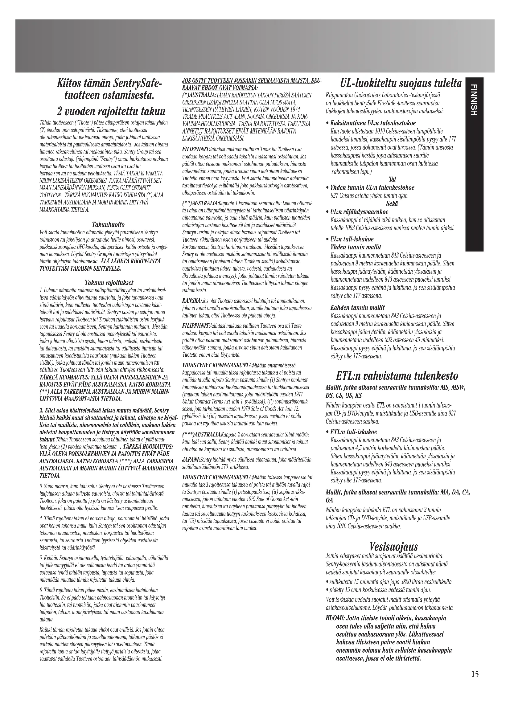ANNETUT RAJOITUKSET EIVÄT MITENKÄÄN RAJOITA LAKISÄÄTEISIÄ OIKEUKSIASI. FILIPPIINIT: Valintasi mukaan viallinen Tuote tai Tuotteen osa voidaan korjata tai voit saada takaisin maksamasi ostohinnan. Jos päätät ottaa vastaan maksamasi ostohinnan palautuksen, hinnasta vähennetään summa, jonka arvosta sinun katsotaan kuluttaneen Tuotetta ennen vian löytymistä. Voit saada takuupalvelua antamalla tarvittavat tiedot ja esittämällä joko pakkauskartongin ostotositteen, alkuperäisen ostokuitin tai takuukortin. (**)AUSTRALIA: Kappale 1 korvataan seuraavalla: Lukuun ottamat- ta vakavan välinpitämättömyyden tai tarkoituksellisen väärinkäytön aiheuttamia vaurioita, ja vain siinä määrin, kuin viallisten tuotteiden valmistajan vastuuta käsittelevät lait ja säädökset määräävät, Sentryn vastuu ja ostajan ainoa korvaus rajoittuvat Tuotteen tai Tuotteen rikkinäisten osien korjaukseen tai uudella korvaamiseen, Sentryn harkinnan mukaan. Missään tapauksessa Sentry ei ole vastuussa mistään satunnaisista tai välillisistä ihmisiin tai omaisuuteen (mukaan lukien Tuotteen sisältö) kohdistuvista vaurioista (mukaan lukien tulesta, vedestä, varkaudesta tai ilkivallasta johtuva menetys), jotka johtuvat tämän rajoitetun takuun tai jonkin muun nimenomaisen Tuotteeseen liittyvän takuun ehtojen rikkomisesta. RANSKA: Jos olet Tuotetta ostaessasi kuluttaja tai ammattilainen, joka ei toimi omalla erikoisalallaan, sinulle taataan joka tapauksessa laillinen takuu, ettei Tuotteessa ole piileviä vikoja. FILIPPIINIT: Valintasi mukaan viallinen Tuotteen osa tai Tuote voidaan korjata tai voit saada takaisin maksamasi ostohinnan. Jos päätät ottaa vastaan maksamasi ostohinnan palautuksen, hinnasta vähennetään summa, jonka arvosta sinun katsotaan kuluttaneen Tuotetta ennen vian löytymistä. YHDISTYNYT KUNINGASKUNTA: Mikään ensimmäisessä kappaleessa tai muualla tässä rajoitetussa takuussa ei poista tai millään tavalla rajoita Sentryn vastuuta sinulle (i) Sentryn huolimat- tomuudesta johtuvassa kuolemantapauksessa tai loukkaantumisessa (mukaan lukien huolimattomuus, joka määritellään vuoden 1977 Unfair Contract Terms Act -lain 1. pykälässä), (ii) sopimusrikkomuk- sessa, jota tarkoitetaan vuoden 1979 Sale of Goods Act -lain 12. pykälässä, tai (iii) missään tapauksessa, jossa vastuuta ei voida poistaa tai rajoittaa asiasta määräävän lain vuoksi. (***)AUSTRALIA: Kappale 2 korvataan seuraavalla: Siinä määrin kuin laki sen sallii, Sentry kieltää kaikki muut sitoutumiset ja takuut, olivatpa ne kirjallisia tai suullisia, nimenomaisia tai välillisiä. JAPANI: Sentry kieltää myös välillisen vikatakuun, joka määritellään siviililainsäädännön 570. artiklassa. YHDISTYNYT KUNINGASKUNTA: Mikään toisessa kappaleessa tai muualla tässä rajoitetussa takuussa ei poista tai millään tavalla rajoi- ta Sentryn vastuuta sinulle (i) petostapauksissa, (ii) sopimusrikko- muksessa, johon viitataan vuoden 1979 Sale of Goods Act -lain nimikettä, kuvauksen tai näytteen paikkansa pitävyyttä tai tuotteen laatua tai soveltuvuutta tiettyyn tarkoitukseen koskevissa kohdissa, tai (iii) missään tapauksessa, jossa vastuuta ei voida poistaa tai rajoittaa asiasta määräävän lain vuoksi. UL-luokiteltu suojaus tulelta Riippumaton Underwriters Laboratories -testausjärjestö on luokitellut SentrySafe Fire-Safe -tuotteesi seuraavien tiukkojen tulenkestävyyden vaatimustasojen mukaiseksi: